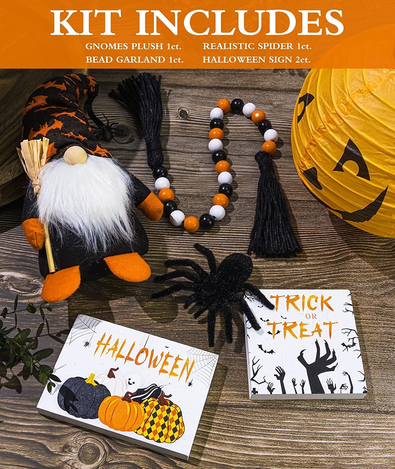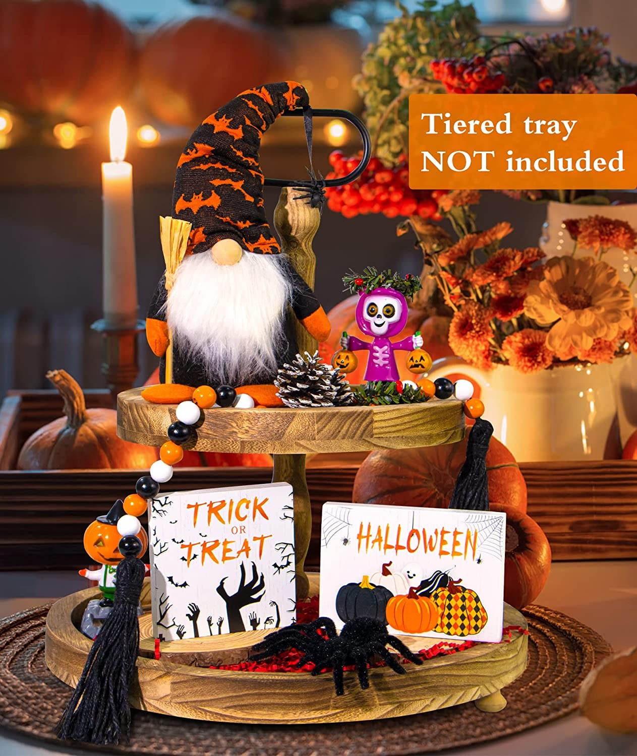 ?【Tiered Tray Decor Set】5 PCS exquisitely matched tray decorations: 1PC gnome plush doll, 1PC wooden bead garland with tassels, 1PC simulation nylon flocking spider, 1PC wooden pumpkin sign, and 1PC "TRICK or TREAT" wooden sign. Please NOTICE: that the tiered wooden tray is not included. ?【High Hardness Parts】The gnome tiered tray decor is made of soft felt and fiber beards, delicate and sturdy. Two Halloween signs and bead garland are made of natural wood, having high hardness, delicate patterns, and a smooth surface. The highly simulated spider is very realistic (A few srands of hair loss are normal). ?【Versatile Decorations】This Halloween tiered tray decor can be used in many ways from Halloween to art galleries, office receptions, props for school projects, and even backgrounds for photos. Will be able to be reused for future occasions or projects if treated well. ?【Perfect Halloween Decoration】The tiered tray decor set will be able to be used as table centerpieces, hung on walls, shelves, etc. This tray decoration set is filled with Halloween colors. The classic orange, black and white combination, is very easy to match and creates a strong Halloween atmosphere. ?【Safe and Sound】Delicate and ingenious design that most people will like. Halloween tiered tray decoration makes a great gift for Halloween, Christmas, and Thanksgiving Day, but also for housewarmings, birthdays, and more. In addition, for any quality problems, we will serve you 24 hours a day and ensure your enjoyment!