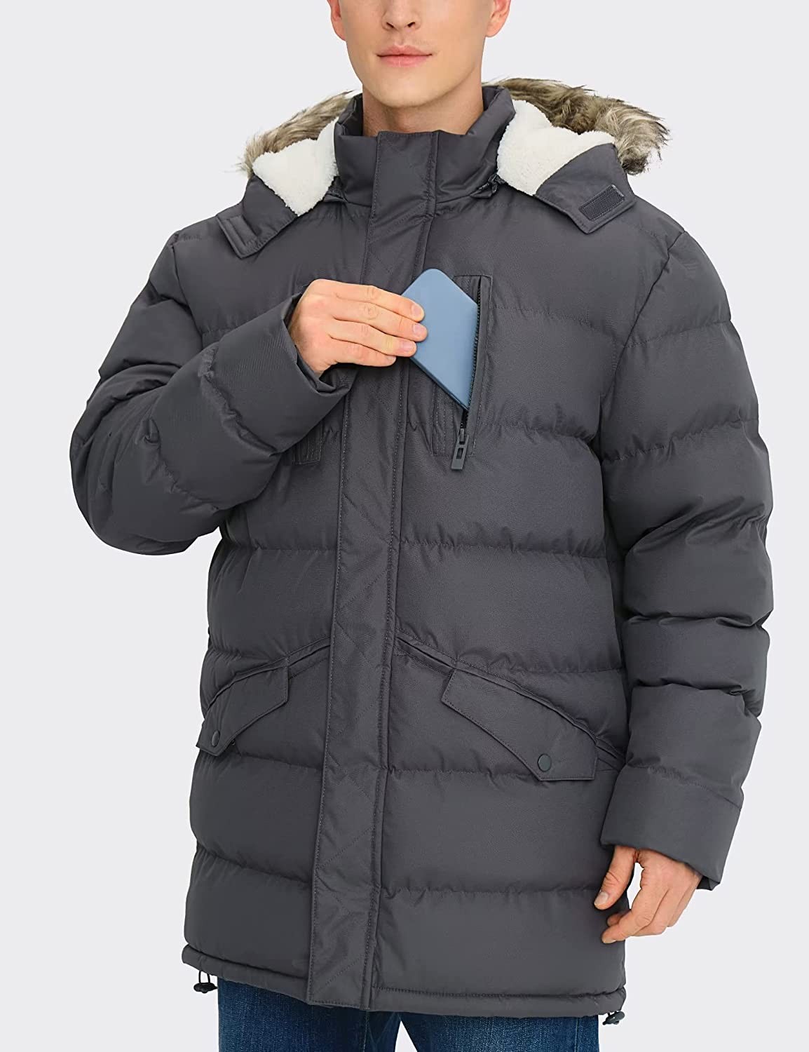 Polyester Imported Zipper closure Machine Wash 【Water Resistant】Water-Repellent shell fights bad rainy or misty weather, keep your body dry and comfortable. 【Mid-Length Coats】Medium length coats for better coverage and heat retention to keep you warm and stylish. 【Excellent Thermal Insulation】Mens winter coats quilted with thicken cotton and lambswool fleece lined for added warmth and come with high-quality windbreak fabric which is smooth to the touch. 【Functional Pockets】2 side pockets,2 zipper pockets and 1 inner hidden pocket to keep personal stuff safe and hands warm. Windproof hood with drawcord and stand collar can be adjusted for a customized fit. 【OCCASION】Perfect for casual daily wear, work, travelling, hiking, camping, skiing, snowboarding and other outdoor sports activities in winter or cold weather.