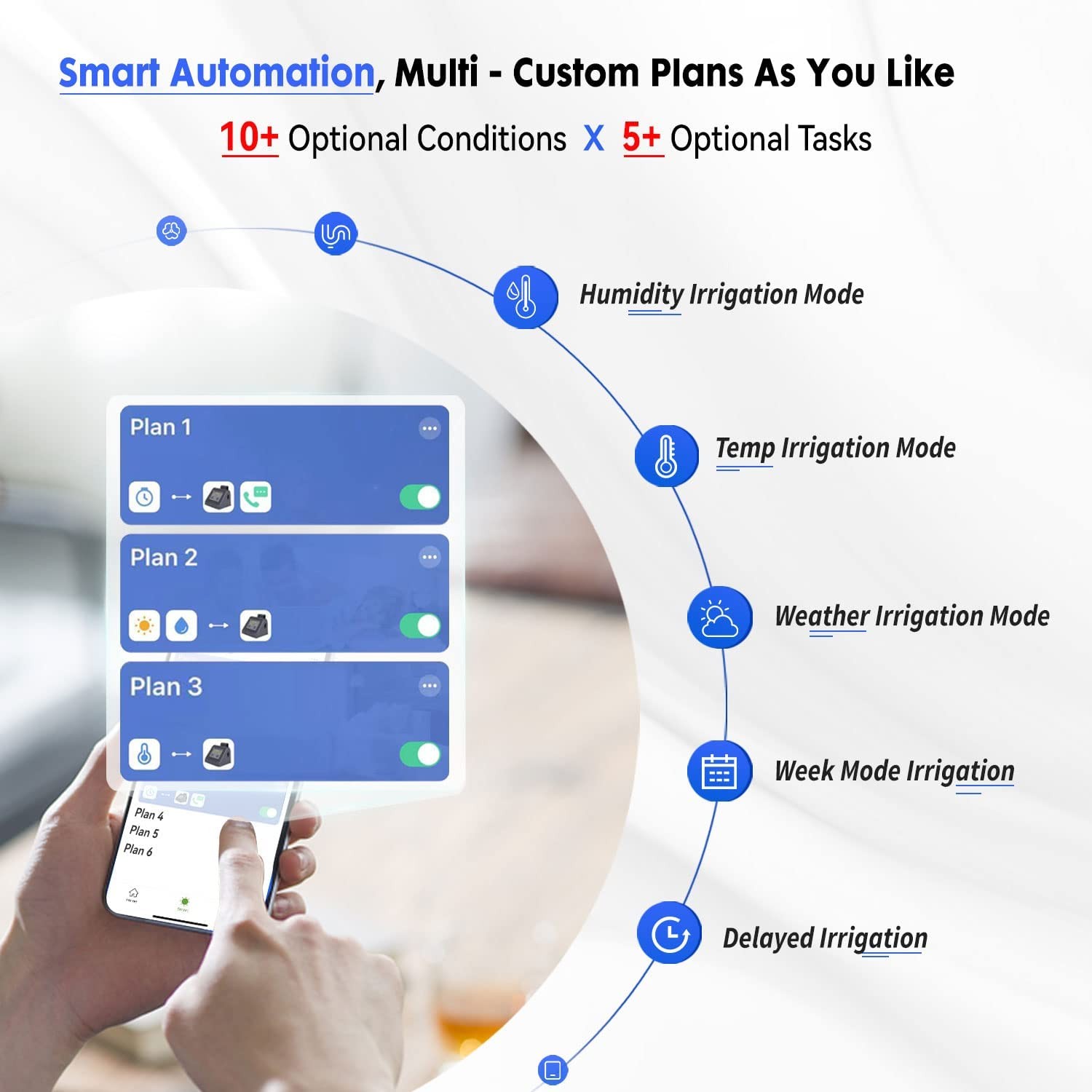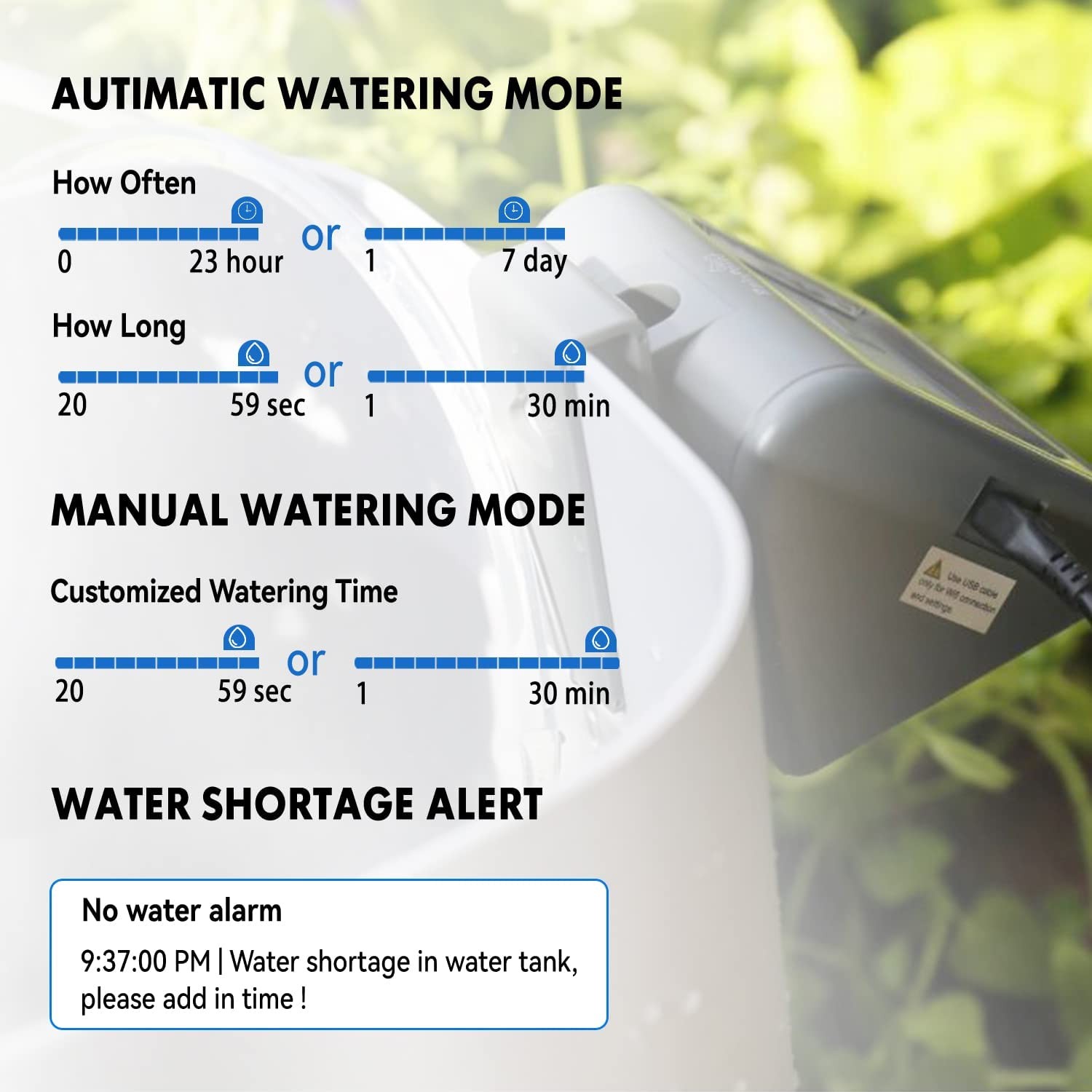 【Remote Control App】With RainPoint APP, you can remotely manage multi-watering plans, notifications will be sent to APP when "Automatic" watering plans are active or pump is out of water. it's perfect to take care of your potted plants when busy with chores or away on vacation. 【Notice Before Purchase】Only connect with 2.4GHz WiFi, for dual-band router, please independently enable the 2.4GHz WiFi band and name it differently from the 5GHz WiFi band. Before pairing WiFi, make sure the USB cable is powered on. 【Worry-free Watering】With “Automatic” function, customize your irrigation plans with local weather, temps, humidity, sunrise/sunset or weeks. Settable timed mode, which watering duration is from 20s to 30mins and watering frequency is from 1hr to 24hrs or from 1 day to 7 days. 【Universality】Rainpoint APP can add multiple family members and engage allowing families to co-manage - no worry about repeat watering. Setting manual or delayed watering - water only as you needed. 2 power modes (battery or USB cable) - ensures long-lasting power life when used simultaneously. 【Effective Water Saving】 Automatic watering system delivers water deep into the soil, saving 70% water compared to traditional irrigation spray. It's portable enough to hang from a bucket in your bedroom, office, balcony or garden for automatic watering of indoor plants. Package of kits meets the watering of 10 plants, which are 1/4" Tubing (32.8Ft), Micro Drip Emitters x10, T Barb Fittingx10, Cross Barb Fitting x3, Straight Barb Fittingx3, USBx1, Tubing End Capsx3, Filterx1, Manual*1.
