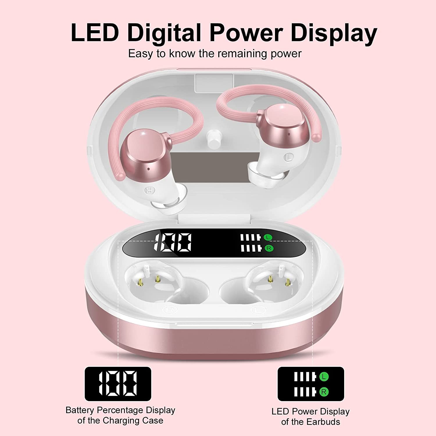 Wireless Earbuds, HiFi Stereo Bluetooth 5.3 Running Headphones with Dual LED Display 30Hrs Playtime, Built-in Mic, Type-C, in-Ear Bluetooth Earphones with Earhooks for Sport, Rose Gold