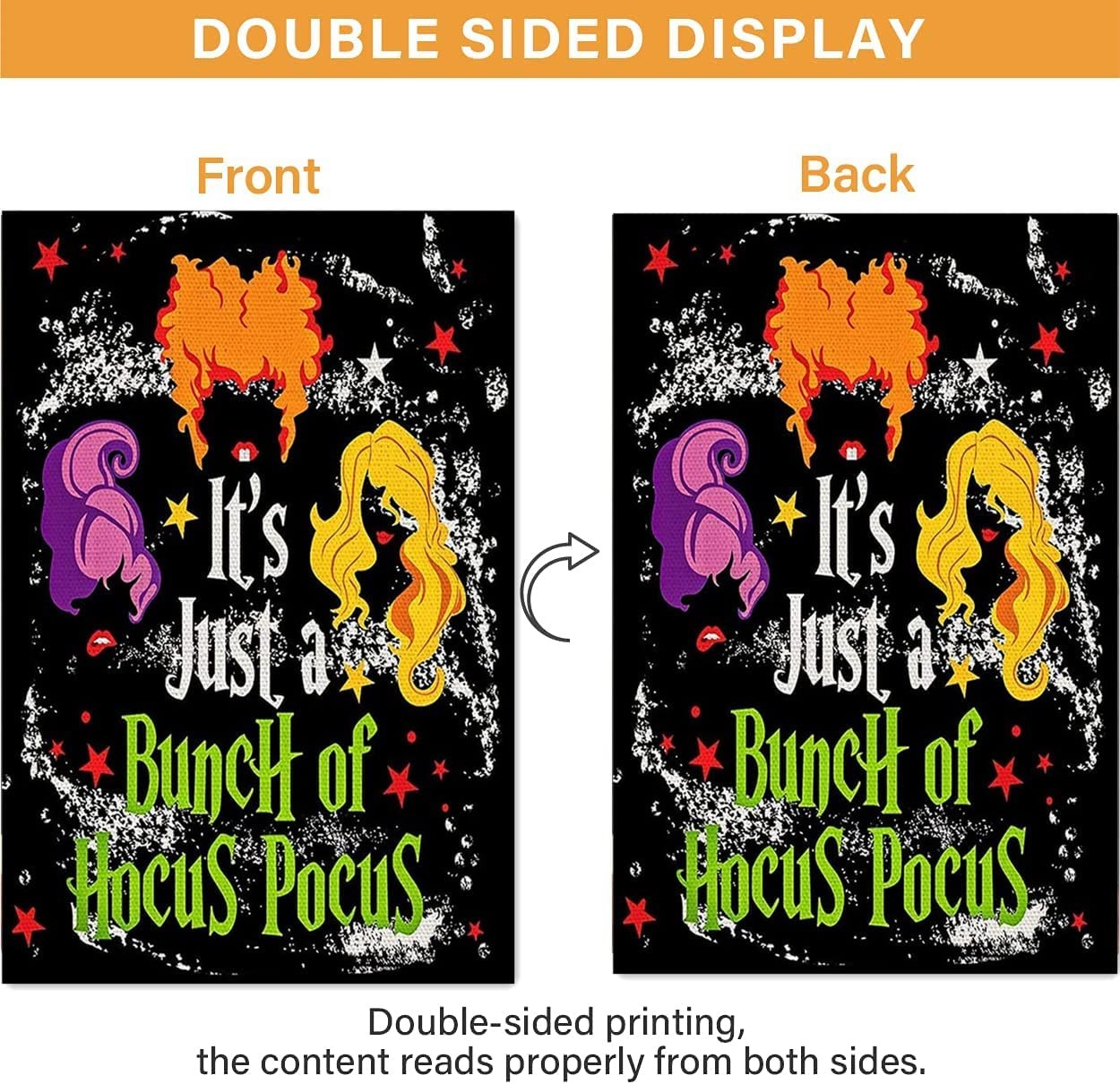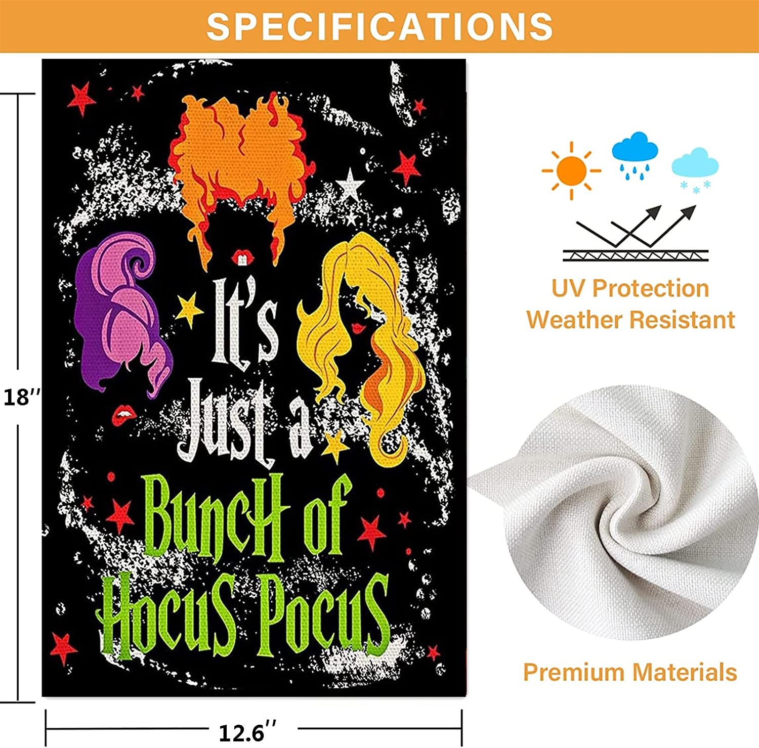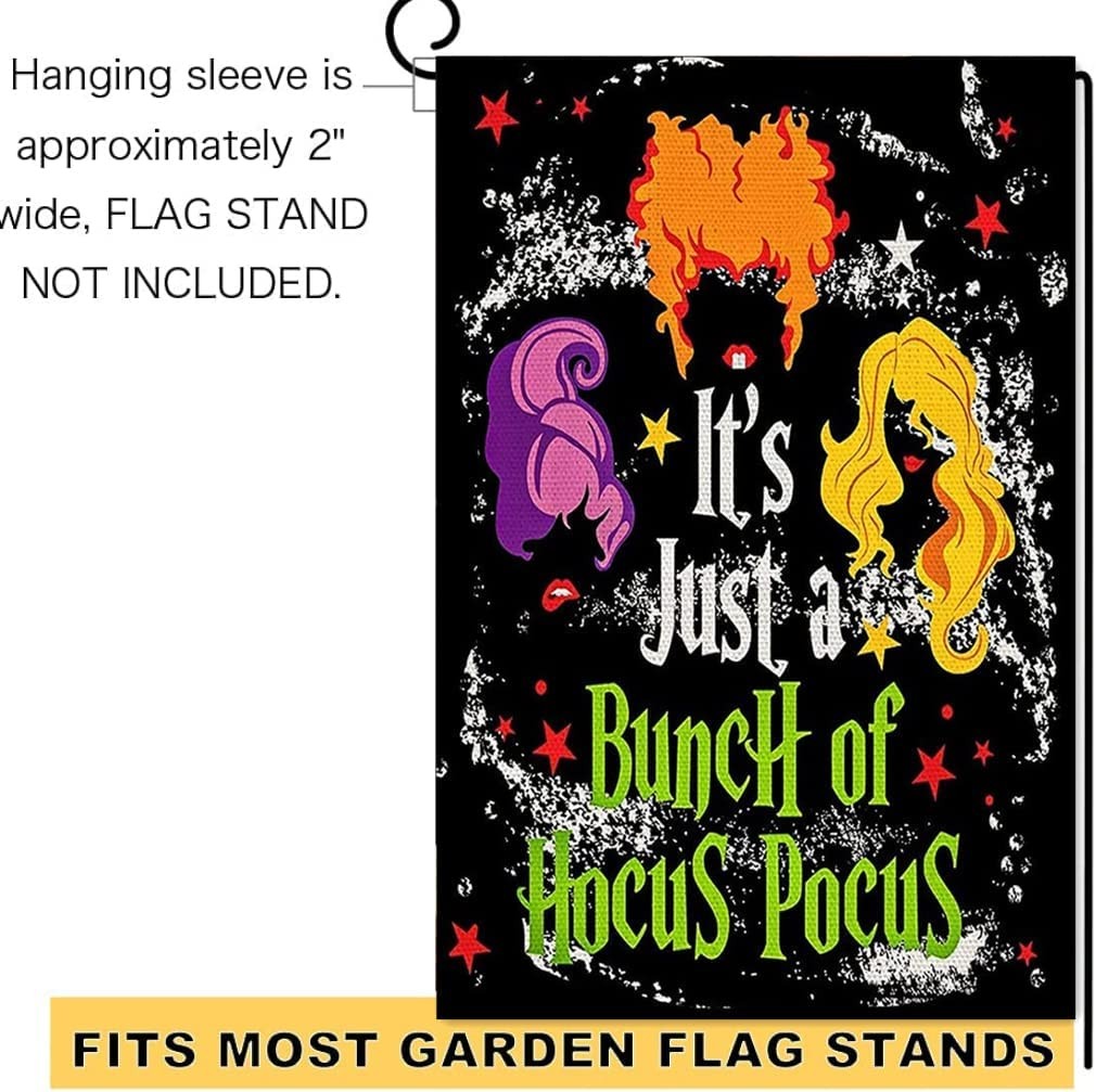 【MATERIALS AND PRINTING】This yard flag is made of high quality polyester, washable and reusable, also machine washable, and this garden flags 12x18 double sided is perfect for Halloween, we use double stitching, which is very durable and solid. 【PERFECT HOME DECOR】This hocus pocus garden flag is a great decoration for Halloween festivals, the garden flags can be displayed on your front porch, yard, garden, patio, lawn, deck, poolside, lake, or even next to your mailbox. 【A FESTIVE TOUCH】Beautifully detailed small garden flag is the easiest solution to maintain a timeless look of your home, as well as offering a welcome stop to your visitors in a distinctive way! It will definitely turn heads of your neighbors and visitors, and create a wonderful look for your garden, yard, balcony and patio area. 【INSTALLATION METHOD】Garden flags all have a sleeve at the top, just use a pole or stand to slide the flag out of the holes on the sides of the top and fit most standard poles and stands. Light up your yard in seconds with our Halloween garden flags! 【AFTER SALES SERVICE】 You can buy this hocus pocus garden flag with confidence, we provide you with high-quality after-sales service. If the garden flag pattern you received is not clear, we will resend a brand new hocus pocus garden flag to you, you can buy it with confidence.