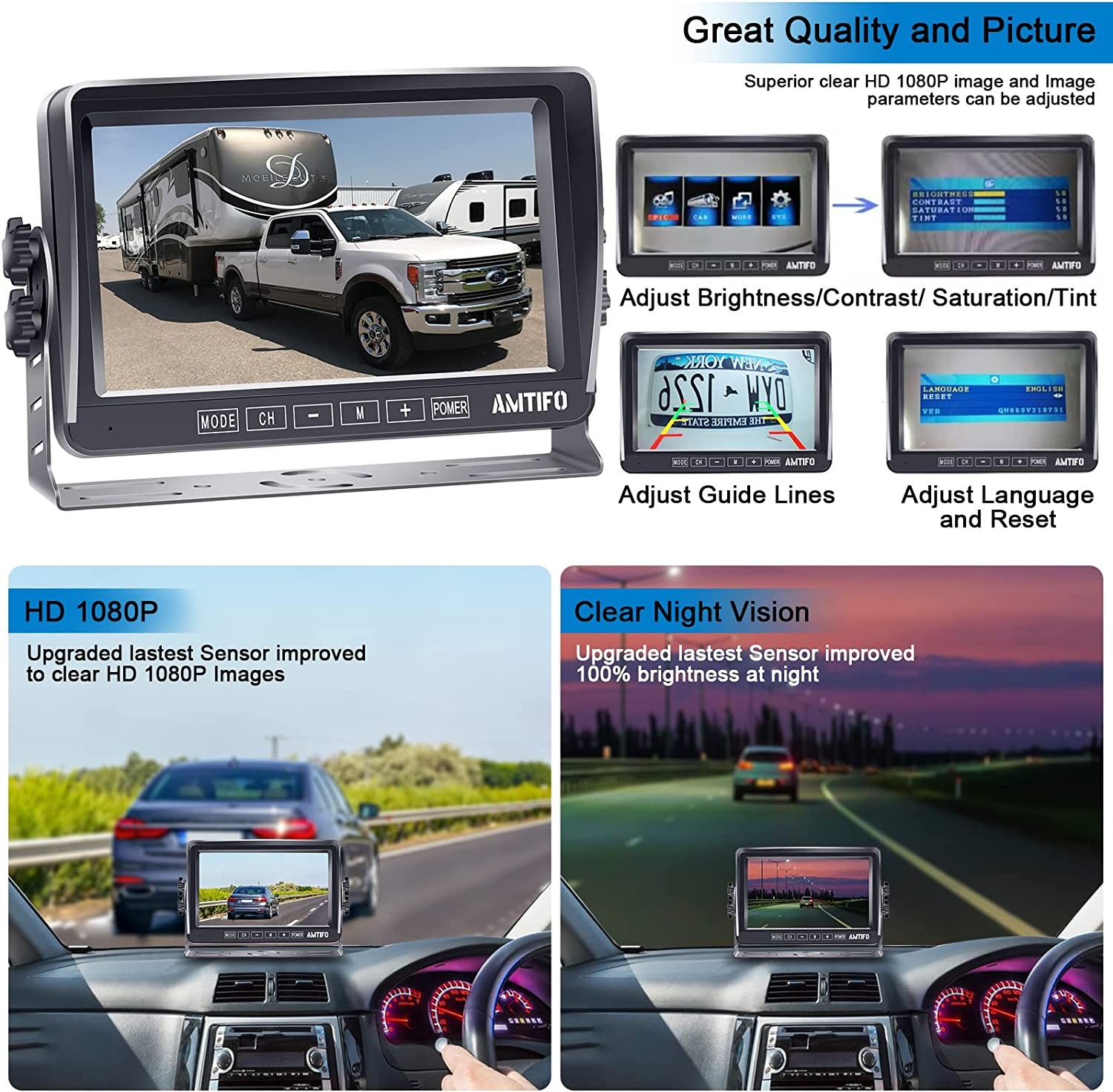 RV Backup Camera HD 1080P 7 Inch Monitor Rear View System for Trailer Truck Camper 5th Wheel Reverse Cam Easy Installation Waterproof Clear Color Night Vision DIY Guide Lines AMTIFO A13