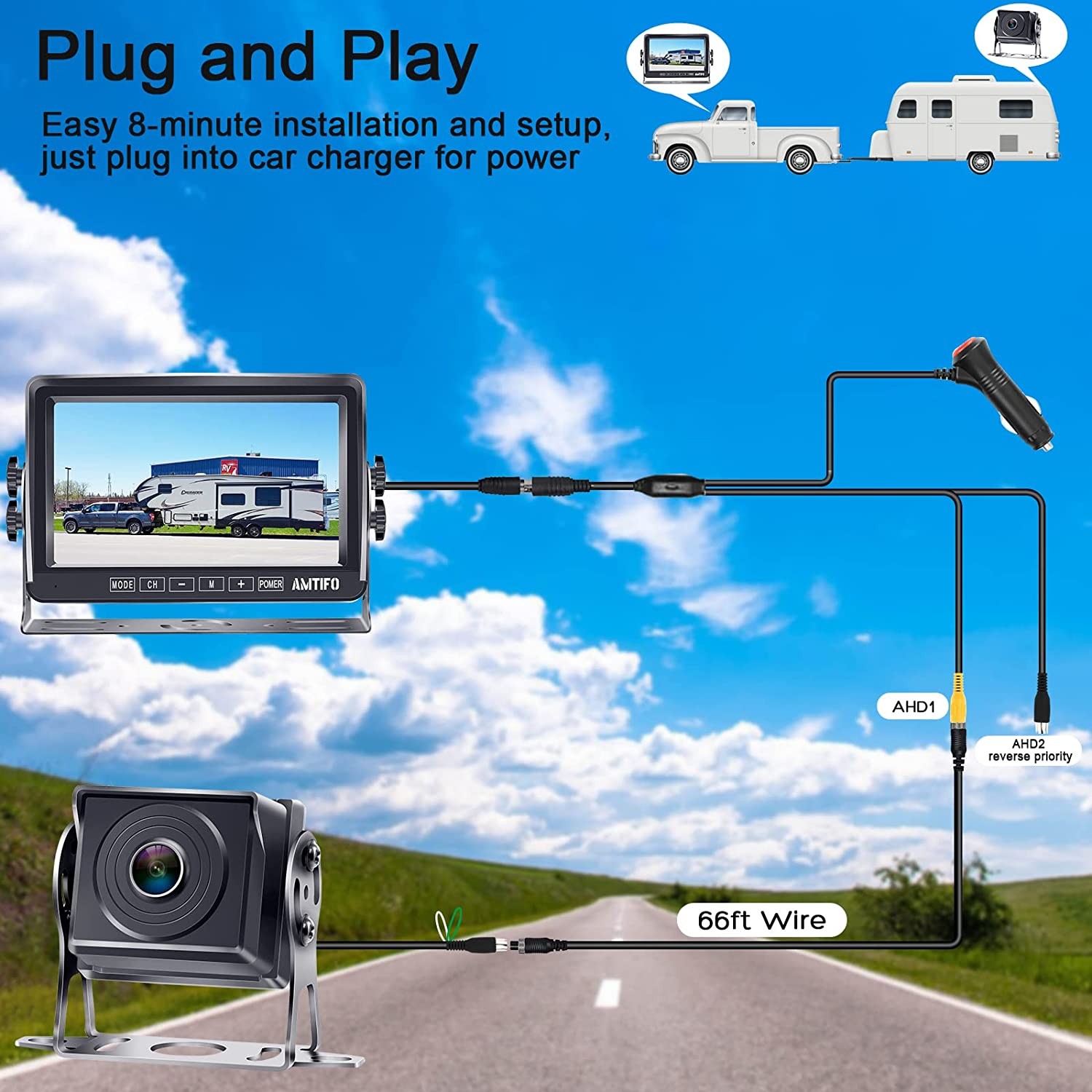Backup camera for truck is easy installation,Once you connect the display to the supply power in the cigarette lighter, or wire it to the ignition you will get the image. The back up camera systems for car with super large 7 inch monitor, it has capability to monitor two video inputs V1/V2, one license plate backup camera or rv backup camera can be added to the system. V2 video input will have priority (reverse camera) for safety. Trailer backup camera a multi-tasker that offers clear graphics at an affordable price. High definition resolution that offers clear picture quality even at night.150 degree, wide viewing angle provides you larger visible area for safety. lity even at night. Trailer backup camera a multi-tasker that offers clear graphics at an affordable price. High definition resolution that offers clear picture quality even at night.150 degree, wide viewing angle provides you larger visible area for safety. lity even at night. AMTIFO A13 car camera provide 30-day money-back guarantee and 2-year warranty. Replacement service and free tech support; we know you will be pleased with the backup camera. Also bracket adapter compatible furrion pre-wired bracket can be provided according your need
