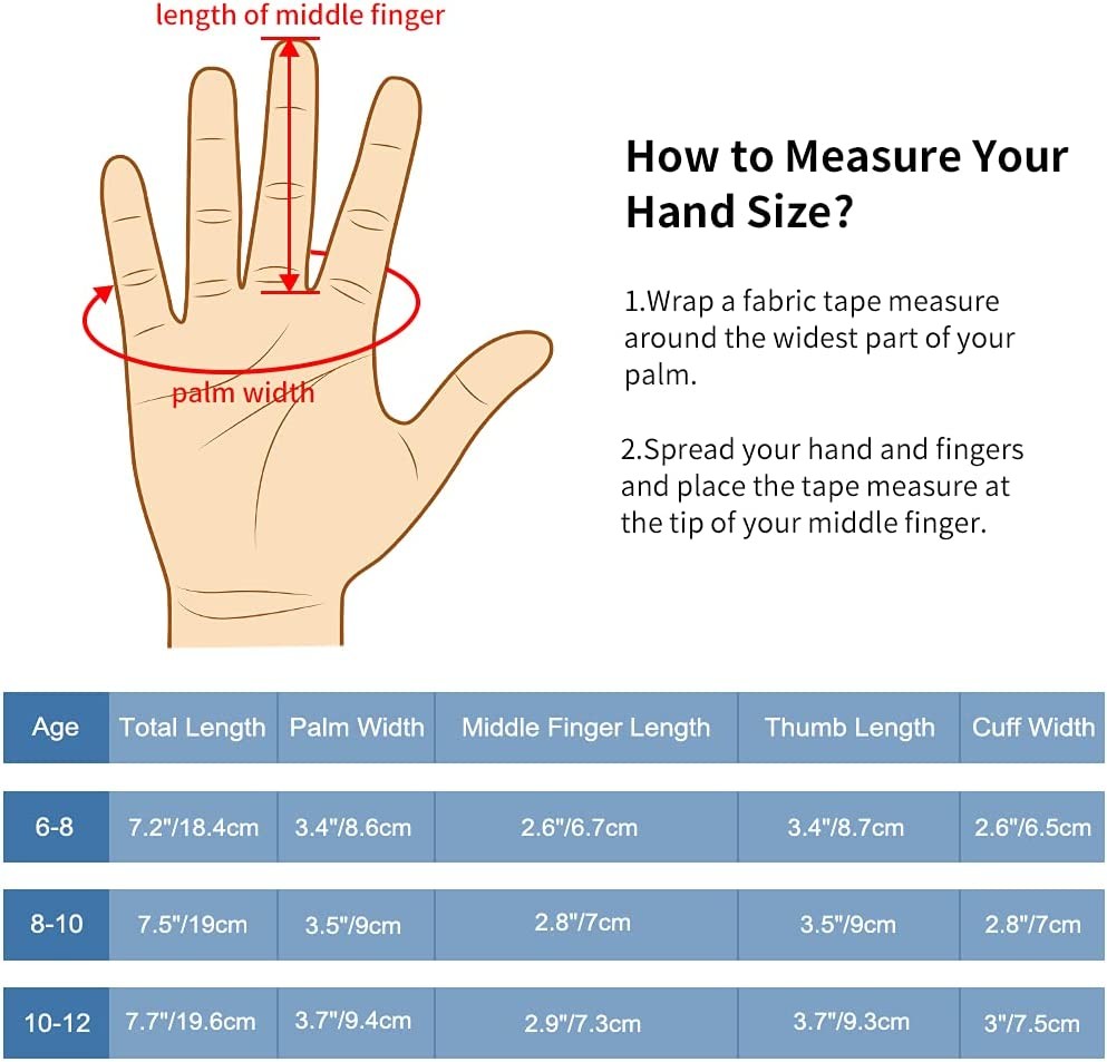 Soft & Thickened Warm Gloves: Kids winter warm gloves linings are made of thickened short plush. These kids winter warm gloves with high softness can keep your kid's hands warm and offer a snug fit at the same time Windproof & Splash-proof: Kids winter gloves are made of milk fiber and SBR composite. These kids winter gloves can prevent their hands against cold wind. The elastic cuffs of are able to block the cold wind and lock the heat. Splash- proof Fabric prevents your kids from getting hands wet in rainy or snowy days and keep warm Sensitive Touch screen Function: With 2-finger touchscreen function on the thumb and the index finger, our Kids Winter Touchscreen Gloves allow kids to use electronic devices or take online classes with the gloves on. A wonderful gift for kids in chilly winter Anti-slip palm & Camouflage Printing: This kids winter sport gloves are designed with honeycomb silicone on the whole palm, which can increase the friction of this sport gloves. The backs of our Winter Running Gloves are printed with classic camouflage patterns, making the Running Gloves a great addition to kids' outfits. Suitable for both boys and girls Versatile Winter Kids Gloves - These sports gloves is good for indoor and outdoor use. In doors, your lovely kids can use tablet with gloves on their hands. Out of doors, they can use this winter gloves as a hiking gloves, running gloves or cycling gloves. There are 3 different sizes available. S is 6-8 years old kids gloves, M is 8-10 years old kids gloves, L is 10-12 years old kids gloves. If your kid's hands are larger than those of the same age, it is recommended to buy one size larger