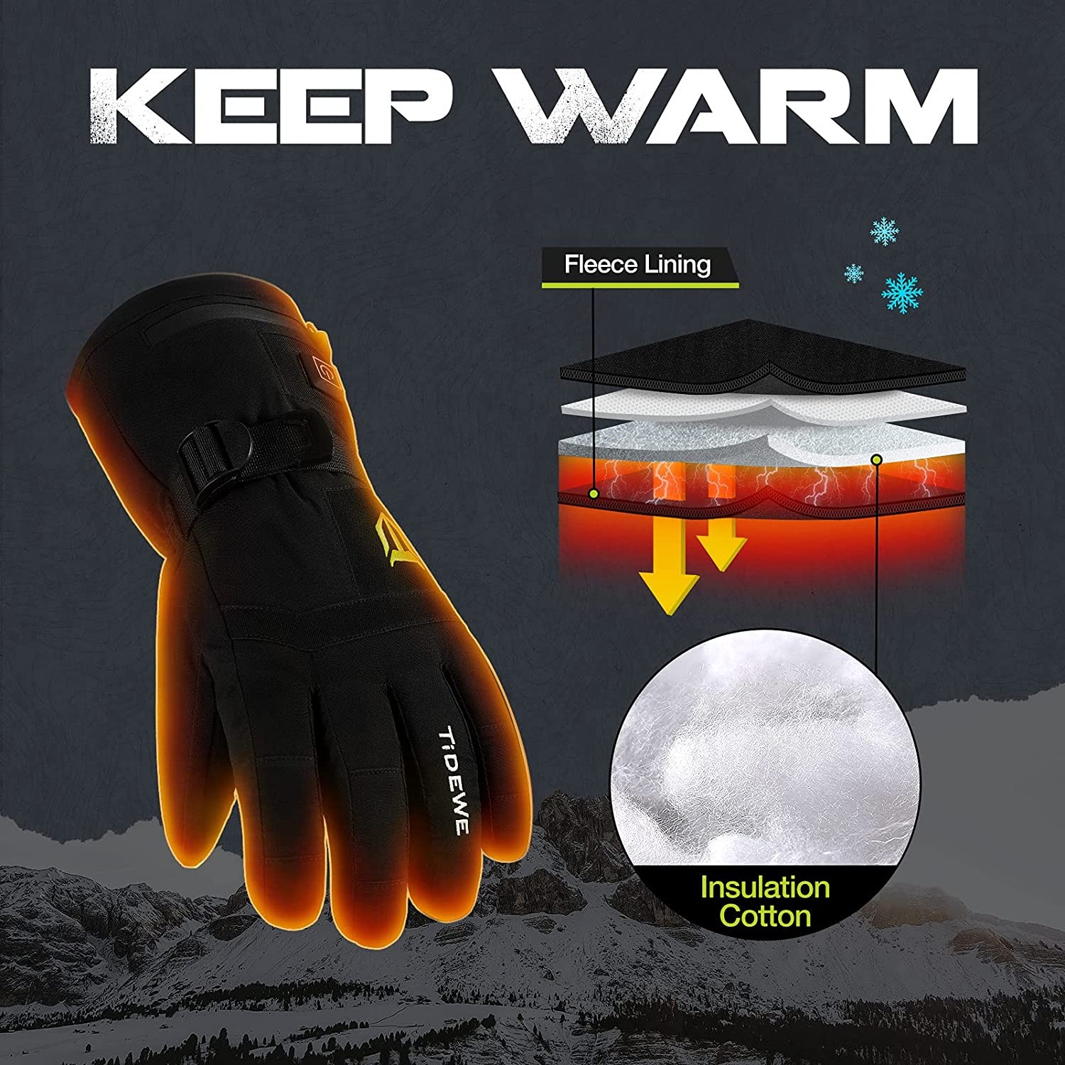 【Smart Temperature Control】TIDEWE heated gloves features 3 adjustable heat settings (blue means low, white shows medium and the red indicates high) with just a simple press of the button, which makes it easy for you to adjust the temperature according to your needs, delivering your comfort in cold conditions. 【Long Lasting Warmth】The TIDEWE rechargeable heated gloves can be Fully charged in 3-4 hours; quick charge is only 2 hours. Up to 6 working hours on the lowest setting, 4 working hours on medium, 2 working hours on high. The maximum temperature is 131℉ in the high setting, which ultimately keeps hands warm, even at 32℉. The high-quality cotton still keeps your hands warm even without turning on the heating system. 【Waterproof, Breathable & Safe】Our cold weather gloves are made of insulated, fleece, water repellent (DWR) and windproof material. They are not bulky, but breathable, and the waterproof zipper keeps your hands dry and comfortable. TIDEWE heated gloves applies the battery with UL, FCC, RoHS, CE certification, keeping you warm and safe at the same time. 【User Friendly Design】Screen touch tips on the index fingers provide you the ability to answer your phone at any time without taking the thermal gloves off. Adjustable-buckle wrist strap and drawstring closure prevent snow or cold air from creeping in. Our sturdy turn fur palms gloves combine a soft lining and grip and comfort you expect from a premium glove.The finger and palm surface are designed according to the scture of the human palm to make it more comfortable. 【Best for All Outdoor Activities】TIDEWE Heating gloves can be used in any cold weather environment with quick charge and up to 6 hours working by portable-convenient power bank. You can stay warm in all outdoor activities like skiing, hiking, hunting, ice fishing, cycling, snowmobile, camping, mountain climbing and even doing outdoor work.