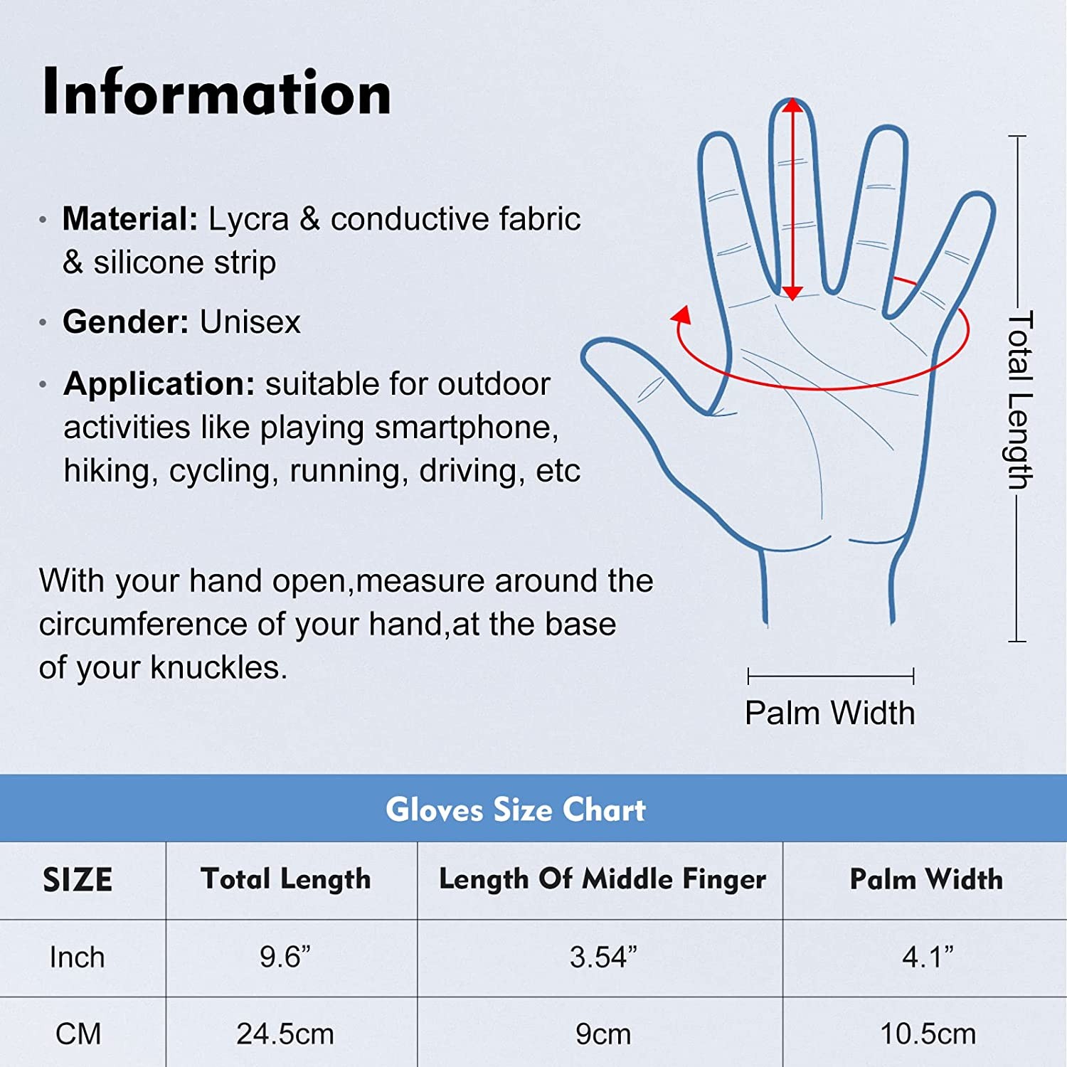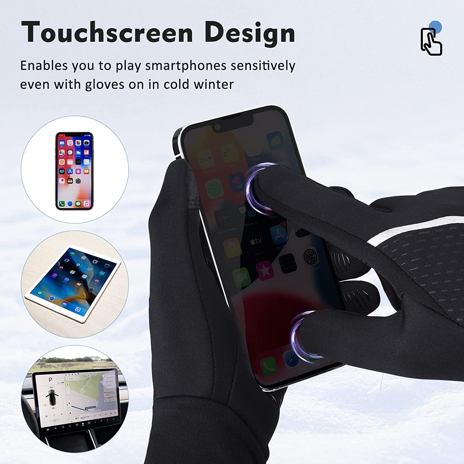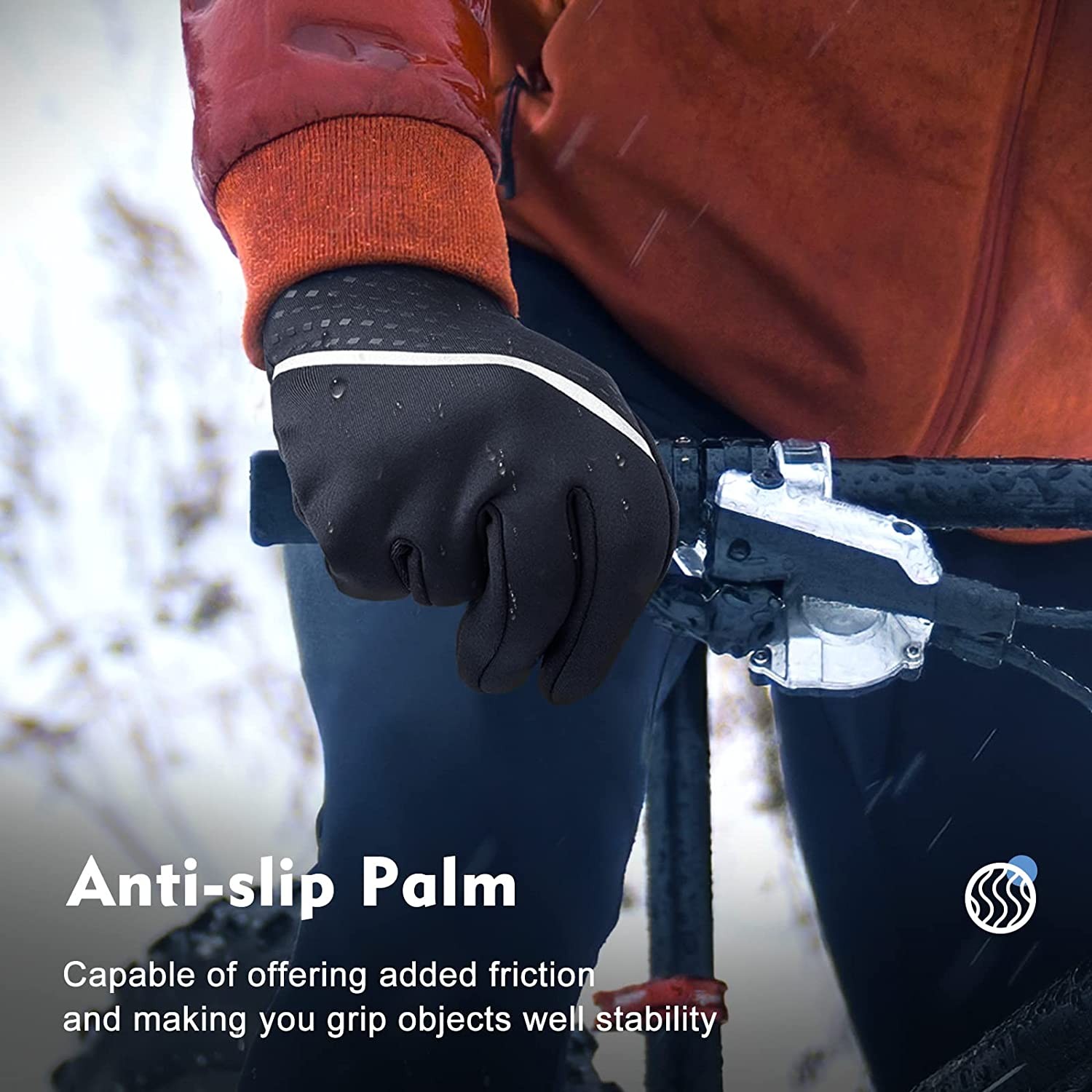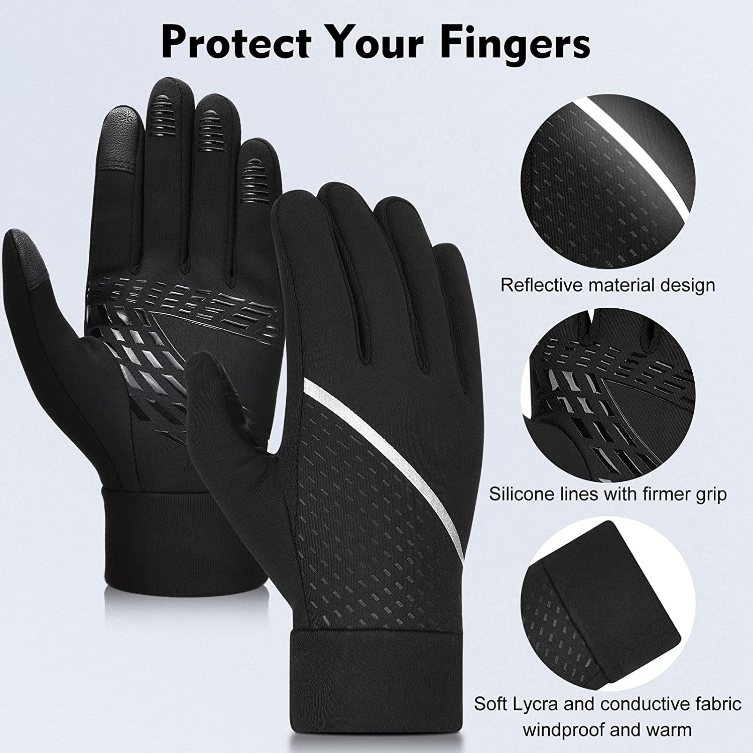 spandex & lycra & microfiber & conductive fabric & silicone Imported Superior Composite Material - Adopts elastic milk fiber and spandex to offer ultra soft feel and comfortable wearing experience Upgraded Touch Screen Function - Enables your index fingers and thumbs to sensitively touch the screen of mobile phone or tablet even with the gloves on Anti-slip Palm - The silicone printings with classic patterns on the palm increase friction so as to prevent your grip from slipping Reflective Strip - Comes with novel microfiber printings to add fashion sense and night visibility, which not only highly shows your taste but also reduces the possibility of injury at dark Comfortable & Warm - These winter sports gloves keep your hands dry by preventing melting snow or drizzle. Thickened fleece lining provides soft and cozy feel for you, and stretchy cuff effectively keeps your hands warm in chilly days Warranty - If the product is found to be defective after receiving the product or during use, please contact us in time. We can provide you with 180 days of free replacement and refund services
