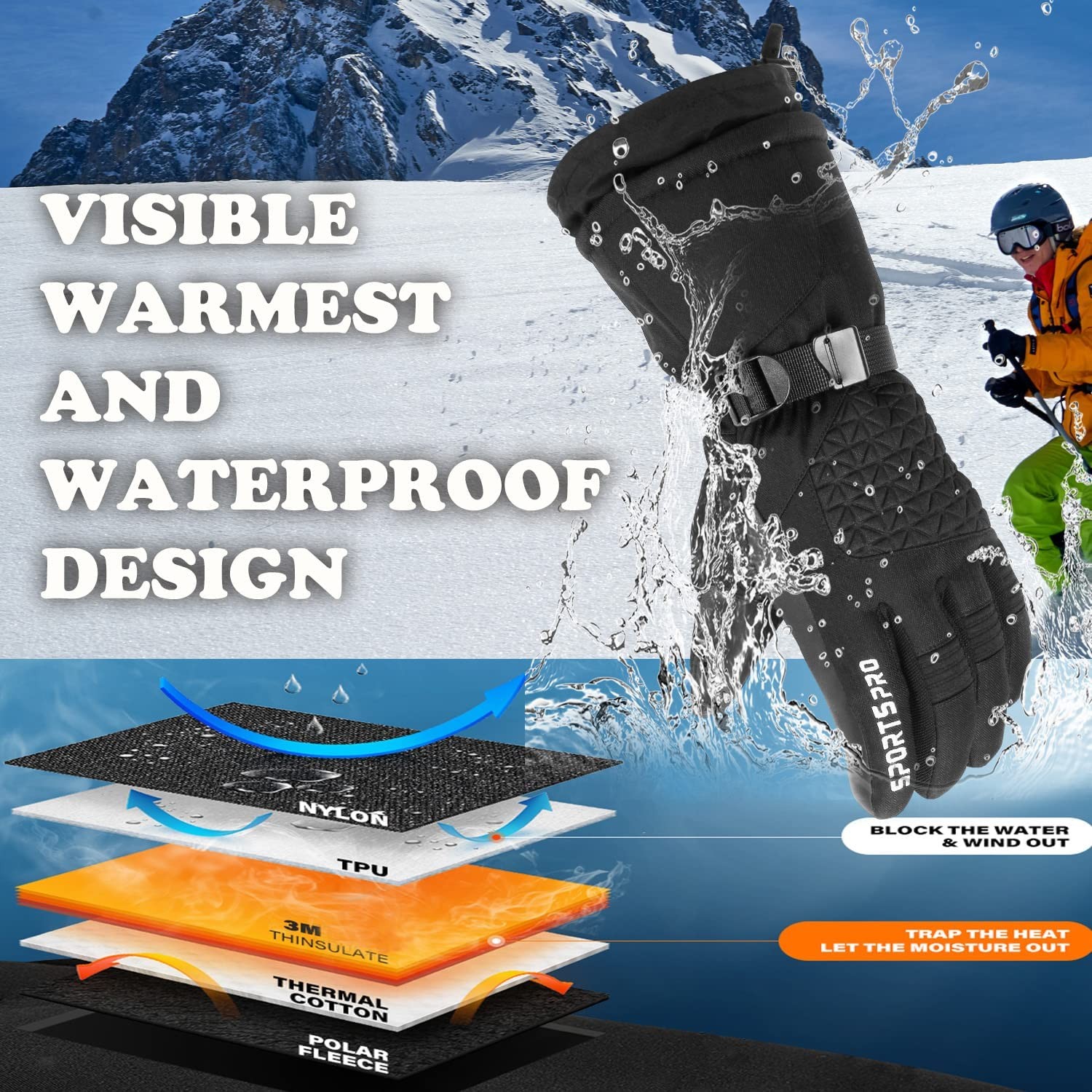【①WARMEST 3M THINSULATE INSULATION:】 Insulated with 40 grams 3m thinsulate and 140 grams warm cotton.It is thick enough to keep hands warmth in cold chilly weather and water proof membrane lining insert warmest for extreme cold weather. 【②HIGH QUALITY TPU FAN-TEX WATERPROOF MEMBRANE:】Water proof membrane lining insert, snowproof,windproof,Moisture-wicking and Air-circulating interior ensuring breathability.99.99% water resistence.If you get a non-waterproof gloves,we will refund full money. 【③ANTI-SLIP PU PALM AND COMFORTABLE LINING DESIGN:】 Anti slip PU leather palm for better grip on the slopes,well wind resistence performance.Meantime super beefy and durable, flexible, mobility - easy to grasp and movement.The lining is very soft and comfortable for skin touch.If u one,you will need it in cold weather above -4°F. 【④BEST WINDPROOF LONG CUFF DESIGN:】 Adjustable wrist strap and elastic under wrist make it fit for you perfect,Hook and loop closure make it easier to carry on. 【⑤MULTIFUCTIONAL IN WINTER SPORTS:】Such as casual use, skiing, snowboarding, snowmobiling, sledding, snow-blowing, shoveling snow, downhill backcountry ski, ice climbing winter outdoor snow sports and so on.