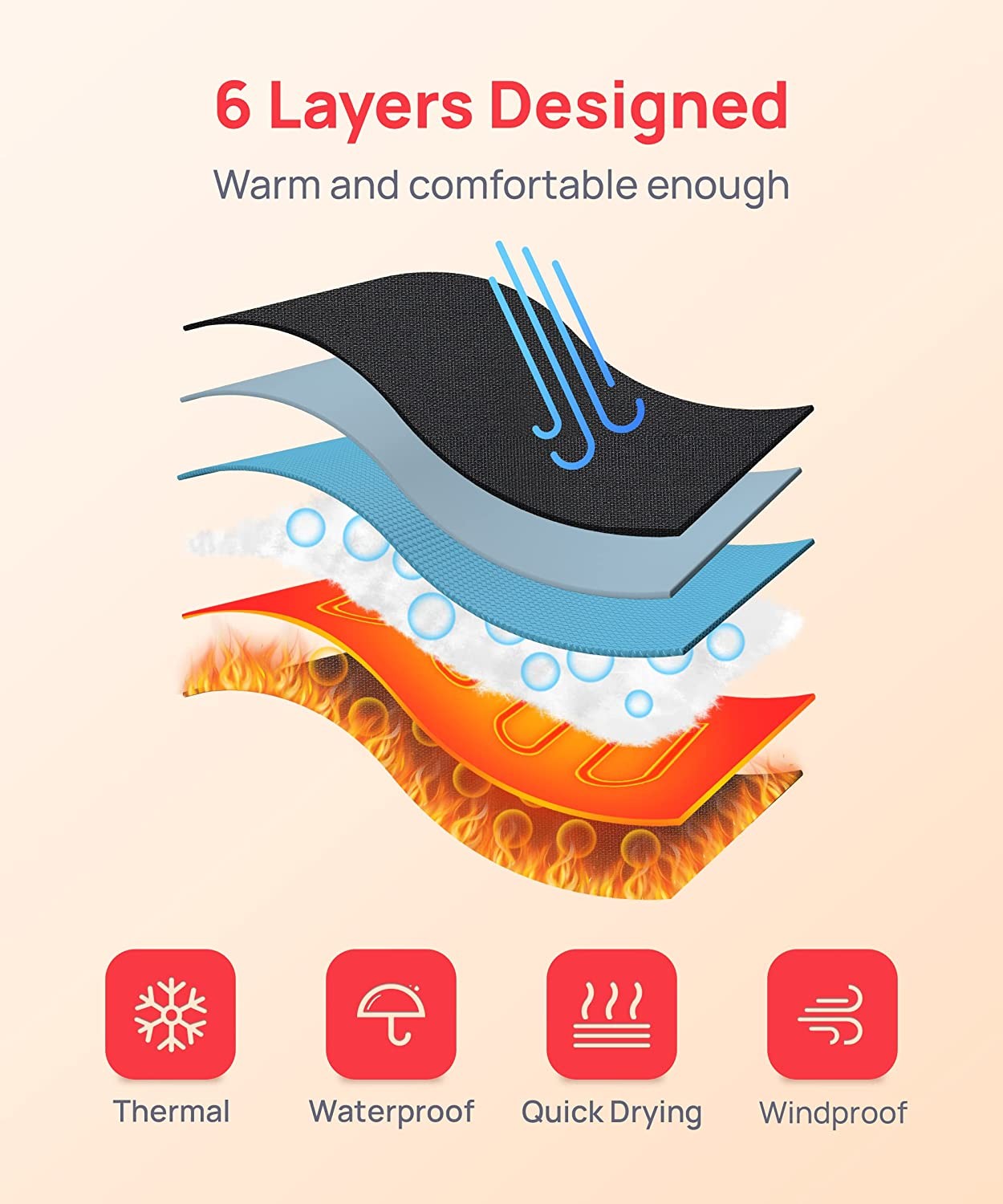 Ultra-fast Heating Speed: The heated gloves use a composite fiber heating wire that can heat the inside of the glove to a warm temperature in a very short period of time. Turn on the power of heating gloves before use, and your hands will enjoy the warm and comfortable feeling. Effectively promote blood circulation, fearless of the cold, say goodbye to Raynaud's disease. Warm your hands all winter long! Wide Heating Area: Compared to other heated gloves, our gloves are designed with heating wires at each fingertip. The wide heating area provides warmth to the entire back of your hand and fingers, and the heating effect is even. Effectively avoid the uncomfortable sensation of cold air freezing your fingers. Three Temperature Settings: The effective heating range of the glove is 100℉-160℉ and the maximum usage time is 5 hours. The three gears can be adjusted to your desired temperature according to your needs, and each gear has a different indicator light to show the temperature range. Suitable for different people and environments. Windproof & Waterproof: The main materials of the gloves are cotton, velvet and polyester, which make them super warm and soft. 6-layer design method can effectively reduce the circulation of hot and cold air and isolate the cold air from the gloves. Continuous warmth effect is excellent, very suitable for winter sports and outdoor activities. Flexible Wrist Cord: You can use the adjustable cuff on the back of your hand to fit the size of your palm. The wrist cord can be hung on clothing, hangers or handhelds when not in use. It is easy to carry and saves effort, and effectively improves the lifespan of your gloves.