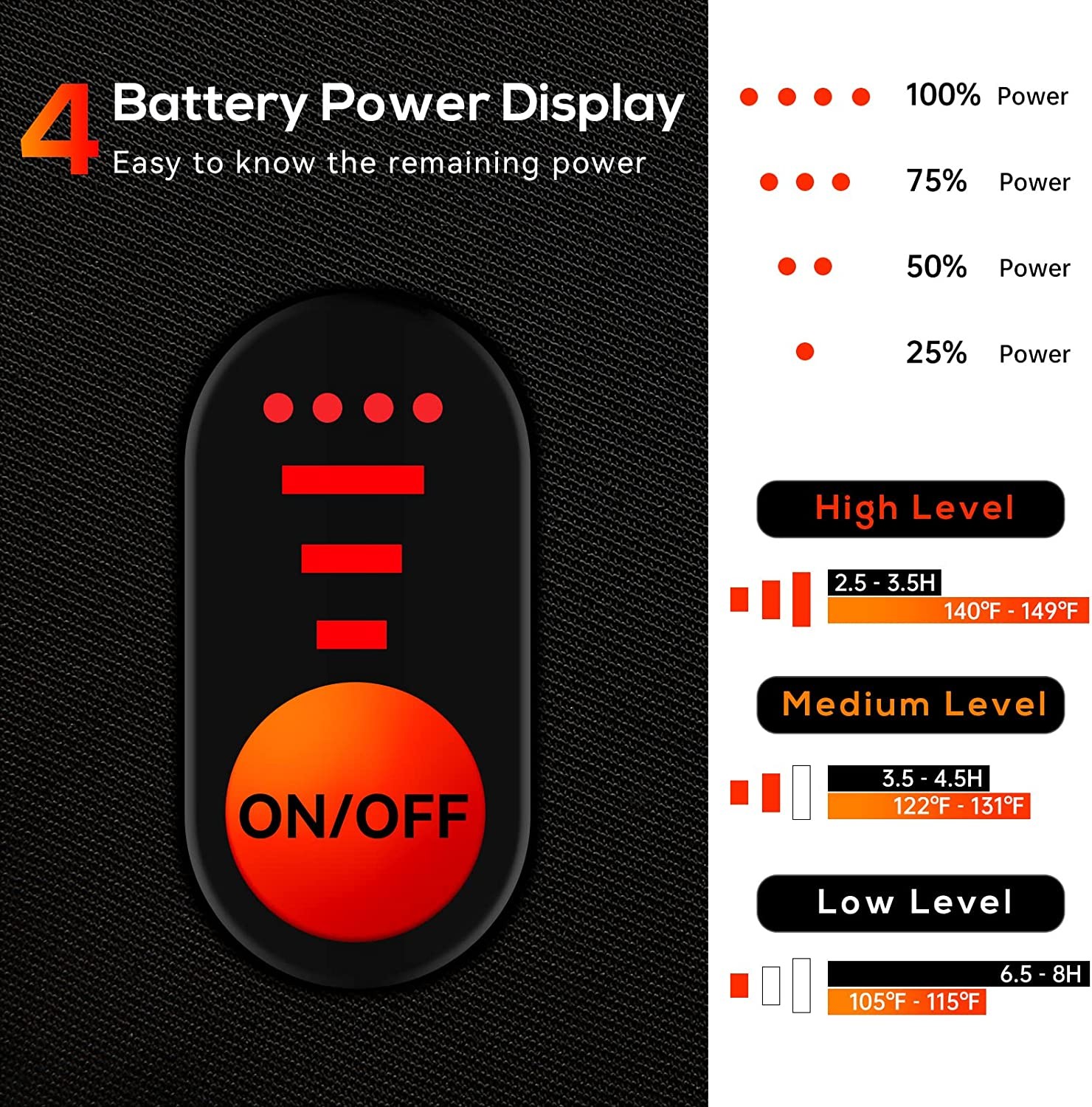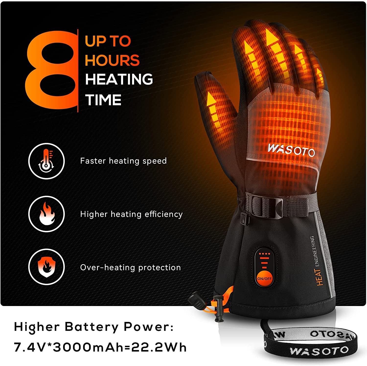 ⛄【Safer & Longer Battery】Compared with others' 5V battery(Actual 3.7V), our 7.4V rechargeable lithium battery provides faster heating speed and better performance at low temperature, and higher energy(7.4V*3000mAh=22.2Wh) brings up to 8 hours warmth(At low level&full charge). In all, our UL,FCC,CE certified battery keeps you warmer and safer. ?【Superfine Fibre & 7 layers of Materials】The palm part is made of superfine fibre, non-slip and more wear-resistant than others' PU material, leading to longer service life. 7 layers material ensures enough warmth. Velvet lining is comfortable to wear with performance upgrade. Besides, diving materials in battery insulation pocket ensure stronger temperature-locking effect. ?【Warm to fingertips & Power display】Equipped with 30K super-tough double-row heating wire, heating area covers the entire back of hand, from fingers to fingertips. The switch panel is easy to operate, adding the unique battery power display function. Besides, our ergonomic-design heating gloves fit your hands perfectly during sports. ?【Touch Screen & Waterproof】The sensitive touch screen function of thumb and index finger allows you to use any electronic devices in cold winter without taking off gloves. In addition, our winter gloves are breathable, waterproof and windproof, keep your hands dry and comfortable during skiing, ice fishing, hiking, cycling and other sports. ?【7*24 Hours & 12 months warranty】We provide 7*24 Hours Customer Service. And our electric heating gloves are guaranteed for 12 months warranty. If you have any questions about our products, please contact us through Amazon Message function at any time.