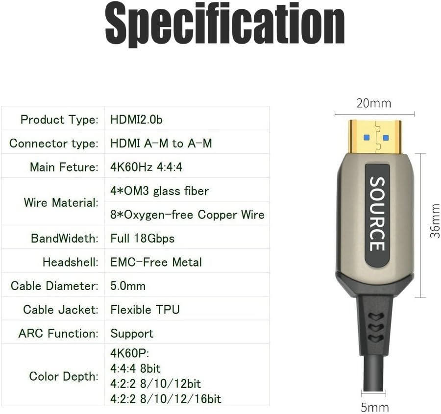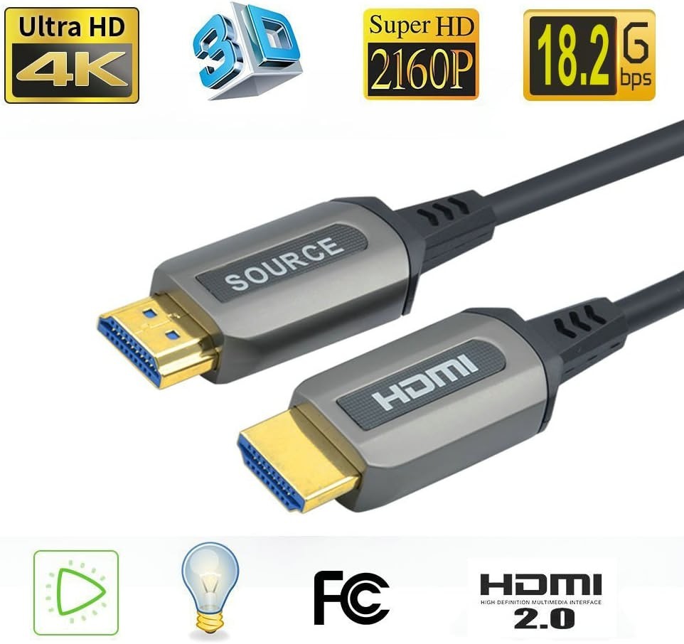 Fibre Optic Core HDMI Lead, optical fleeting transfer without signal loss or delay. 18 Gbps bandwidth HDMI Cord cable higher speed than copper cables Provide the best A/V quality with 18.2 Gbps bandwidth, it ideal solution when copper HDMI can not transfer 4K@60Hz for long distance Made of premium materials (24K gold-plated connector, durable PVC, PET monofilament braided jacket), this slim and flexible cable can stand 10,000 cycles of 90 degrees bend tests. Premium quality HDMI 2.0 cable equipped with triple-layer superior shielding, ensures flawless vision without any electromagnetic Interference HDMI2.0 Cable, Supports HDR/3D/CEC/EDID. connects your HDMI devices to your 4K HDTV, monitor, projector, enjoy ultra high definition image& video for gaming or entertainment, fit for PC, Laptop, PS4 PS4Pro, Xbox, Nintendo Switch, Blu-ray Player and so on.