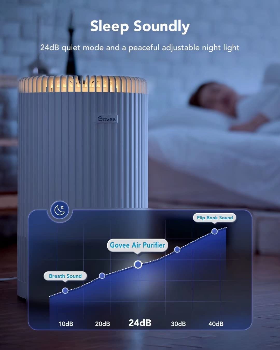 Sleep More Soundly: Sleep mode dims all on-device icons to low brightness and purifies in an ultra-low sound setting of 24dB. The special on-device night light and on/off timers can still be adjusted during Sleep mode. Power Supply: AC 120V only.