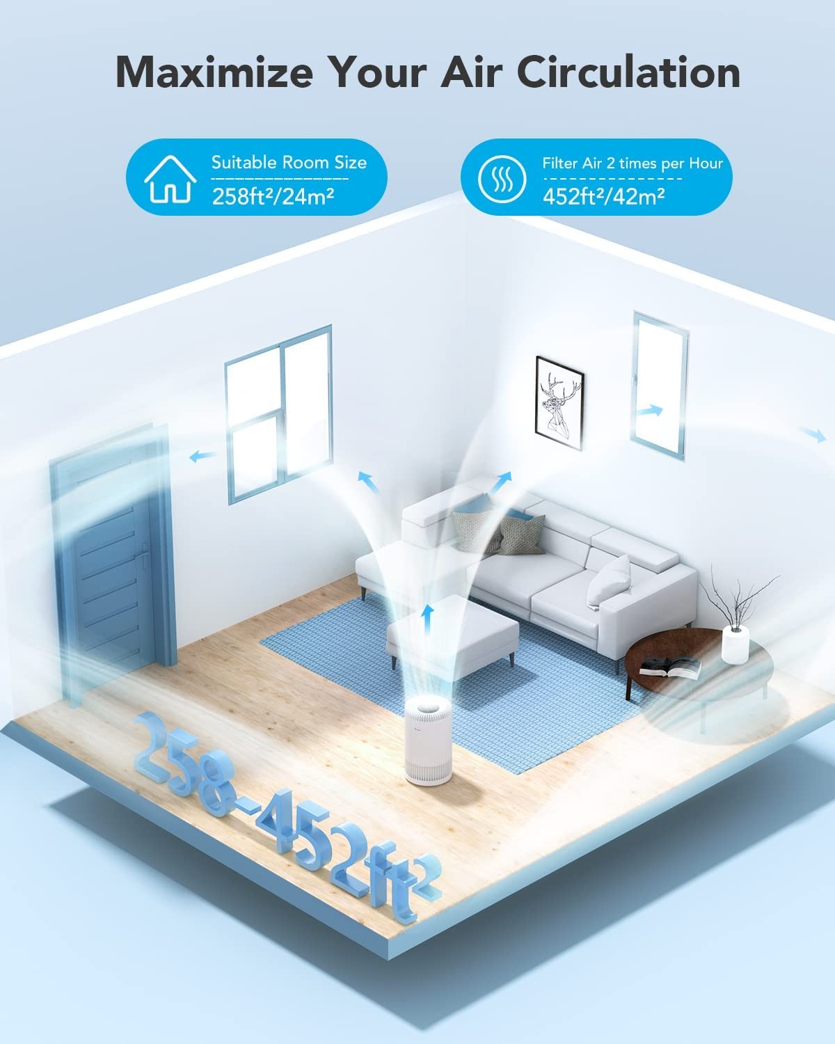 High Performance: With a 360° air intake, the air purifiers for home large room has a Clean Air Delivery Rate of 120 CFM. The air of an entire 452ft²/42㎡ room can be changed every 30 minutes and can purify your 258 square-feet space 5x times an hour.