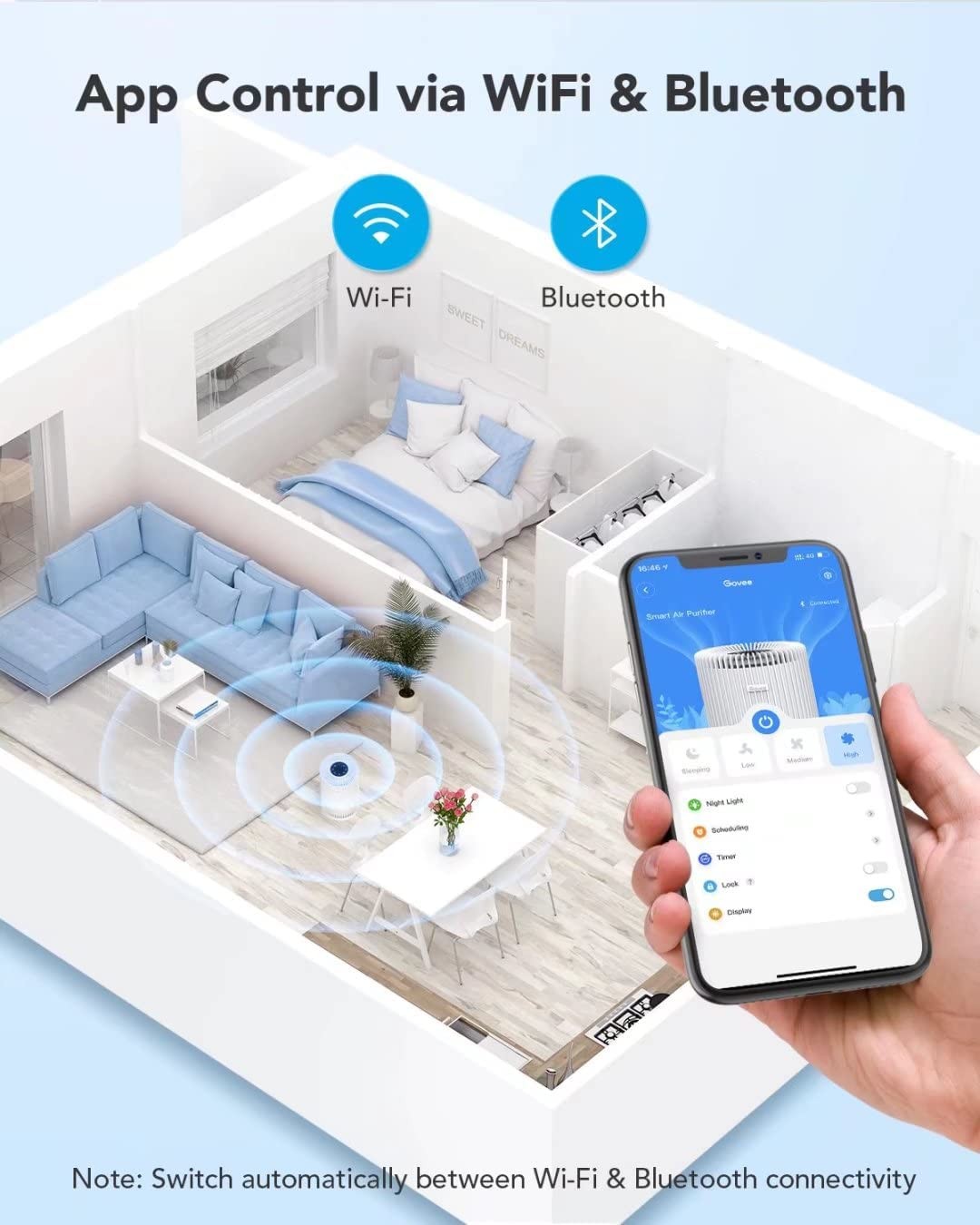 Smart App Control: Govee HEPA Air Purifier can connect to Wi-Fi or Bluetooth easily via Govee Home App. Other features include timer, schedule, fan speed, sleep mode, night light brightness and display lock. with Alexa, Google Assistant and IFTTT.