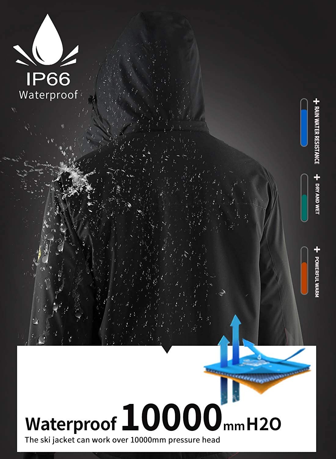 Material: 100% Polyester;Cotton lining Imported Warm and Lightweight Material: Professional water repellent coated, durable fabric with soft fleece lining and ultra light weight cotton warm padding which guarantees the best heat retention. Relaxed-fit style Waterproof: Water-repellent rain jacket can work under over 10115mm pressure head. Keep your body comfortable when you are outside, also can fights bad rainy or misty weather. Windproof: ① Adjustable cuffs, stretchable glove with thumb hole help seal in warmth.② Inside windproof snap powder skirt, internal drawcord hem, detachable and adjustable storm hood help to keep wind out. ③ Wear resisting soft shell is highly wind resistant. Multi Pockets: 2 zippered hand pockets, 1 zippered chest pocket (passport or cards stowed), 1 internal pocket, 116 internal secure media pocket. An earphone line fastening and supporting fixture available inside the jacket. Occasions : The winter coat is great for indoor and outdoor activities such as skiing, snowboarding, skating, mountaineering, hiking, camping, fishing,cycling , camping ,running and other winter outdoor sports.