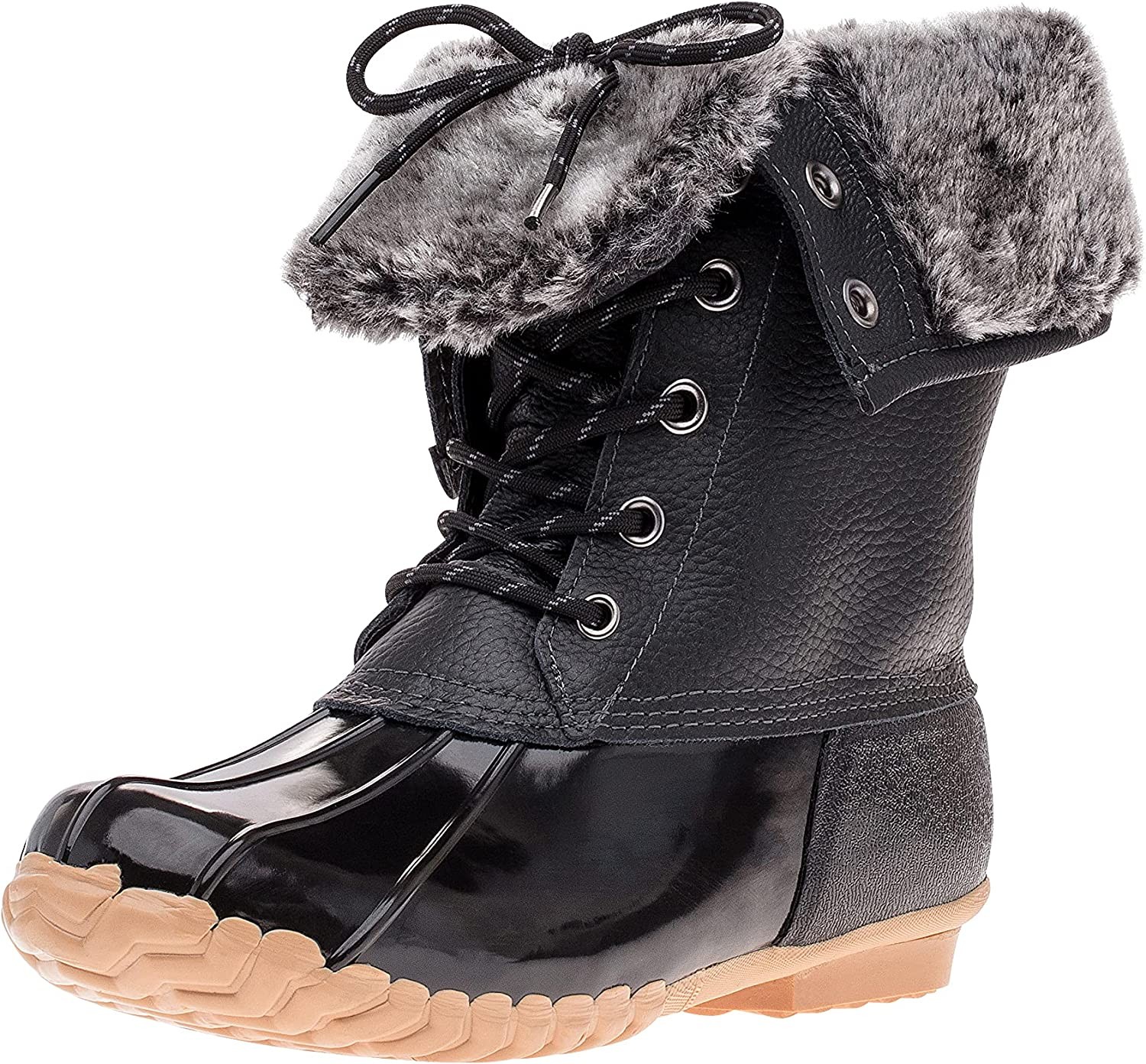 Rubber sole Shaft measures approximately Calf High from arch Boot opening measures approximately 6.2" around ? WOMEN'S DUCK BOOTS with RUBBER SOLE: The ultimate versatile boot for snow and rainy weather has a classic duck toe, lace up closure with metal eyelets, fleece insulation, and rubber sole to keep you warm and dry during every outdoor adventure. ❄️ BUILT FOR WINTER: Cozy polar fleece lining throughout and a padded collar help seal out the cold up top, while a polar fleece insole shields the bottoms of your feet from the frigid ground. ? WATERPROOF, WEATHERPROOF, DURABLE: Take on rain, snow, and cold weather commutes! An 6" engineered performance leather upper is triple stitched to an all-rubber lower that blocks out all precipitation and moisture, so thunderstorms and snow storms are no concern. ⛰️ FROM OUTDOORS TO LIFESTYLE: The duck shoe originated over 100 years ago to help hunters keep their feet dry on rainy days in the backcountry. Now a popular women's footwear style, duck boots will carry you from the trailhead to the lake, and onward to brunch.