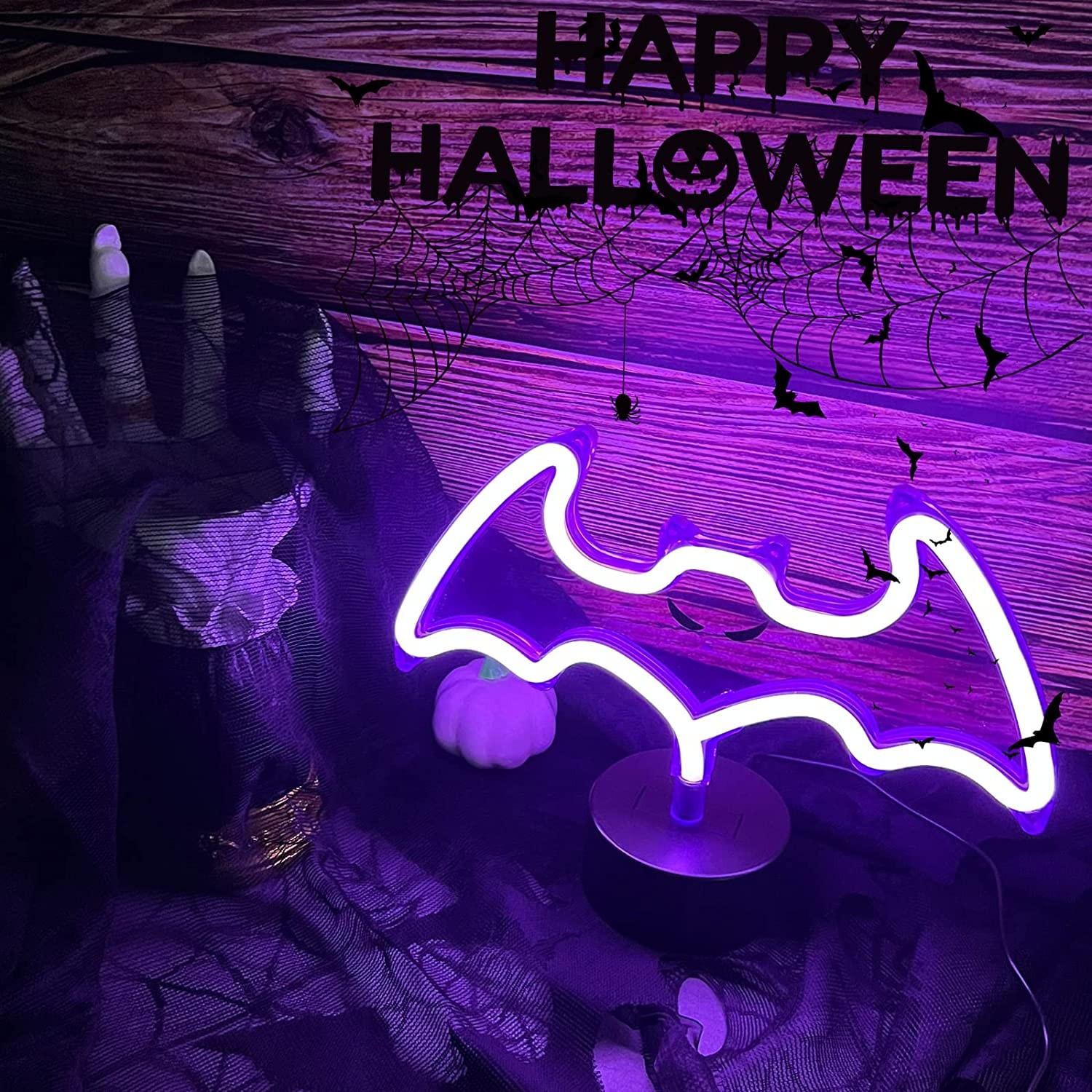 Purple Bat Neon Sign with Base, Halloween Decoration LED Bat Neon Light Signs Indoor Table Decor Neon Lamp USB or Battery Powered Bat Lights with Pattern for Halloween Party,Bar,Room Décor,Kids Gift