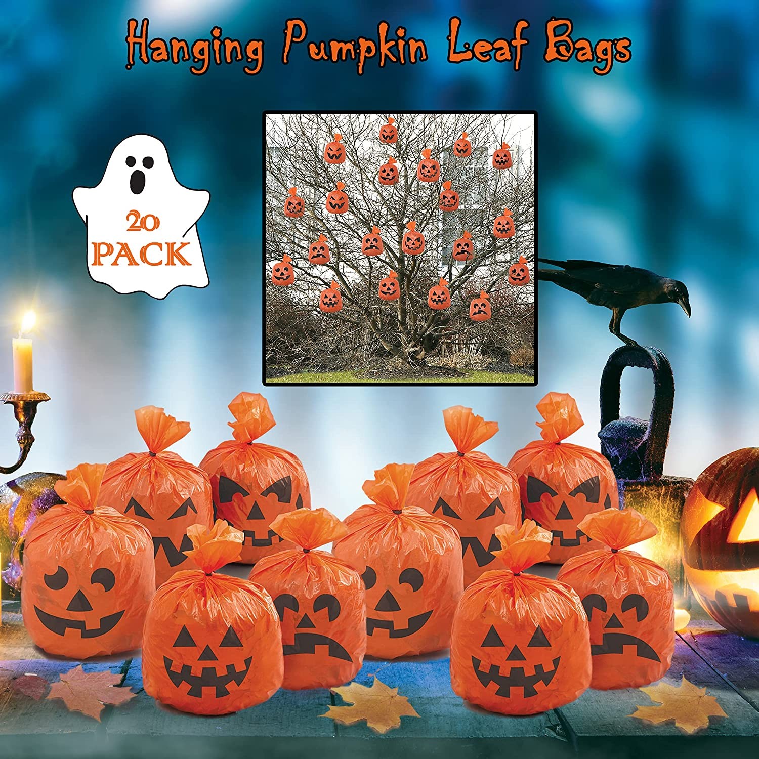Unique 20 Count Hanging Pumpkin Leaf Bags | Halloween Yard Decoration 10" H x 7" W x .25" D | Hang in Trees for Spooky Décor Neighborhood Haunted House
