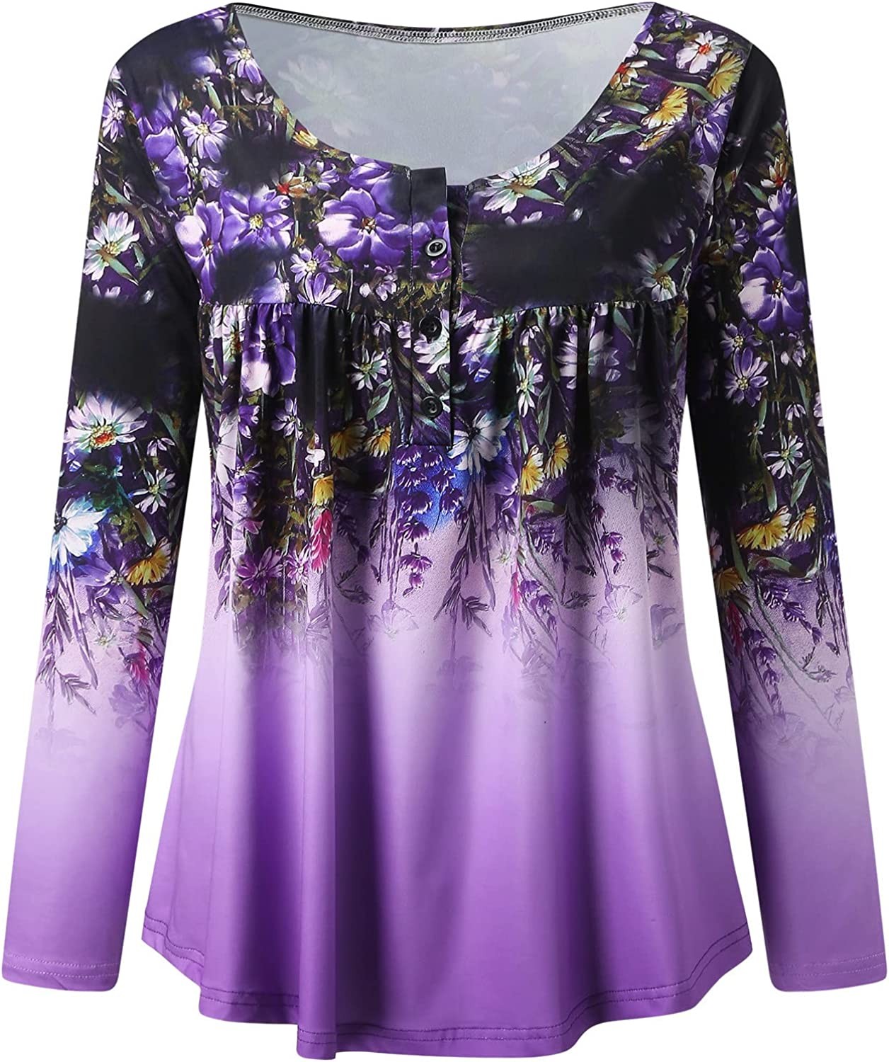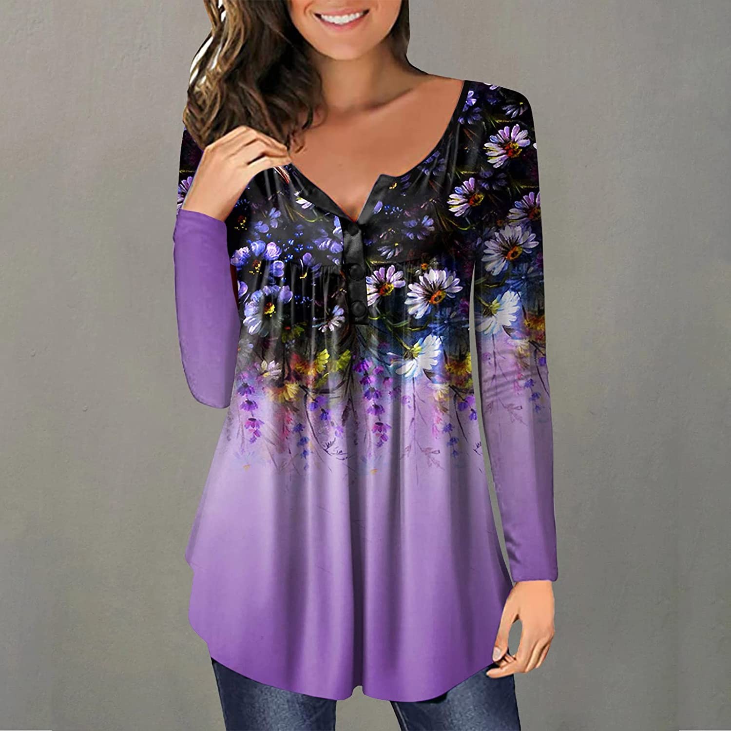 Womens Tops Hide Belly Tunic 2022 Fall Long Sleeve Dressy Casual Blouses Cute Flowy Pleated Henley Shirt for Jeans