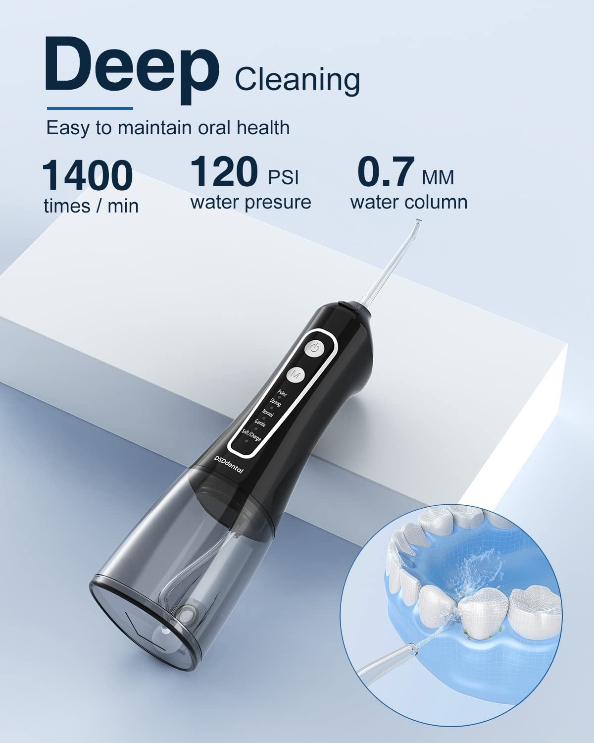 【Deep Clean Teeth and Improve Gum Health】 With the upgraded unique pulsation technique, it offer to provide 1400-1800 times/min high-pressure water pulse, 30-120PSI strong water pressure, can remove 99.99% of deep food residue, massage gum-line to promote blood circulation for healthier gums. 【5 Flossing Modes to Suit All Different Conditions of Teeth and Gums】5 pressure settings ( from gentle to maximum clean) Our cordless water flossers for teeth are perfect for anyone with braces, implants, crowns, or periodontal pocket. Please select “Gently “ mode when you use dental flosser at the first time. 【Long Lasting Battery & USB Type -C charging】Our rechargeable water flosser lasts up to 30 Days (Work Twice Each day). No need to replace the battery frequently. And including 4 interchangeable nozzles, suitable for the whole family. For this water flosser, we have upgraded the t-ypec charging interface and eliminated the micro USB interface, so you don't have to worry about the missing charging cable, because it can be compatible with your mobile phone charging interface. 【320ML Water Tank Capacity &IPX7 Waterproof】The 300ML large-capacity water tank is designed for continuous use of water oral flosser, without the need for multiple water injections. IPX7 waterproof level and with double sealing ring, reliably prevent water leakage, can be used when showering ! 【DSDdental Flosser Warranty & Support 】We provide a 1-year full warranty on the flosser. For any kind of issue you may contact our support line.