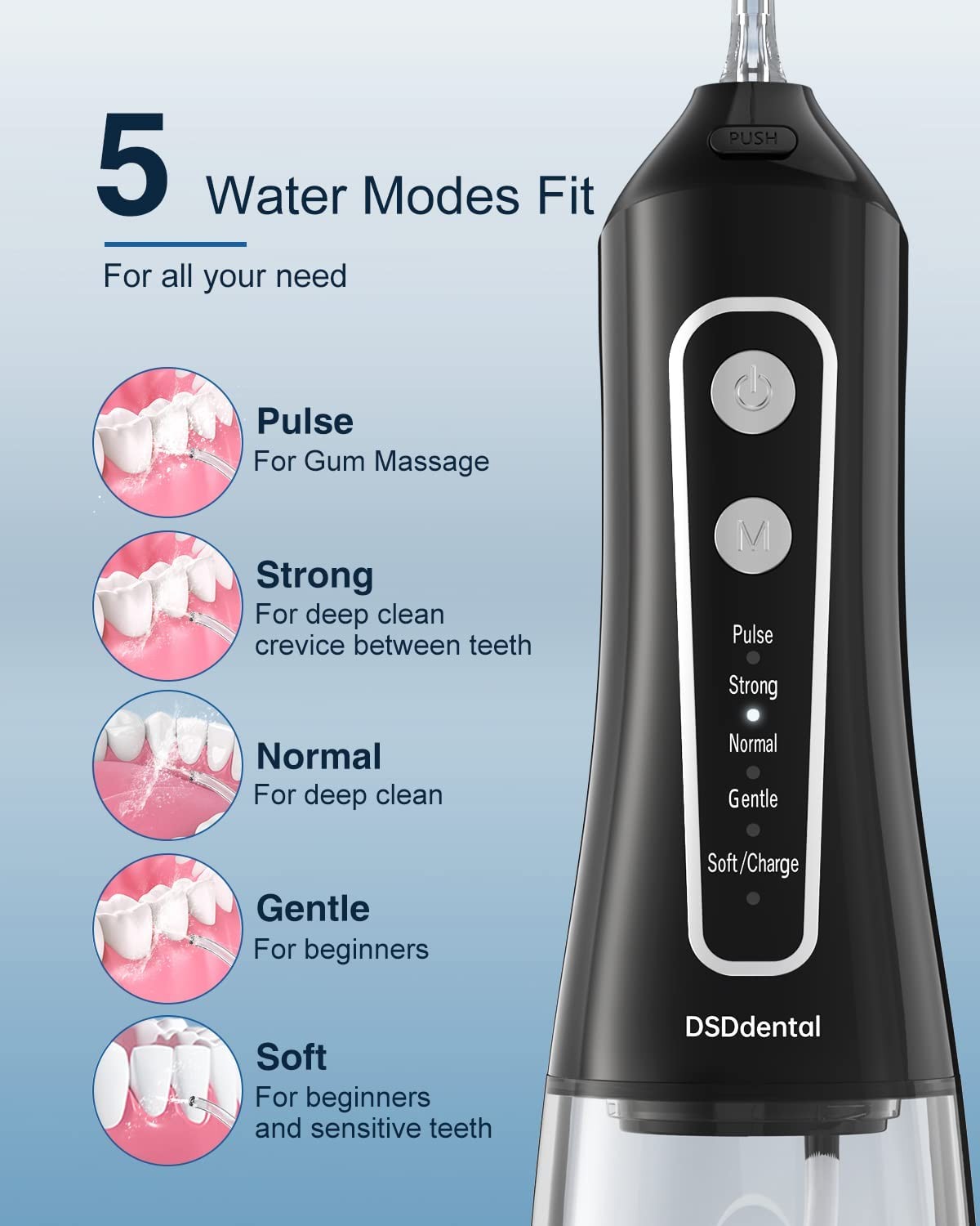 DSDdental Water Flosser Portable Dental Oral Irrigator with 5 Modes, 4 Jet Tips, Rechargeable IPX7 Waterproof Teeth Cleaner for Home and Travel -300ml Water Tank(Black)