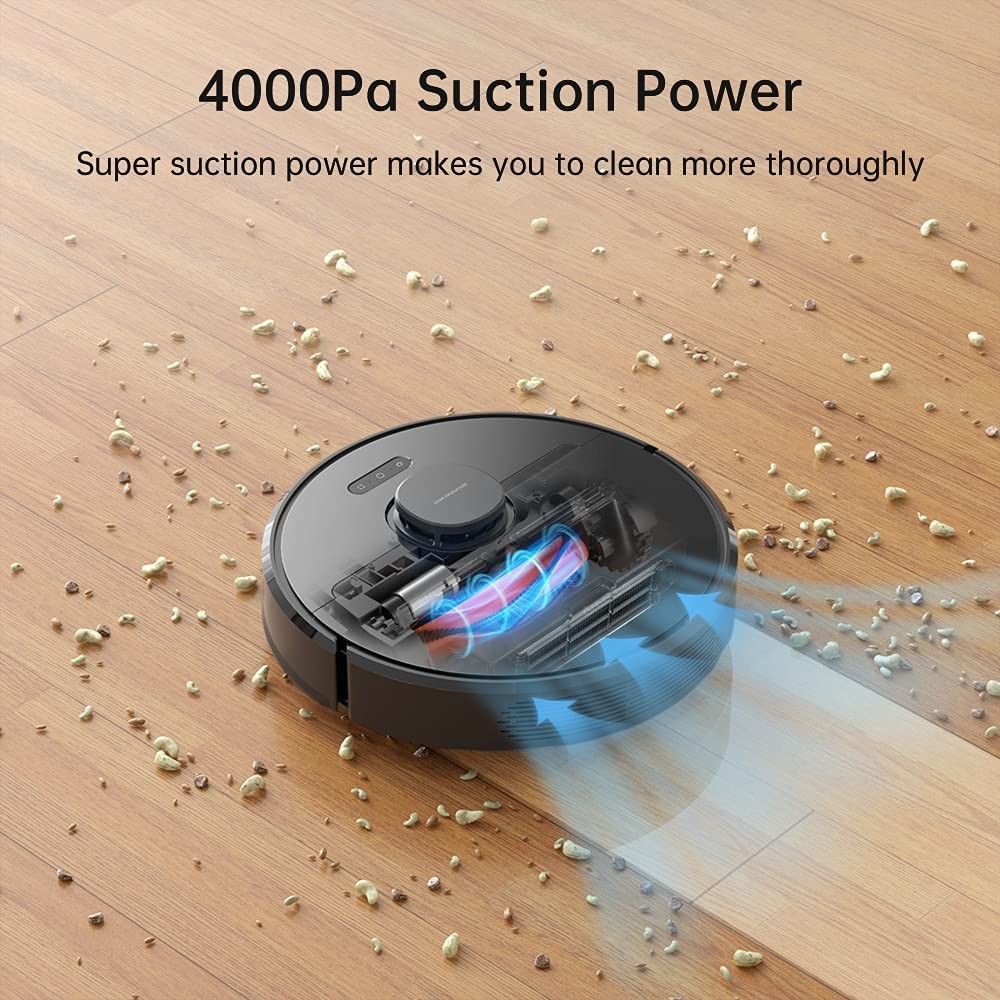 Super Suction Power: 4000Pa of intense suction picks up dirt and messes easily from the surface and deep within carpet;It has 4 levels of suction, you can adjust the level of suction according to the degree of dirt. Smart-Cleaning LiDAR: The advanced Lidar navigation enables better accuracy, faster mapping, stronger performance in bypassing obstacles, and more efficient route planning. Vacuum and Mop 2-in-1: 270ml Large water tank + 570ml Dust tank size + 3 Levels water flows; It can clean your house thoroughly by using effective sweeping and mopping configuration 150 mins Overlong Runtime: The 5200mAh high capacity battery reaches up to 150 minutes of run-time, and it can clean 2690 sqft; and It makes your cleaning last longer Smart App Control: App remote control allows you to adjust suction power, set up virtual walls/restricted areas, etc. Once connected to Echo Dot, the robot responds to your voice orders immediately.