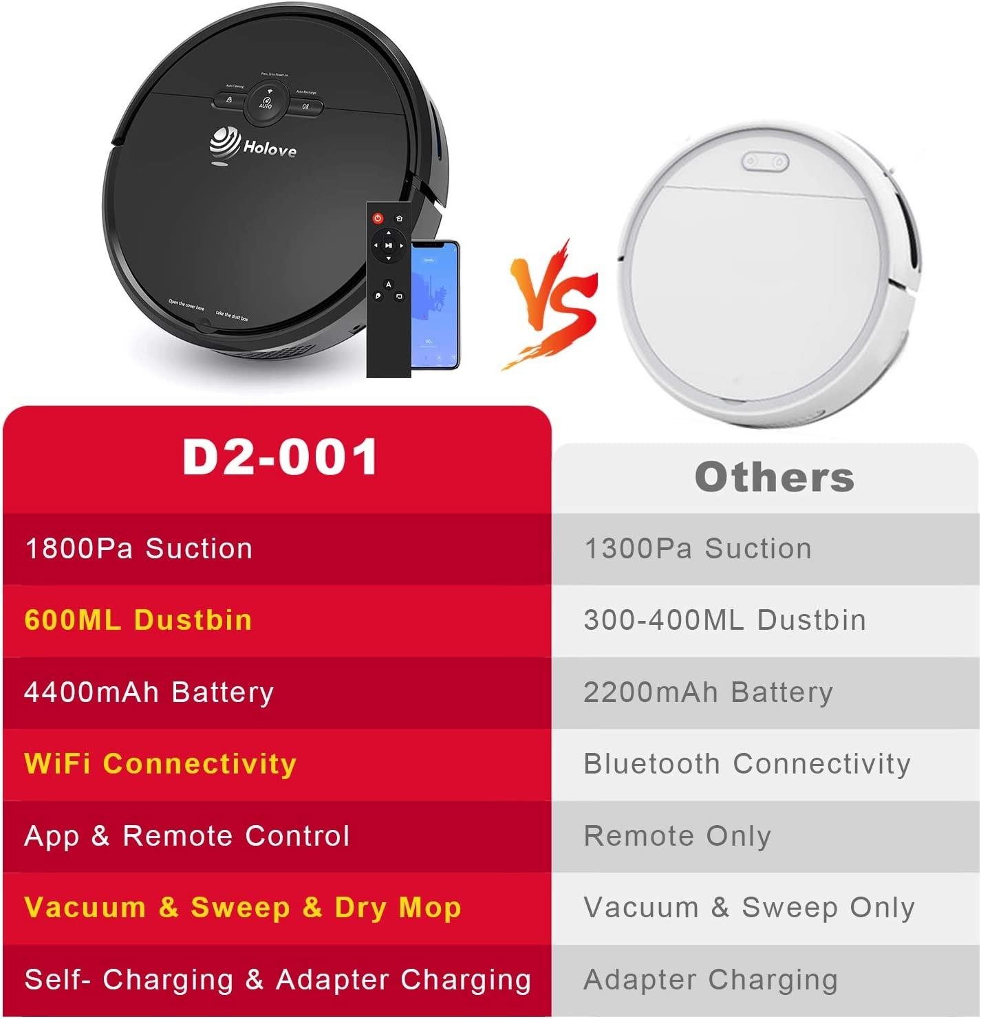 【SMART BROOMOP】 Household Intelligent IC chipset robot vacuum cleaner with multi modes setting can do auto , spot ,edge and schedule cleaning, also with 15° climbing capability,vacuum cleaner can fully fulfil different family demands for deep Cleaner. 【 3 In 1 VACUUM & SWEEP & MOP】1800pa highly suction ability smart robot vacuum cleaner automatic vacuuming, sweeping and dry mopping. The large 600ml dust bin with special design flat nozzle can 99% cleaning micro dirt, hairs, grains and particles. Vacuum multi-surfaces and mop hard-floors for a deeper clean that will leave your floors sparkling! 【INTELLIGENT PROTECTION】Automatic vacuum cleaner robot with genius gyro routing to provide efficiency cleaning coverage.Using upgraded anti-collision & drop- Smart sensation technology for enhanced navigation and evading obstacles, to protect the robot from scratches and avoid falling & bumping . 【SUPER BATTERY POWER & AUTOMATIC】High capacity 4400mAh battery, Offering long lasting cruising up to 90- 120 minutes, easily for big space cleaning requirement. Holove D2 rechargeable robot vacuum cleaner IR charging sensor can defect up to 8 meters from charging docking, Automatically go back to recharge when power is lower than 20 percent, after being fully recharged, auto continuing the unfinished cleaning task. 【VOICE & APP CONTROLS】 Connect to the 2.4GHZ WIFI Network, Smart vacuum cleaner use the Amazon Alexa and the Google Assistant voice commands to conveniently start and stop cleaning. Using the smart App to control robot vacuum cleaner, monitor real-time cleaning/battery power/accessories status, customize cleaning modes/mopping levels/schedule cleaning, control cleaning direction, finds your robot effortlessly.