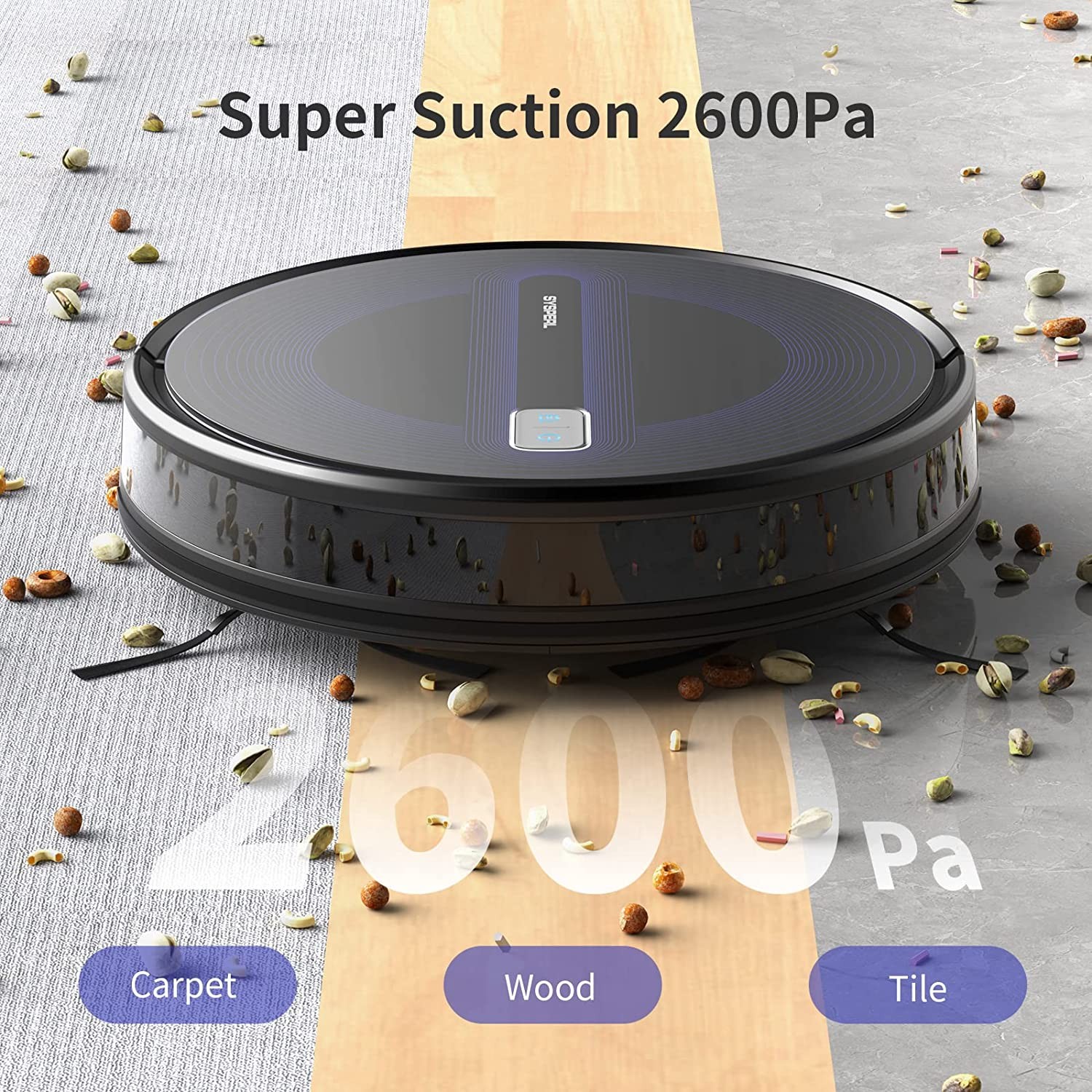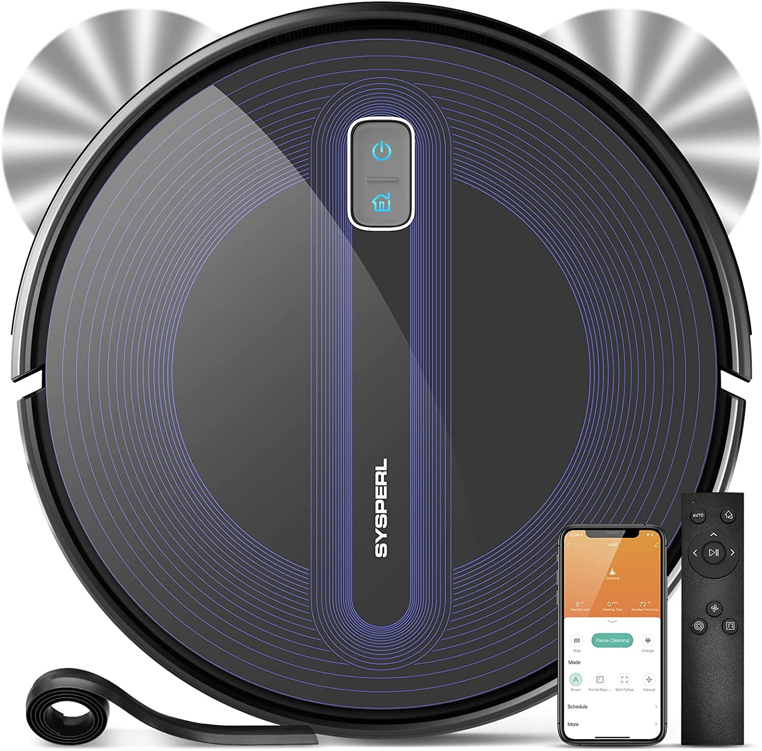 2600Pa Adjustable Strong Suction Robotic vacuum: 2600Pa powerful suction can suck up coffee beans and oat from hard floor,the SYSPERL vacuum cleaner robot can help you effectively pick up pet hair and dust from carpet.Robot vacuum 2 side brushes designed for clean thoroughly and avoid clogging and hair tangles.The robot cleaner great for pet owners.The 3 adjustable levels suction can freely switch to better clean. High-Capacity Battery 2600mAh & Self-Charging:The SYSPERL automatic vacuum uses lithium iron have a longer life,better safety. The sweeping robot up to 120Mins runtime about 150 sqft and vacuum robot cleaner will go back to the charging base automatically when run out of battery or finish cleaning. 4 Cleaning Modes Meet Your Needs:self vacuum cleaner robot supports 4 clean modes including Auto cleaning mode, Spot cleaning mode, Edge cleaning mode and Manual control clean mode to meet different cleaning needs.The self cleaning vacuum robot built-in Anti-bump and Anti-fall sensors so you don't need worry about your robot vaccumaccum falling down stairs or hit other furniture. Work with Alexa Voice&App&Remote:V40P robot vacuum cleaner compatible with Alexa and Google Assistant, conveniently start and stop cleaning by voice commands. Use Tuya smart App,You can easily set clean schedules, choose the clean mode, change the clean direction, finds your home robot effortlessly.Use V40P vacuum robot to save you time and energy! Boost-Intellect Technology: V40P cleaning robot supports boost-intellect technology, which can automatically increase suction power within seconds to help moves easily from hard-surface floor to carpet , once off the carpet, normal suction returns.Auto vacuum cleaner robot floating roller brush design enable smart vacuum close to the surface for an impressive clean.