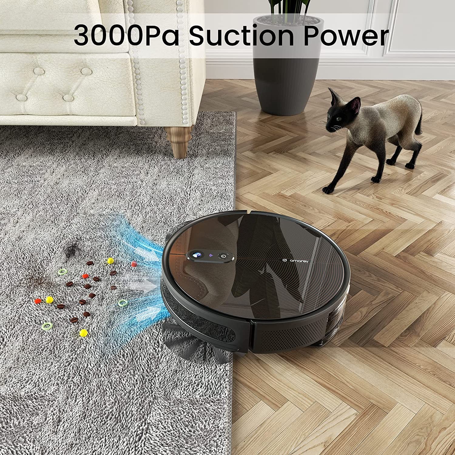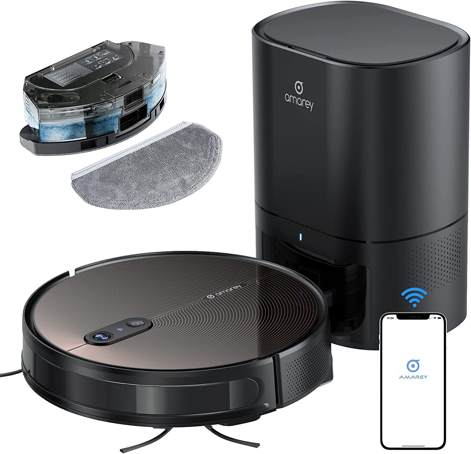 45 Days Hands-free Cleaning: The robot vacuum is equipped with a 2 in 1 auto-empty dock and charging base, emptying itself into a large 3L dust bag that has the capacity to collect weeks of dirt. It helps you dispose of dust, pet hair, and other debris in your home without lifting a finger. Vacuum and Mop in One Time: Amarey combo robot vacuum and mop adopts a 300mL water tank, which can clean up to 500 square feet. Additionally, you control the rate of water flow through the app to reach a balance of moistness and quick-drying, and the damp pad cleans your vacuumed hard floors. Smart Mapping: Amarey A90+ vacuum robot features visual navigation to map your room and plan an efficient cleaning route. It allows to clean the targeted area and set up a No-go zone. Moreover, you can choose to schedule cleanings when you are not at home. 3000Pa Strong Suction with Low Noisy: The Amarey robotic vacuum cleaner uses a brushless motor to greatly reduce the vacuum noise under 58 dB. A great option for vacuuming your pet hair in the carpet with its 3000Pa powerful suction. Plus, two side brushes can largely collect debris along the wall. Automatic Recharge and Long Runtime: Amarey robot and mops for floor cleaning will return to the base to recharge itself if it runs low on battery. The battery holds a charge for 110 minutes of run time which is long enough for most sizes of room. But the runtime differs from the cleaning mode you choose. What you can get: 1x Amarey robot mop and vacuum, 1x Self-emptying base, 1x Rolling brush, 4x Side brush, 1x Efficient filter, 1x 2-1 Dust and water tank, 2x Dust bag, 1x Mopping module, 1x User guide and 24 Months worry-free warranty.
