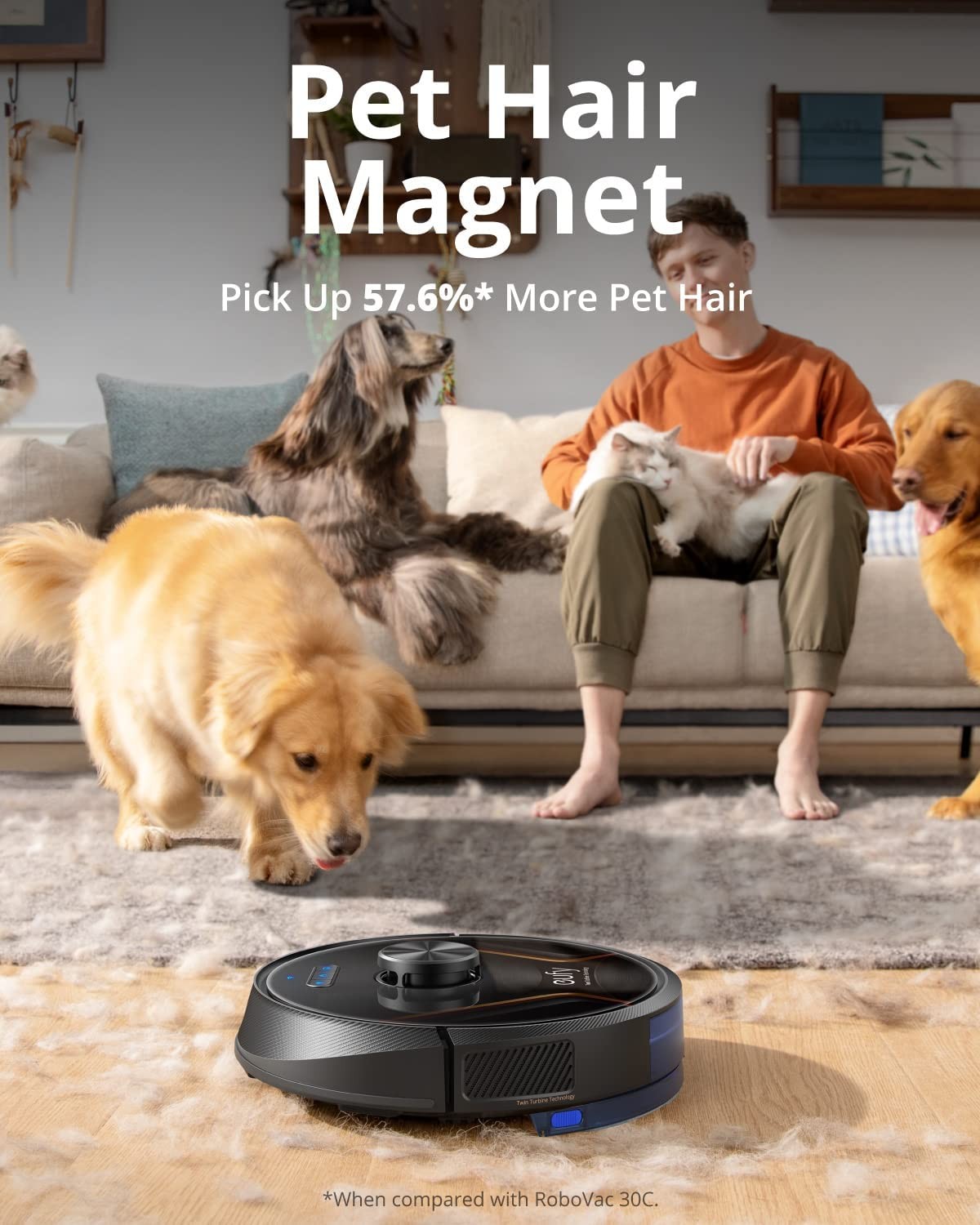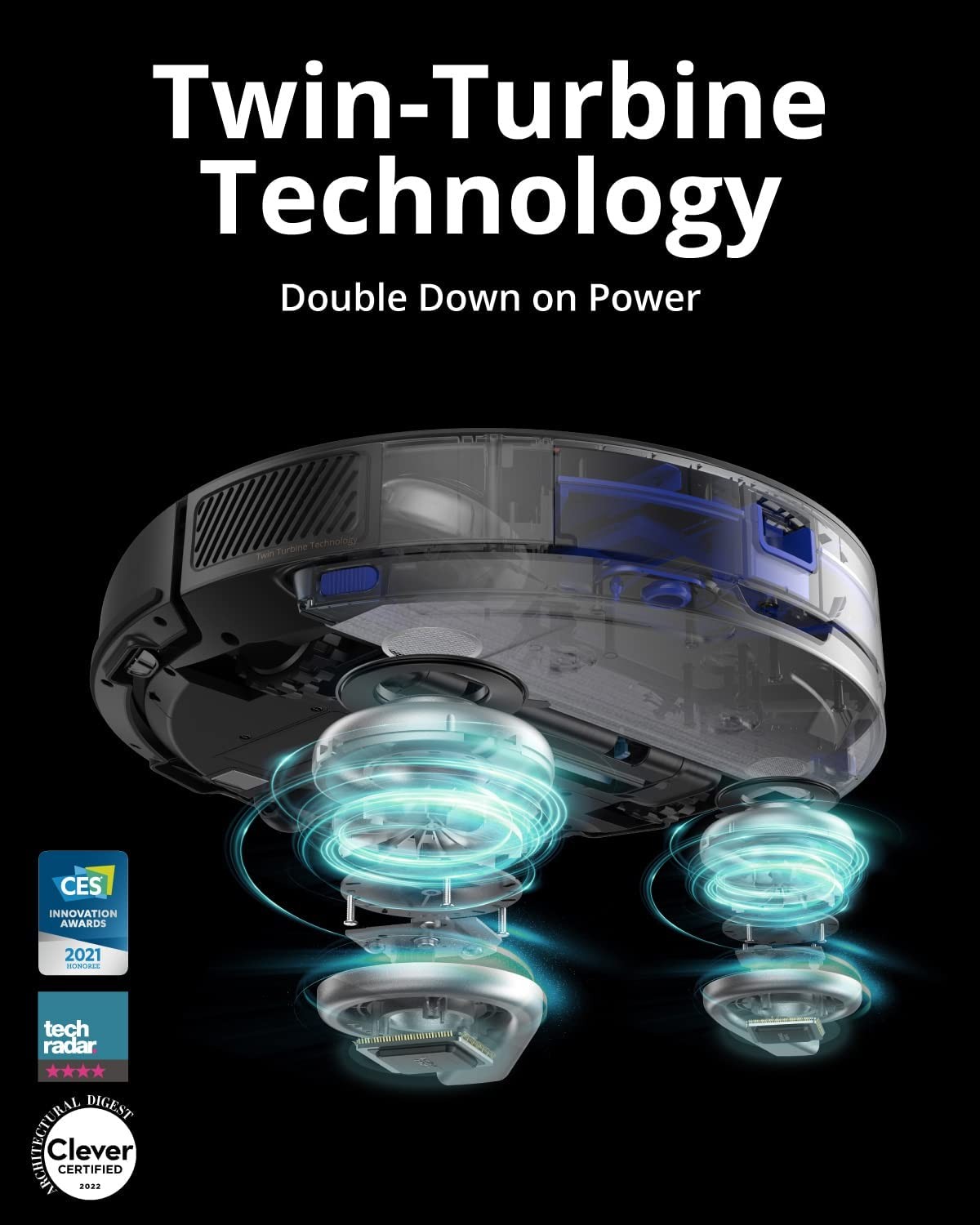 Twin-Turbine Technology: With each turbine generating 2000 Pa of suction power, RoboVac X8 Hybrid creates up to 80% more airflow* to pick up more dust, debris, and pet hair from every corner of your house. *When compared to eufy´s single-turbine robotic vacuum.
