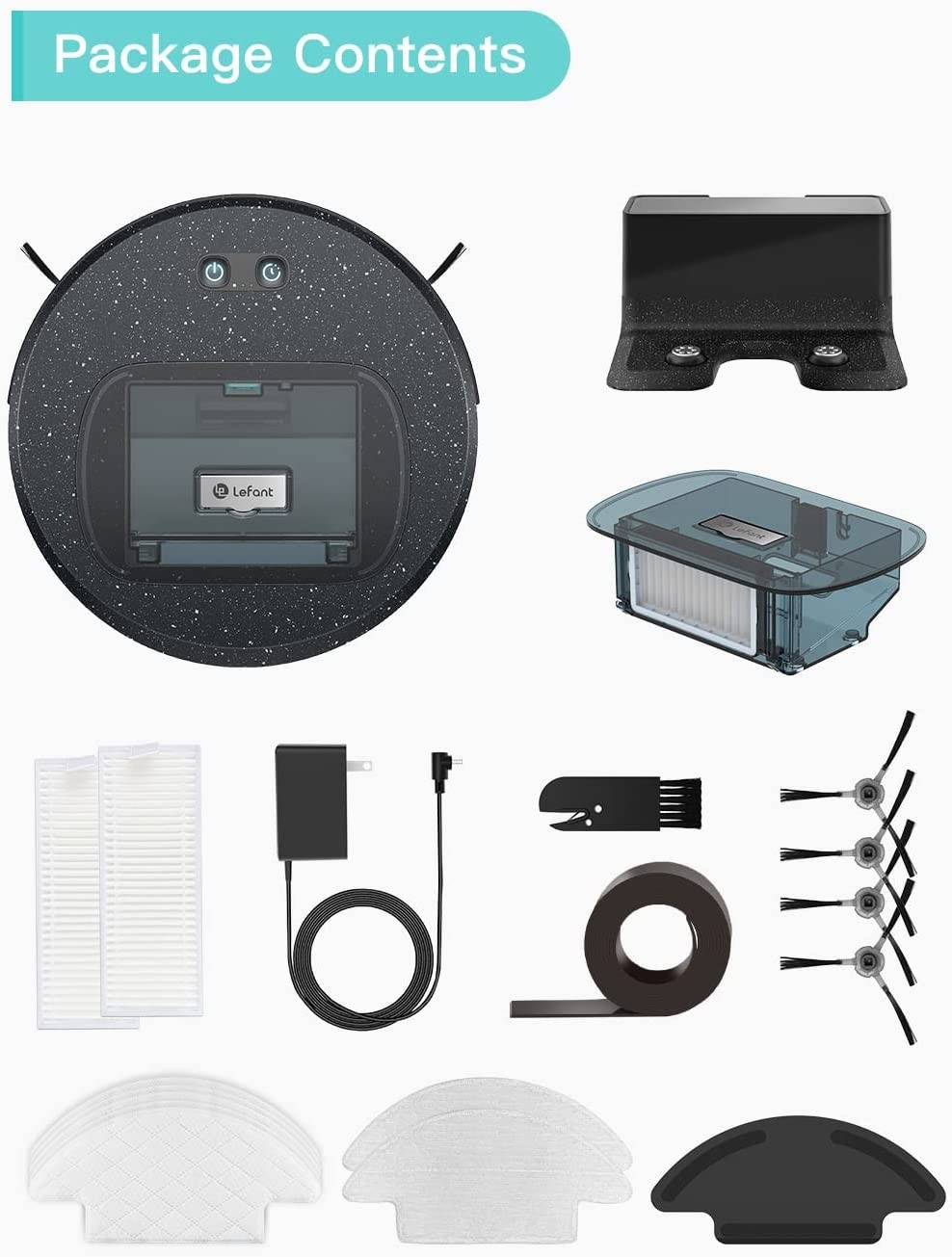 ✅【What will you get】: Lefant-F1 vacuum and mop robot with wiping function, 1* charging station, 1* adapter, 1* dust box, 4* side brush, 2 HEPA filters, 1* users manual, 2* washable dry cloth, 10*disposable wipes, 1*2m magnetic strip and our 12-month worry-free warranty.