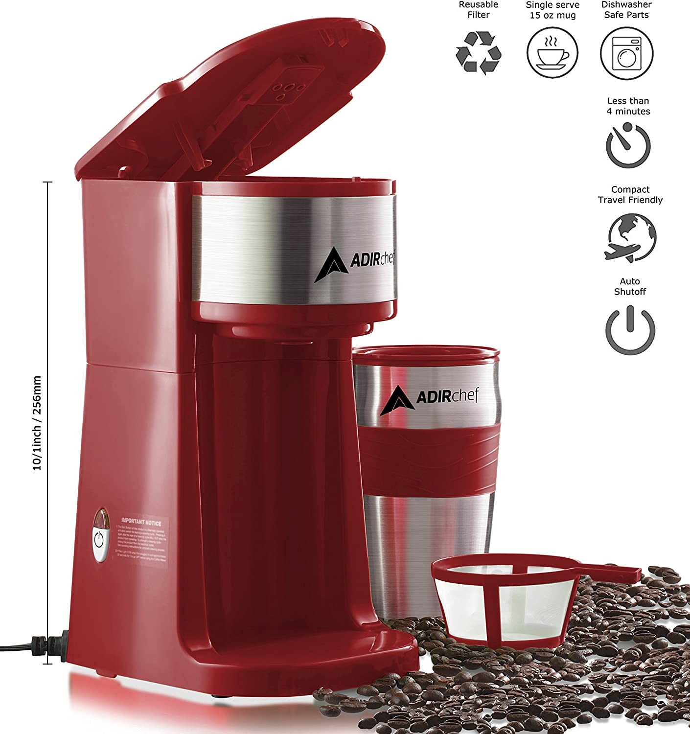 AdirChef Single Serve Mini Travel Coffee Maker & 15 oz. Travel Mug Coffee Tumbler & Reusable Filter for Home, Office, Camping, Portable Small and Compact for Fathers Day (Ruby Red)