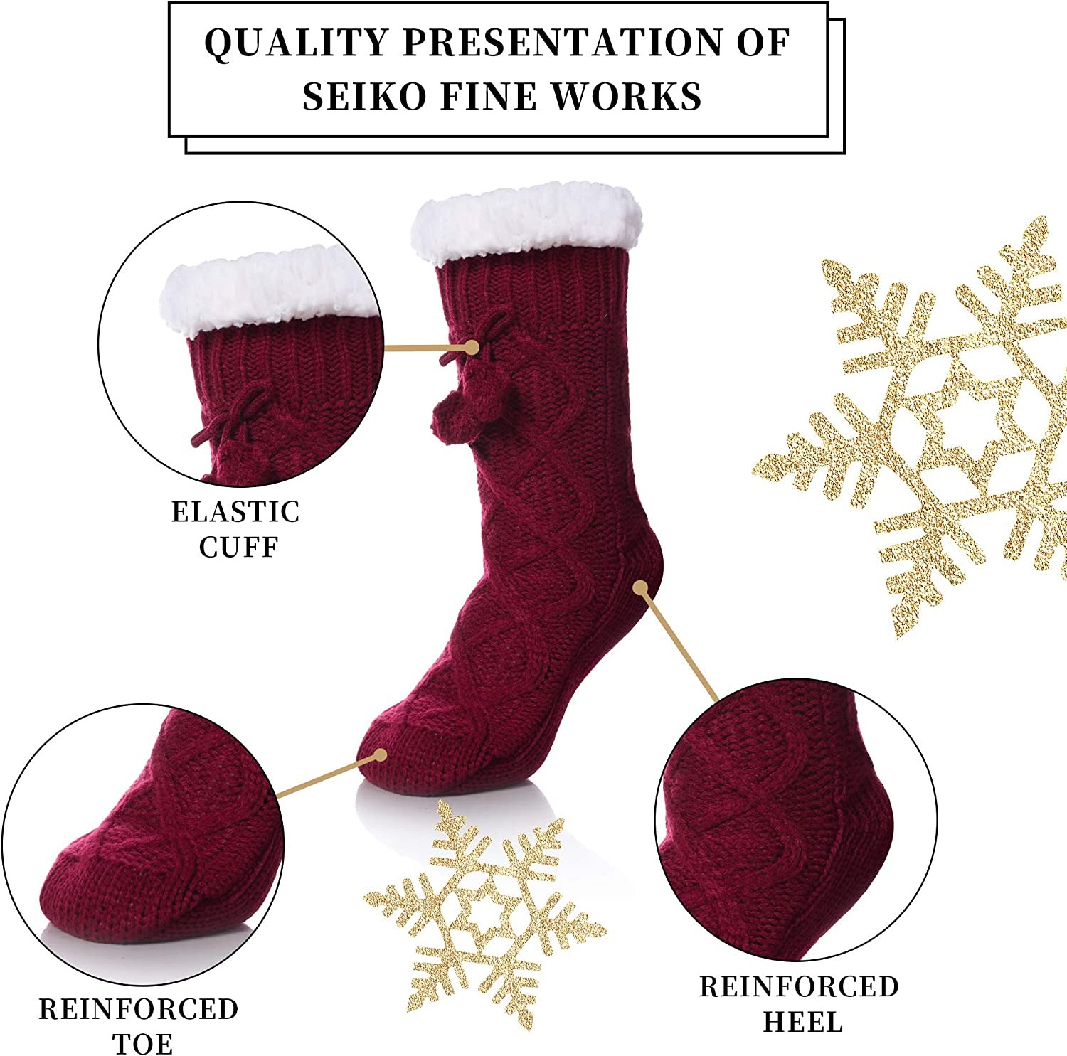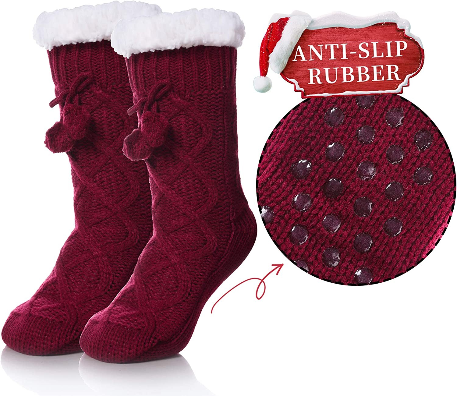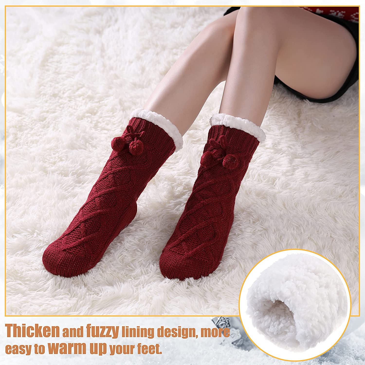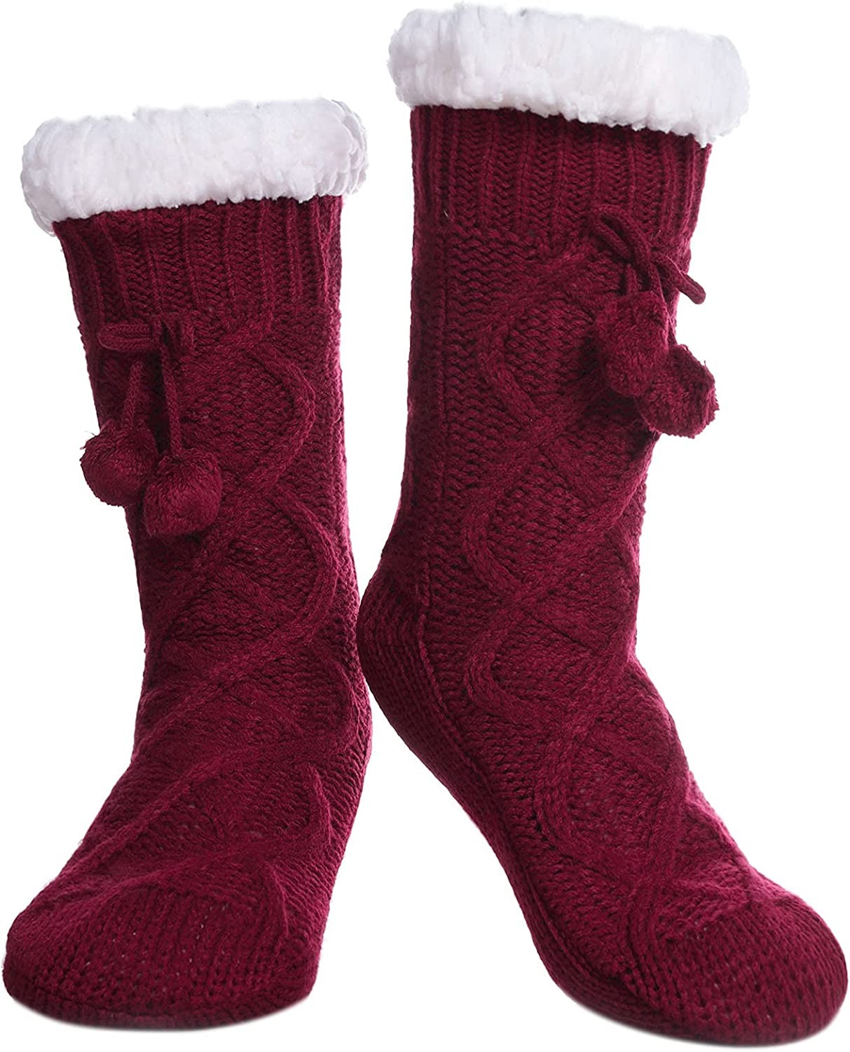 SOFT & COMFORTABLE – Made of ultra-soft acrylic yarn, lined with plush faux sherpa shearling and featuring non-skid tread. Slip them on, kick back and enjoy the amazing comfort of these Slipper Socks after a long day of work. ONE SIZE - Women's Shoe Sizes 6-10 .Faux fur slippers are made with a woven blend of 90% acrylic 9% polyester 1% spandex. WARM SOCKS FOR WINTER - Our winter socks are made of superior quality and ultra-soft premium material that is hand selected to ensure high breathability along with Sherpa fur that is both warm and resistant to wear. These breathable slipper socks keep the warmth enclosed in the sock to keep you comfortable and cozy while ensuring that you and everyone else has a good fun time. WOMENS NON-SKID SOCKS: Silicon rubber grips on soles of socks prevent slips and falls on smooth floors. Great socks for kids or the elderly to prevent falls, all while looking stylish and comfortable. GREAT HOLIDAY GIFT - Ladies love the designs and comfort of premium well-made fluffy cloud socks! These are not regular boring socks, but instead will be worn by her when she needs it most - when her feet are coldest on those chilly mornings, she will think of you!