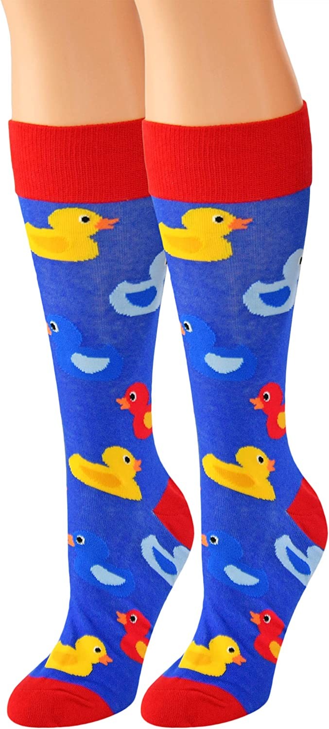 CUTE GRAPHIC SOCKS: These cute and colorful socks feature a fun design with a cartoon-style rubber duck pattern. With blue, red, and yellow ducks, our long novelty socks will be a hit no matter where you wear them! Add them to your sports gear to bring a pop of color to the next big game, or wear them at home for the relaxing break you deserve.