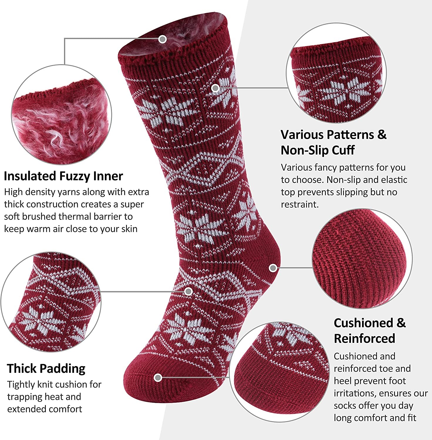 SUPERIOR COMFORT: Warmer Than Regular Socks! Extra Full cushion throughout foot and leg delivers added heavyweight for extra comfort. These luxurious socks have heavily brushed fuzzy linings for soft and comfy; Ribbed stay-up tops to keep socks from sliding down; Max Strategic Cushioning place around the Instep/Shin/Ankle to reduce foot pain during winter games or daily activities. Reinforcement in heel and toe provide durability in high stress areas to dramatically in improve product life.