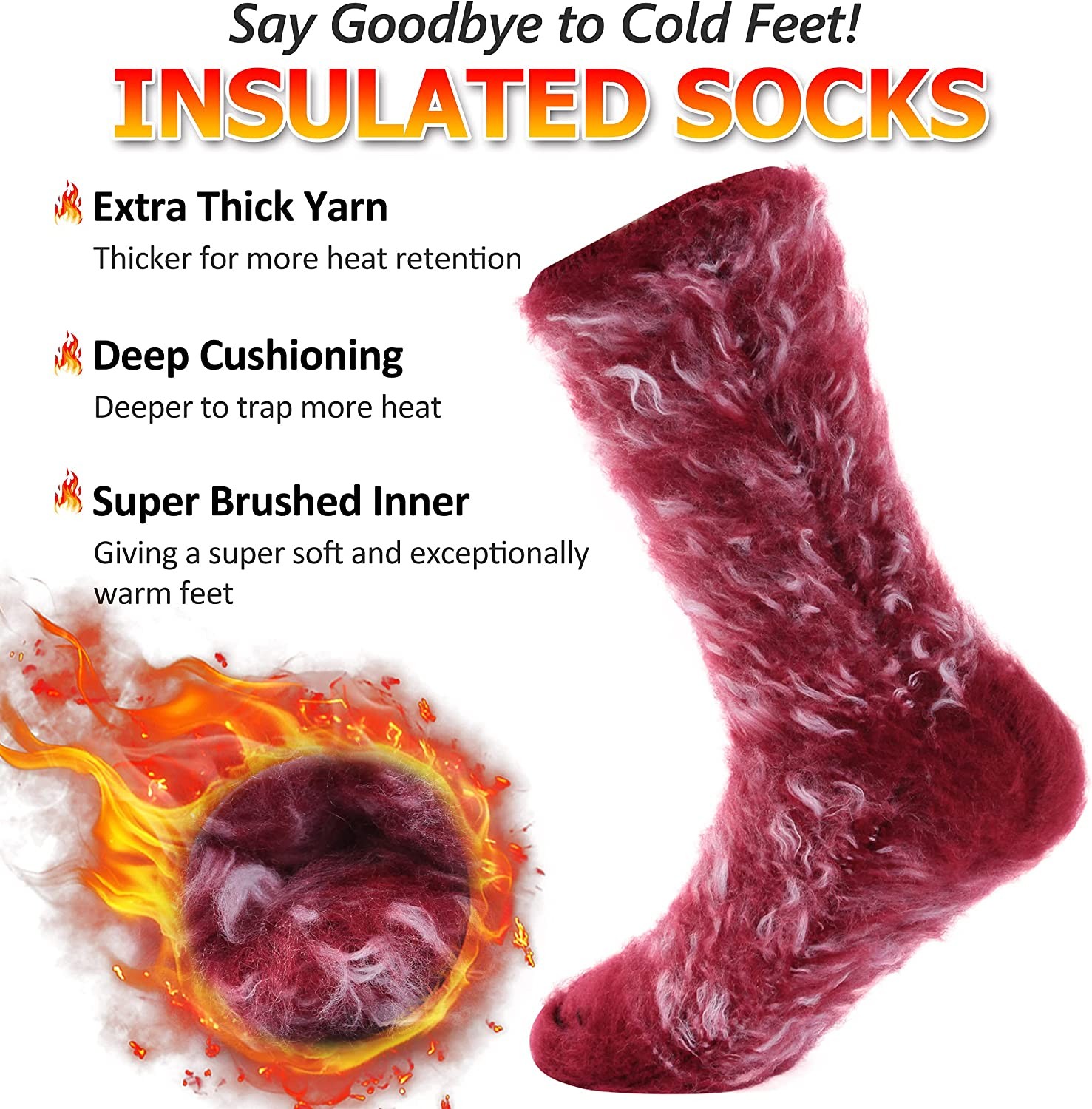 WARMEST & SOFEST: Winter Extreme Thick Thermal Warm Socks for men & women. The insulated heated socks have been specially designed to keep your feet warm even when the temperature outside is way too low. The special high-tech fibers with a high level of heat insulation would enclose more of your own body heat. Keeps feet warmer for longer. Our heavy crew socks are strong and durable enough to keep your skin cozy. They are softer than wool. The warmest thermal socks imaginably. NO MORE COLD FEET