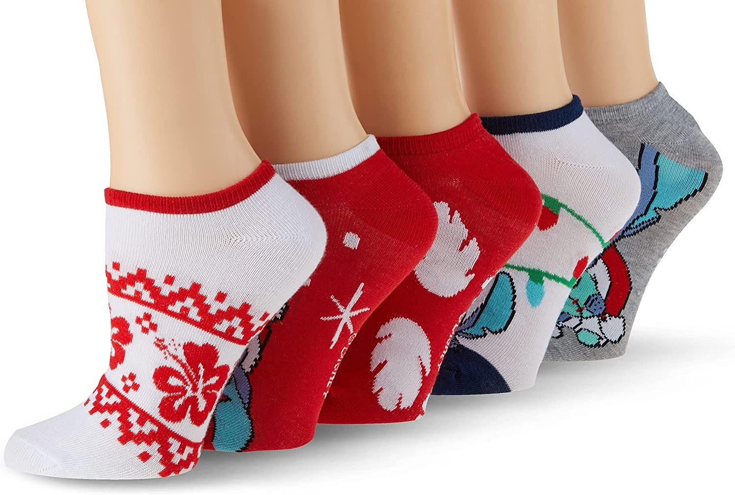 DISNEY SOCKS FOR WOMEN: These classic Disney character socks are officially licensed Disney merchandise featuring adorable, detailed graphics of your favorite Disney characters. Our cute socks for women fit sock sizes 9–11 and shoe sizes 4–10.5. Disney Lilo & Stitch Christmas Themed Socks. CHARACTER SOCKS: Rock your favorite character socks for a comfortable stylish look that will complete any outfit. With 5 Lilo & Stitch themed pairs in a pack, you'll have lots of options to love. COMFORTABLE MATERIAL: These socks are made from high-quality breathable fabric that is 98% polyester and 2% spandex. These durable, fun socks are very comfortable and stretch over the foot as they are pulled on. They stay in place nicely and have a no-show cut. EASY TO CARE FOR: These character socks are machine washable and easy to care for. Turn them inside out before washing to preserve the graphic design, and wash in cold water. Tumble dry, and you will be ready to wear these fun socks again in no time! THE PERFECT GIFT: These classic Lilo & Stitch socks make the perfect gift for any adult. They feature fun, detailed graphics and are well constructed. Our novelty socks are great for any occasion!