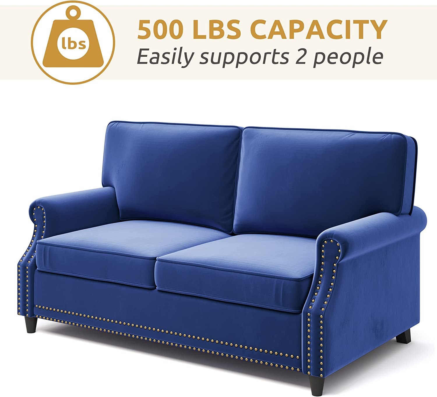 Superb Material: Fabric, (100% polyester) brings a Touch of distinctive soft feeling. Overall Dimensions: 64.5*33.5*36"(L*D*H); Seating Capacity: 2; Weight Capacity: 250 lbs/Seat; Assembly Required. Considerate Design: Use the premium velvet material to chase for the better skin touch while the high-density sponge filler make you feel relieved. The supportive seat cushions and backrest balance softness and durability, so you can easily feel ease and relax. Nailhead Accents: Expertly styled, this sofa has tasteful nailhead accents on the front end of the scrolled arms to draw the eye in and complement the deep button tufting. Each nailhead is individually applied for a beautiful, hand-crafted touch. Individual Seat coushions: With individual seat cushions, plumped with your comfort in mind, this loveseat is as comfortable as it is stylish, if not more so. The individual cushions ensure that each person seated on the loveseat gets the full amount of comfort possible. Easy to Assemnle:A detailed instruction manual can be obtained by opening the package.A complete installation kit, easy-to-follow instruction manual and numbered parts help you quickly and easily partially assemble our sofa in 20`30 minutes.