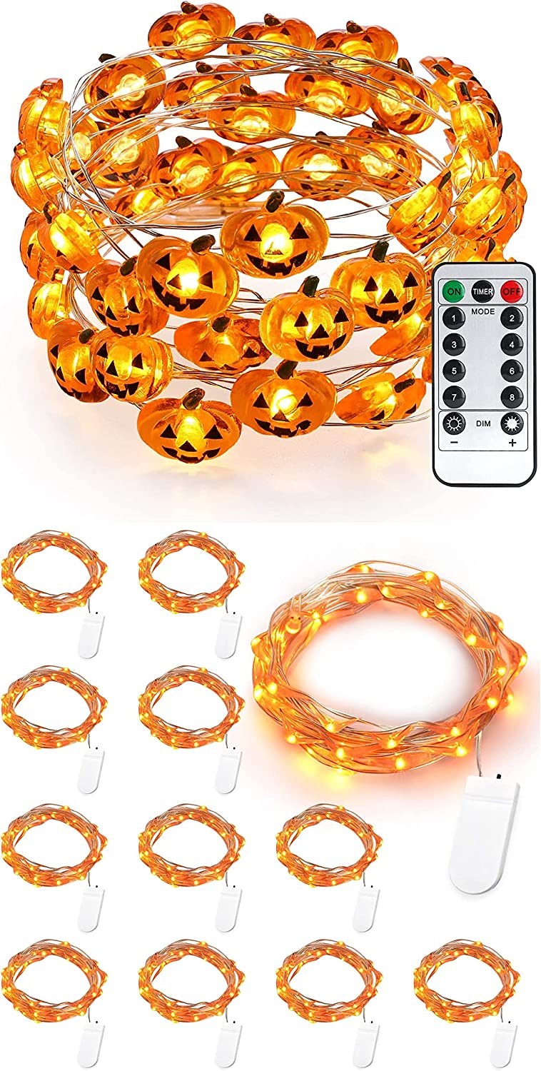 Pumpkin Halloween String Lights with Remote 8 Lighting Modes: Various lighting modes available, including combination, in wave, sequential, slo glo, chasing/flash, slow fade, twinkle/flash, steady on. Create various spooky Halloween atmosphere. Pumpkin Halloween String Lights with Remote Remote Control: Brings you great convenient operation with remote control included. 8 modes selected, brightness adjustment and timer function, all can be done through the remote. 12 Pack 20 LED Orange Halloween Fairy Lights: adorable 12 pcs string lights in one pack, each has 20 LED on 7. 2Ft(0. 98Ft lead cable included), LED bulb spacing 0. 32Ft, illuminating orange light, super bright orange lights for holiday decorations. 12 Pack 20 LED Orange Halloween Fairy Lights: apply for ultra thin silver wire, sturdy but soft, can be easily bent into any shape you want or wrap around anything you desire for stunning decorations. Package Included: 1 x Pumpkin Halloween String Lights with Remote , 12 X 20 LED Orange Halloween Fairy Lights