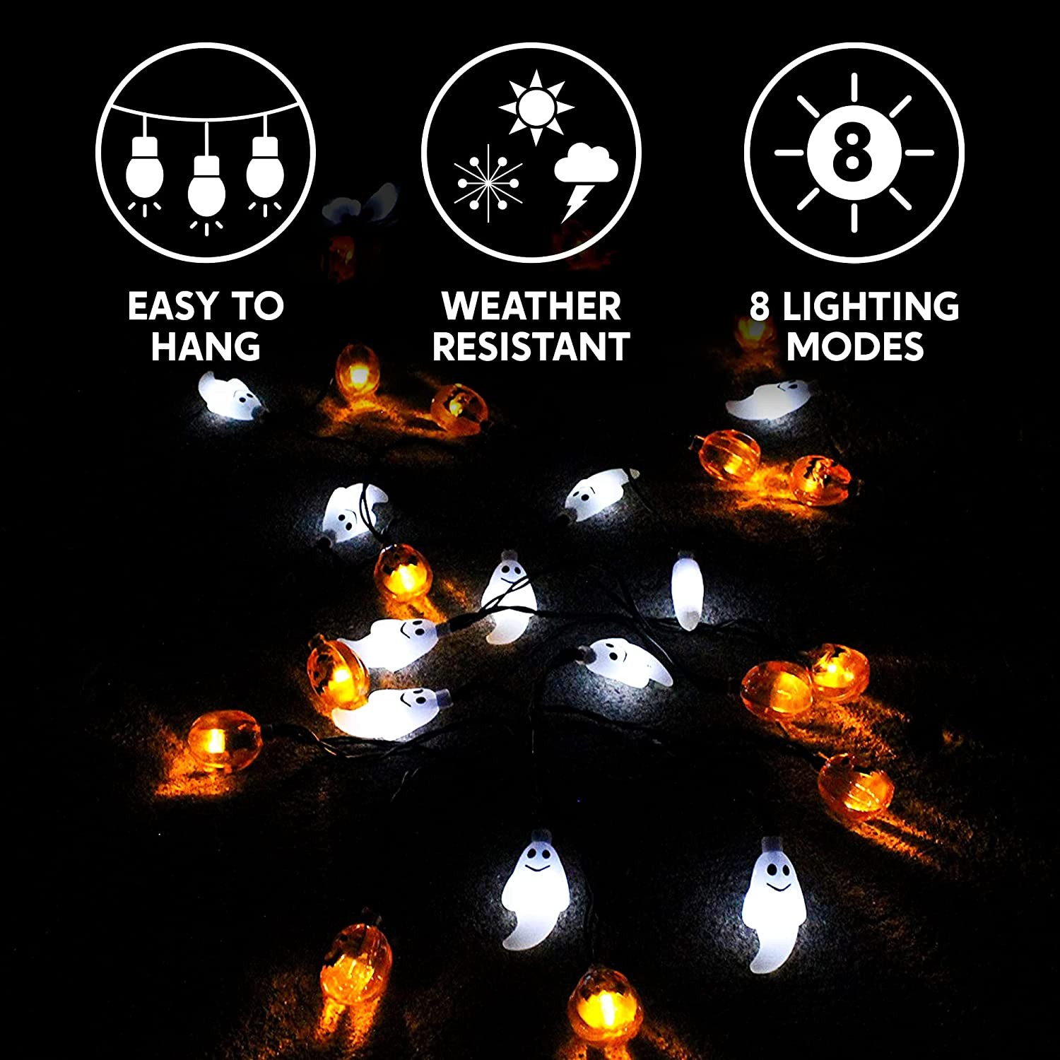BATTERY POWERED. Battery-operated Weatherproof String Lights Can Be Used Indoors or Outdoors. PERFECT HALLOWEEN LIGHTS. Ideal for Halloween Indoor Outdoor Decoration, Halloween Light Show, Trick or Treat Party Decoration. SPECIFICATIONS: 19.7 Feet (4.9 Feet Leading Wire), 30 Ghost and Jack-O-Lantern Pumpkin Shape LED, 8 modes(Steady On, Flashing, Morphing, Switching Colors, etc.) WATERPROOF. Safe and Easy to be Applied on All Different Places, Garden, Roof, Door, Window, Lawn etc. MONEY BACK GURANTEE- "Contact Seller" and we will refund you or ship you a replacement if the one you received fail to work in 90 days.