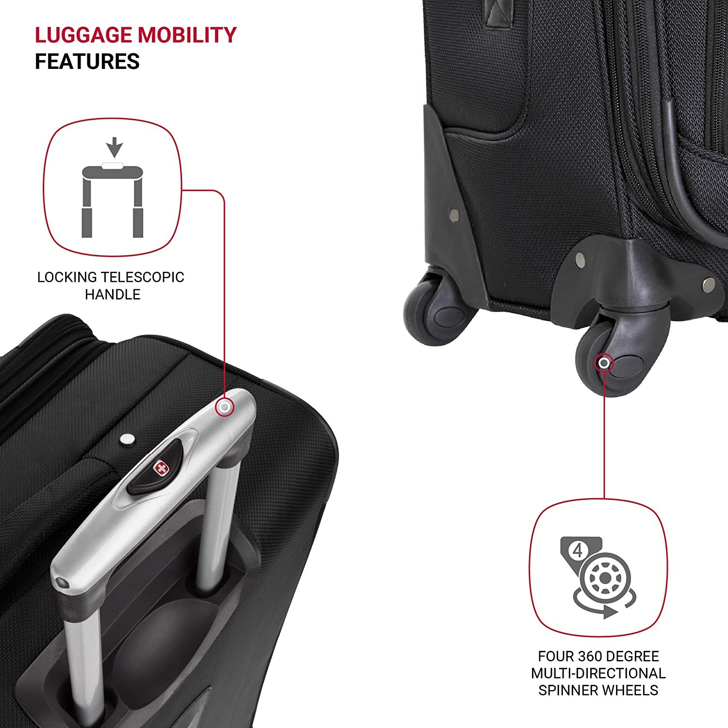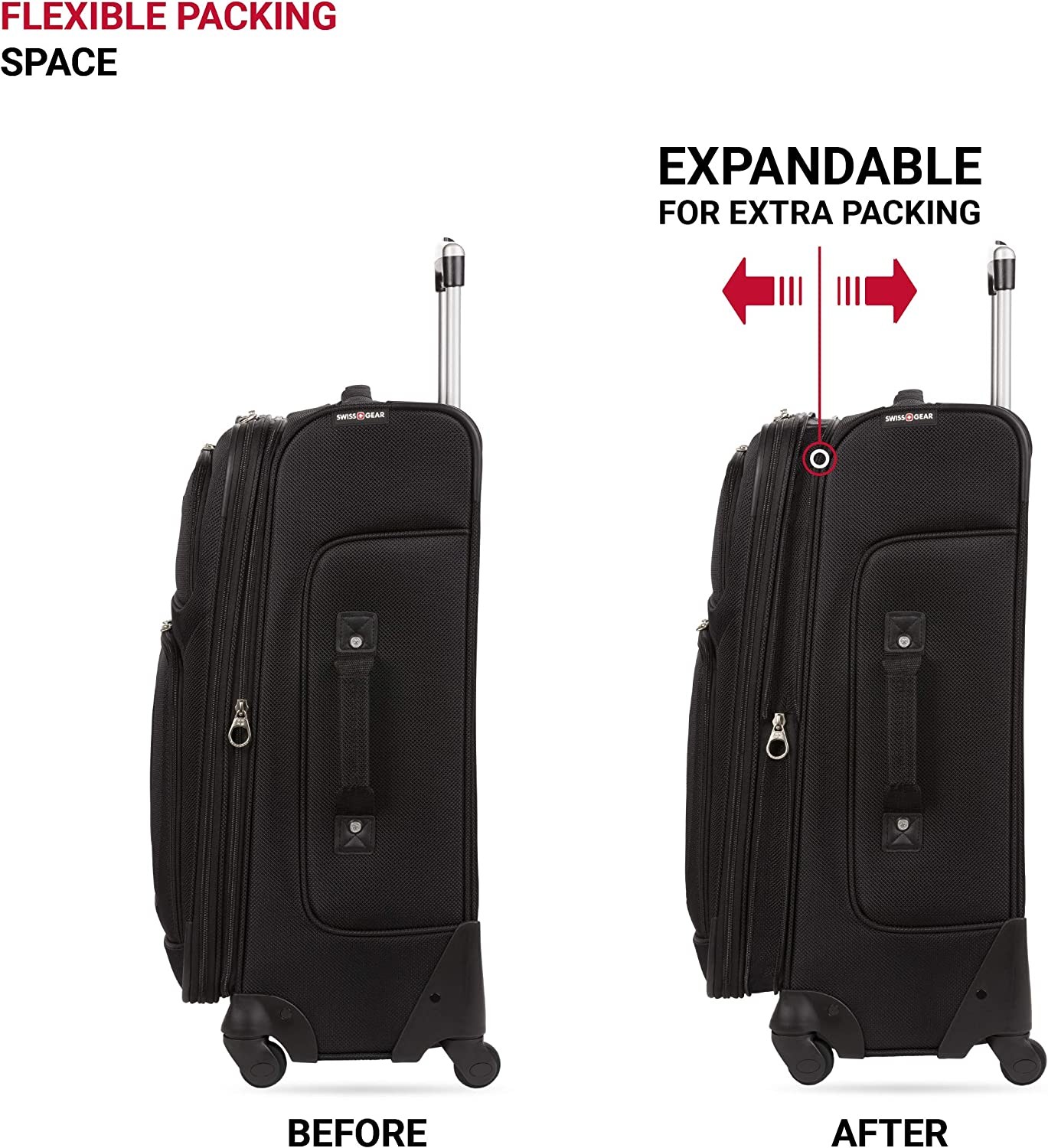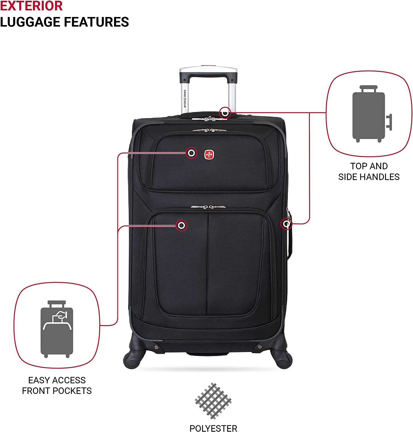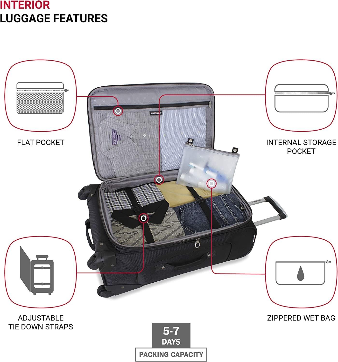 Rolling Suitcase: Get through a crowded airport easily with this stylish check-in luggage with 360-degree multi-directional spinner wheels and a locking retractable push/pull handle Multiple Front Panel Pockets: Featuring front pockets with a built-in ID tag, this ergonomically expandable luggage measures 26.25 x 16.75 x 11 inches including wheels and handles; packing dimensions are 24.5 x 15.25 x 11 inches Secure and Durable: Expandable travel case gives you ample parking space and made from a durable, scuff-resistant polyester fabric with fully lined interior; also features adjustable tie-down straps for securing garments in place Effortless Organization: This luggage bag maximizes packing efficiency with a removable zippered wet bag, large mesh lid pocket, and packing pocket for holding small items and accessories Convenient Side Handles: With reinforced padded top handle with an integrated side and bottom handle, this roller suitcase makes lifting and carrying your luggage easy