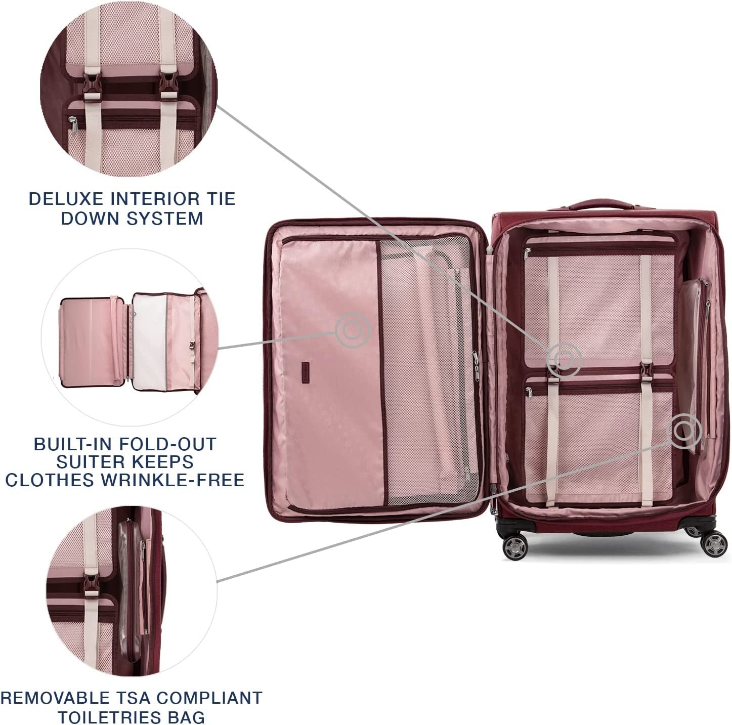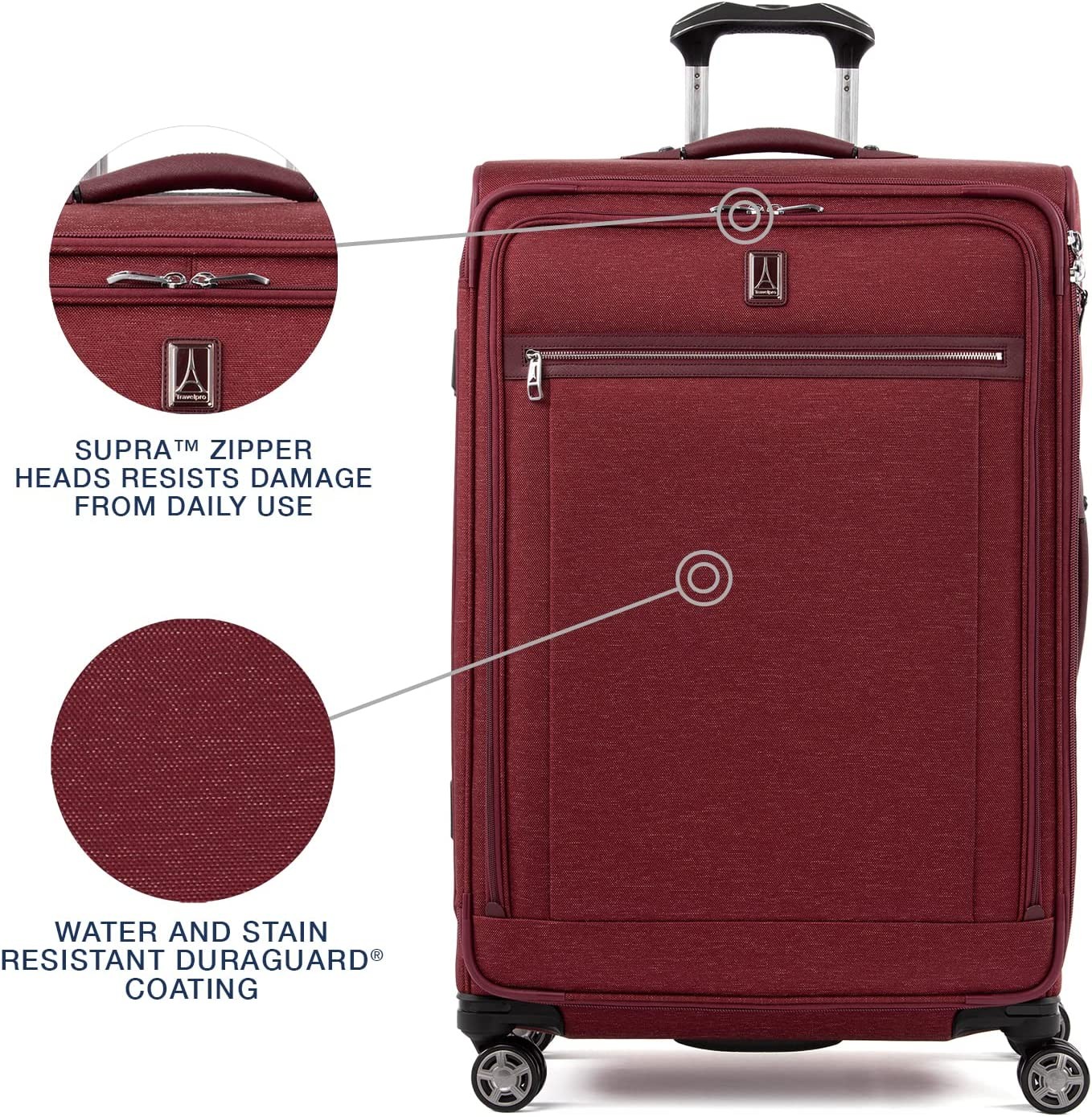 Precision glide system includes contour grip, adjustable 4-stop PowerScope handle and magnatrac spinner wheels for precise control and effortless roll Tip-resistant tapered expansion adds up to 2" packing capacity when needed. High-density nylon fabric with duraguard coating resists stains and abrasions. Supra zipper heads are engineered to resist damage from frequent use and abuse Built-in, fold-out suiter keeps clothes wrinkle-free. Interior tie down system includes built-in accessory pockets. Includes an integrated TSA lock (default lock code is 0-0-0 to open, slide button towards the dial) 66.75 linear inches. Please check with your airline for specific check-in baggage requirements Backed by our built for a lifetime limited worry free warranty. Case Dimensions: 29.5x20.5x12.75 , Overall Dimensions: 32.5x21x13.25, Weight: 11.5 lbs ; VOLUME 143.5L