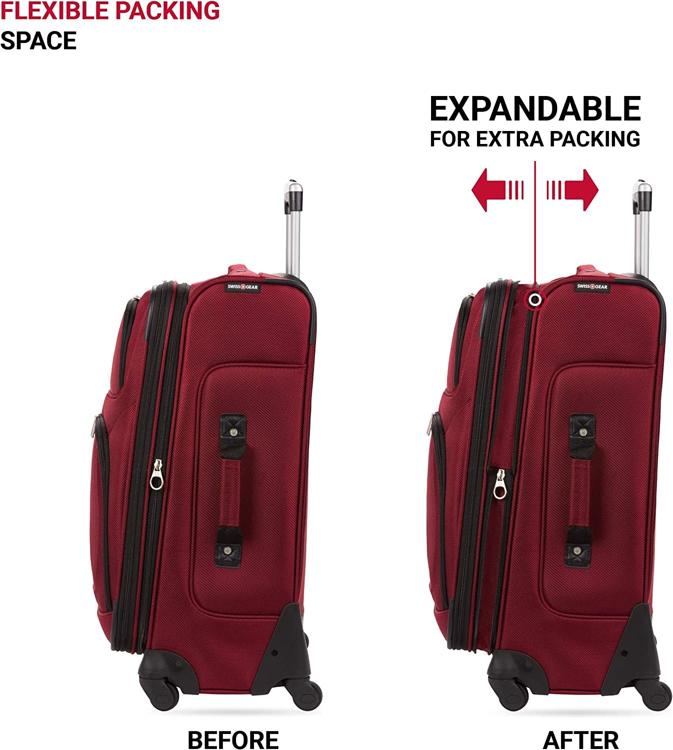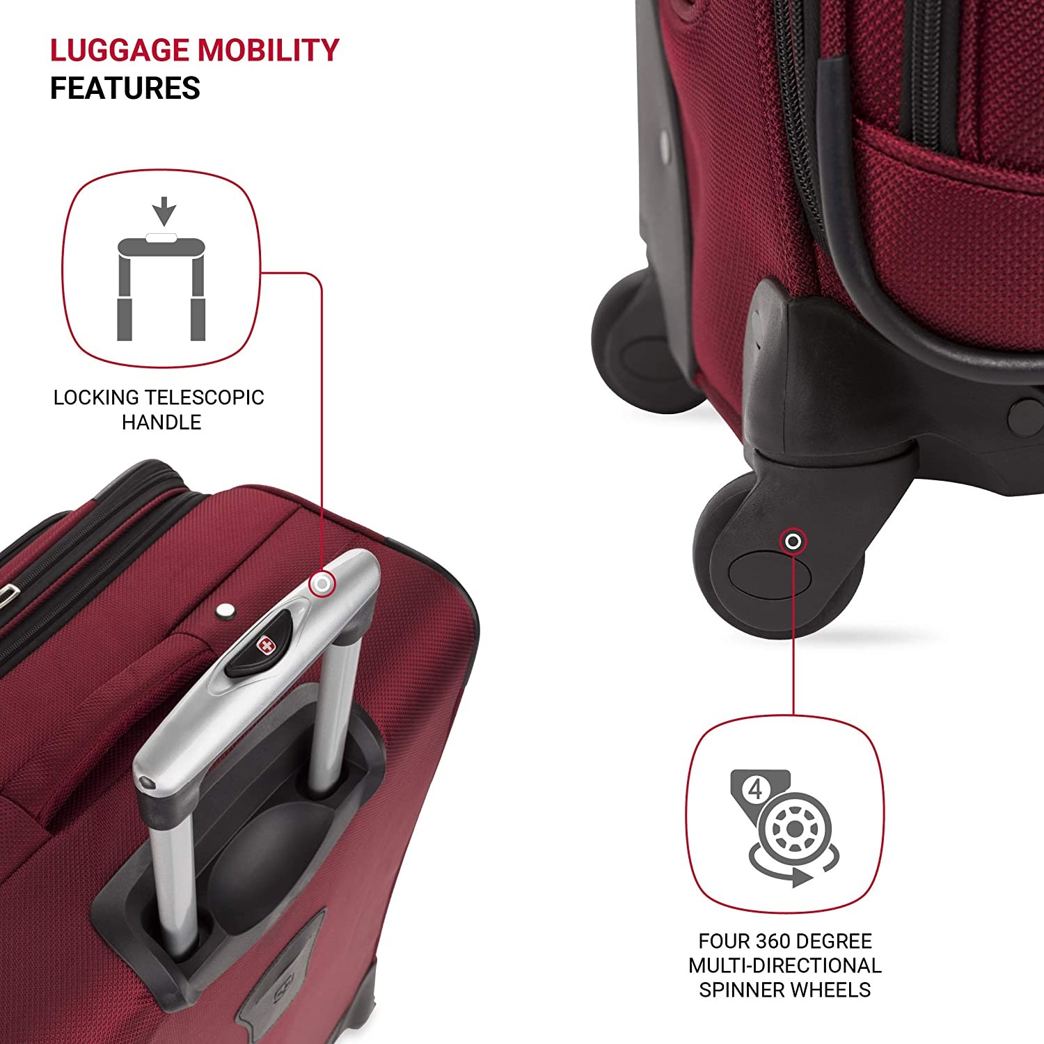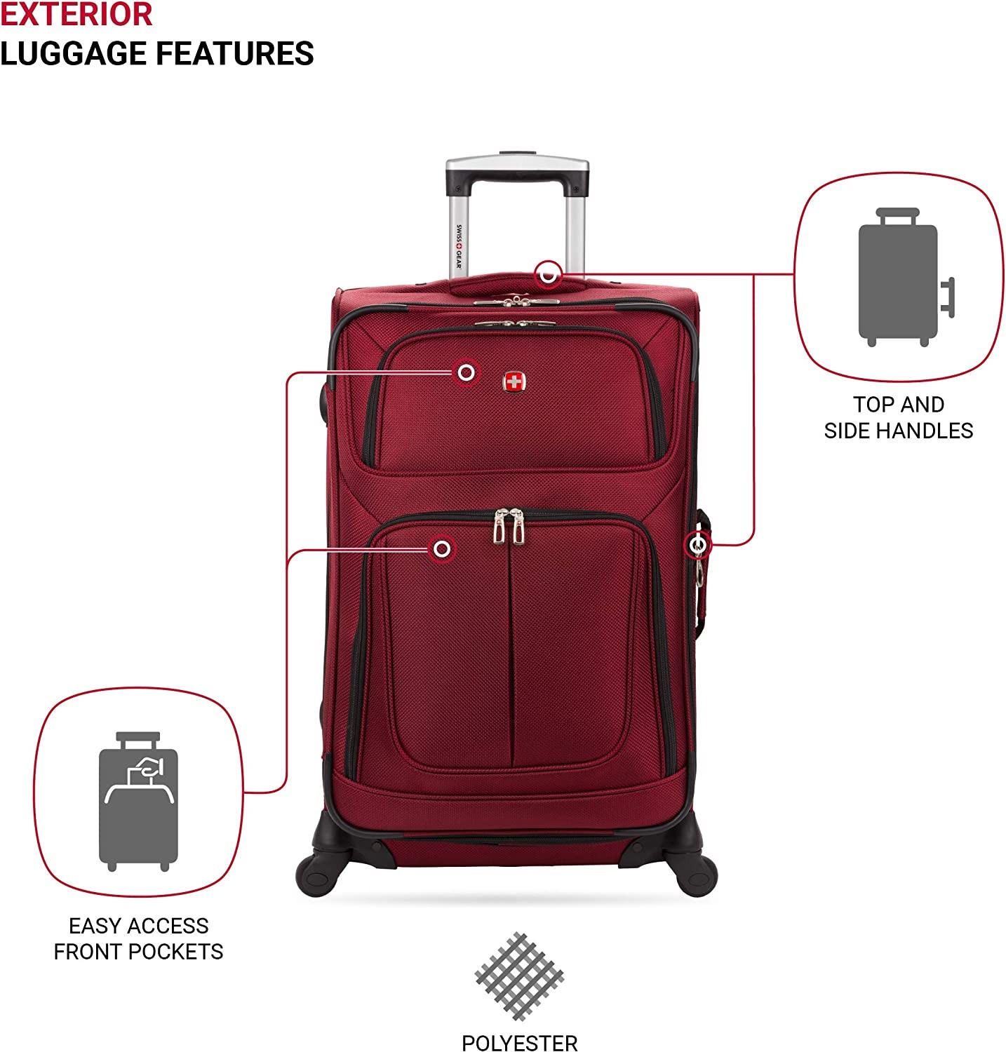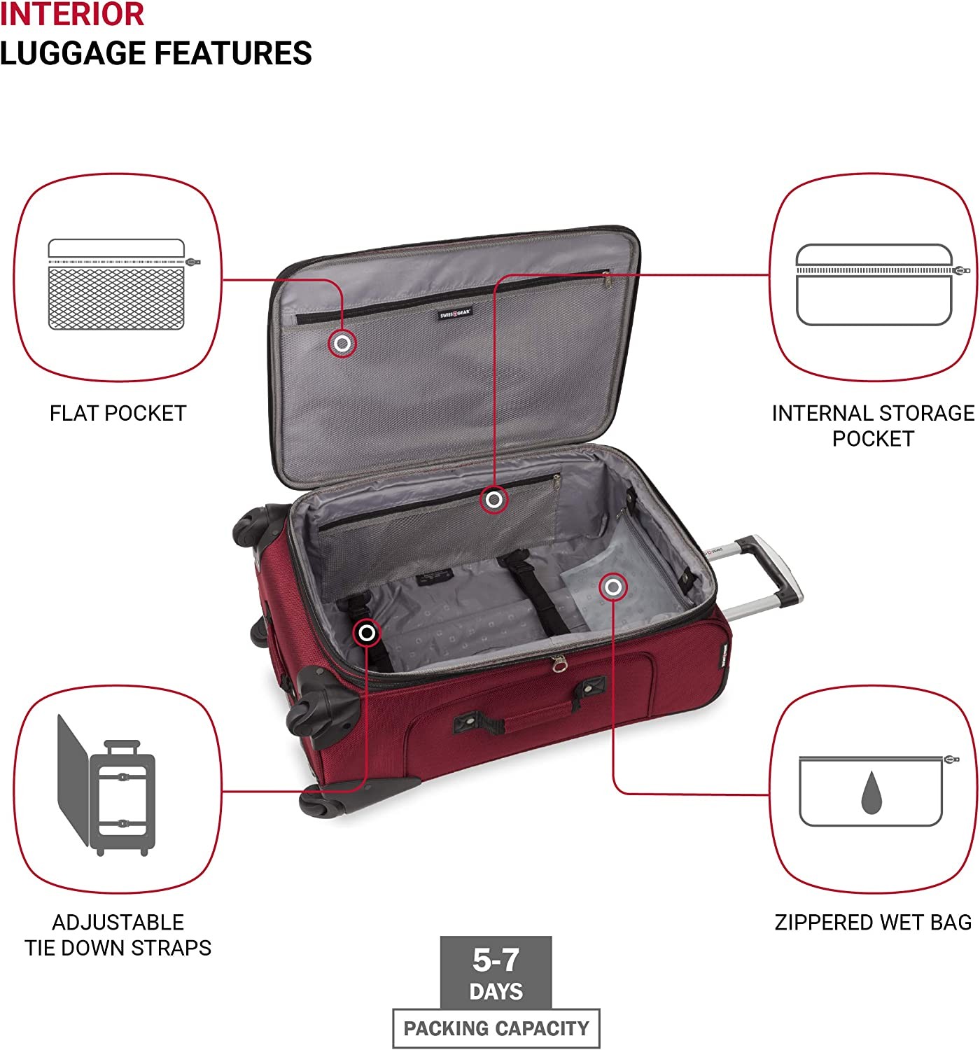 Rolling Suitcase: Get through a crowded airport or down narrow airplane isles easily with this stylish carry-on luggage with 360-degree multi-directional spinner wheels and a locking retractable push/pull handle Multiple Front Panel Pockets: Featuring front pockets with a built-in ID tag, this ergonomically expandable luggage measures 26.25 x 16.75 x 11 inches including wheels and handles; packing dimensions are 24.5 x 15.25 x 11 inches Secure and Durable: Expandable travel case gives you ample parking space and made from a durable, scuff-resistant polyester fabric with fully lined interior; also features adjustable tie-down straps for securing garments in place Effortless Organization: This luggage bag maximizes packing efficiency with a removable zippered wet bag, large mesh lid pocket, and packing pocket for holding small items and accessories Convenient Side Handles: With reinforced padded top handle with an integrated side and bottom handle, this roller suitcase makes lifting and carrying your luggage easy