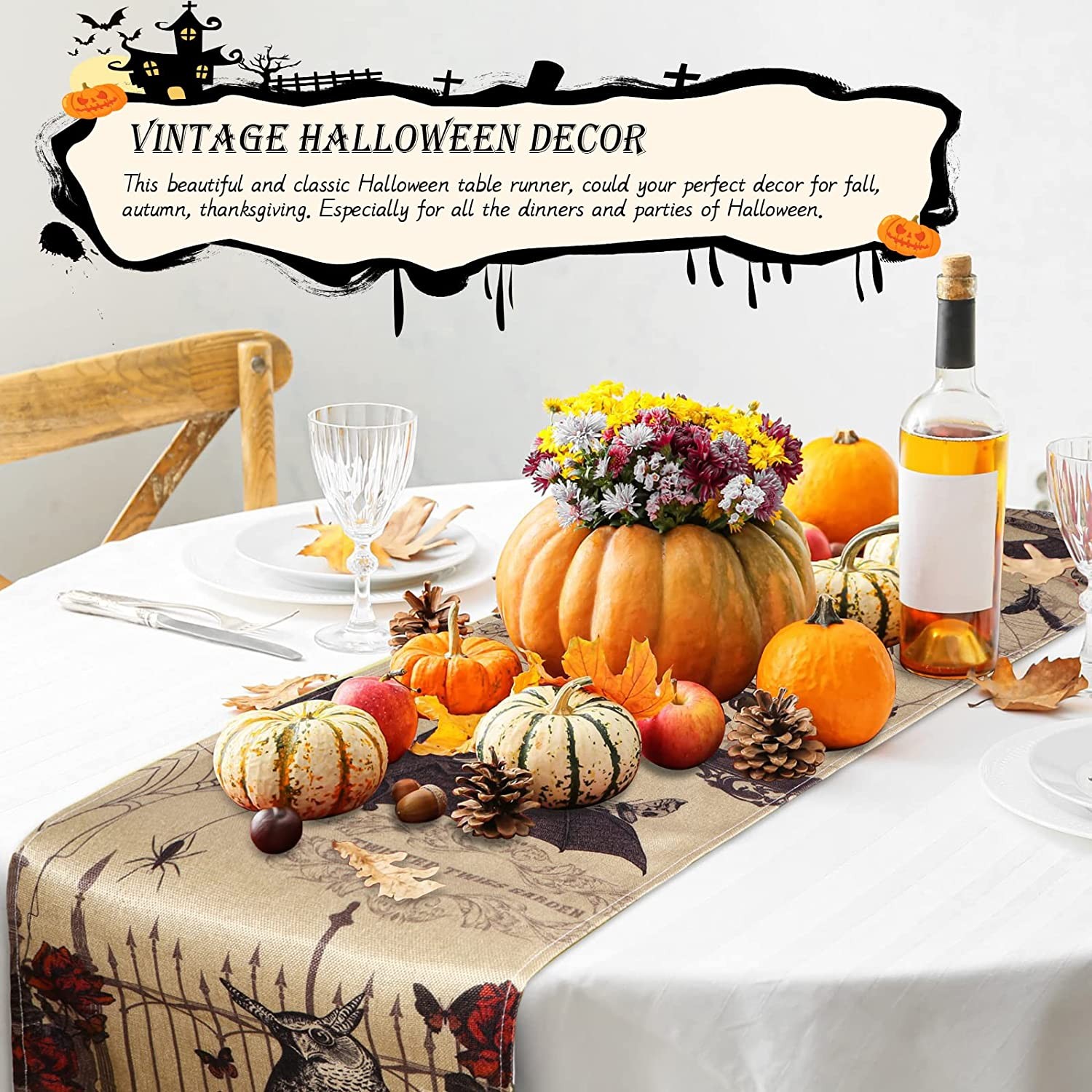 Exquisite and Attractive Design: our Halloween table runner has adopted a gothic haunted halloween theme, well printed with black bats, spider webs, flying owls, butterflies, red flowers and other elements on the retro surface, creating an elegant and horrific atmosphere to your house