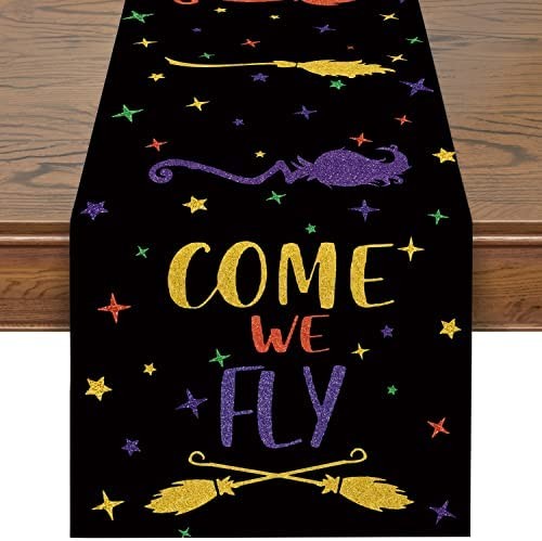 Siilues 150g Thicken Halloween Table Runner, Come We Fly Hocus Pocus Broom Halloween Decorations Seasonal Fall Holiday Decor for Indoor Outdoor Halloween Party Dining Table Decor (13" x 48")