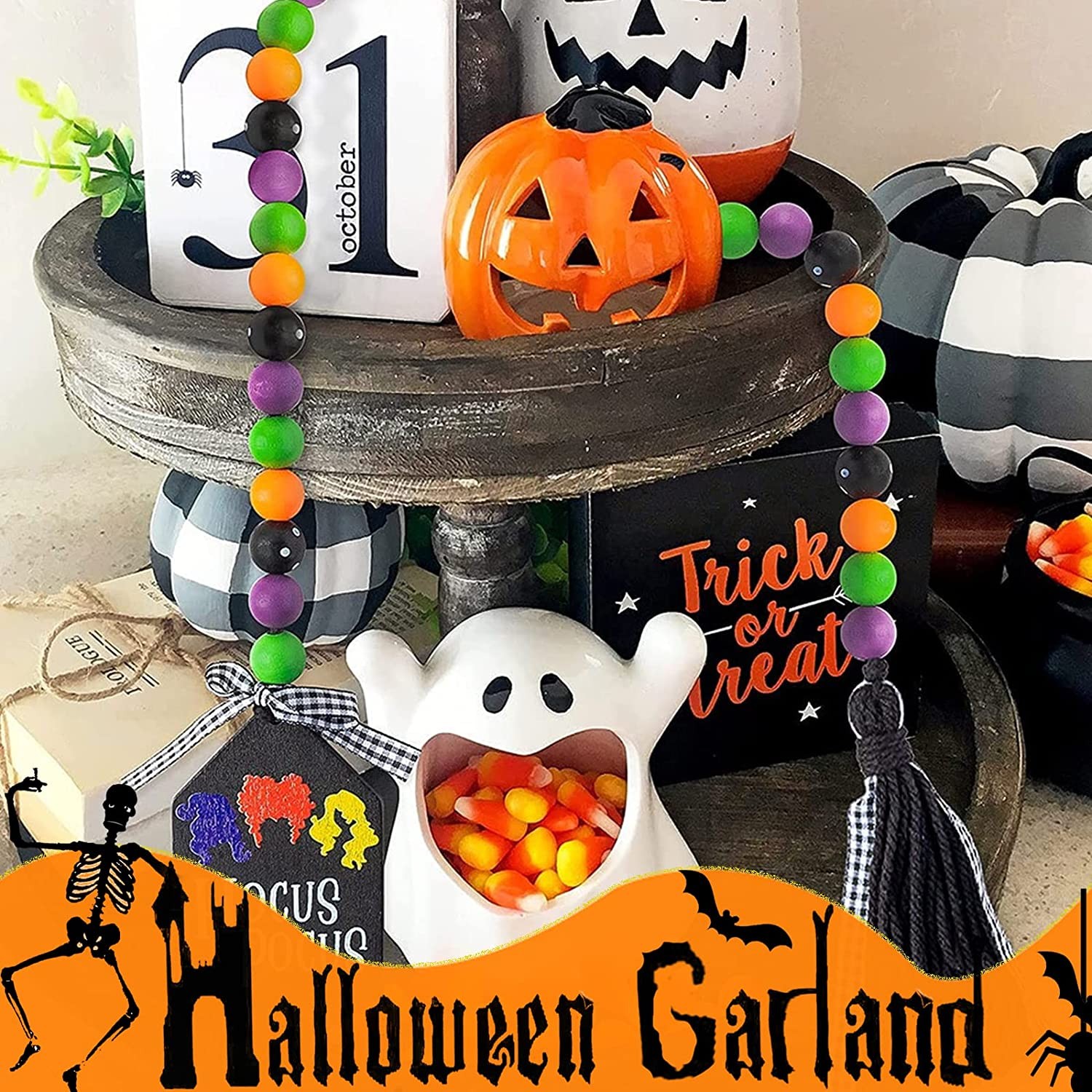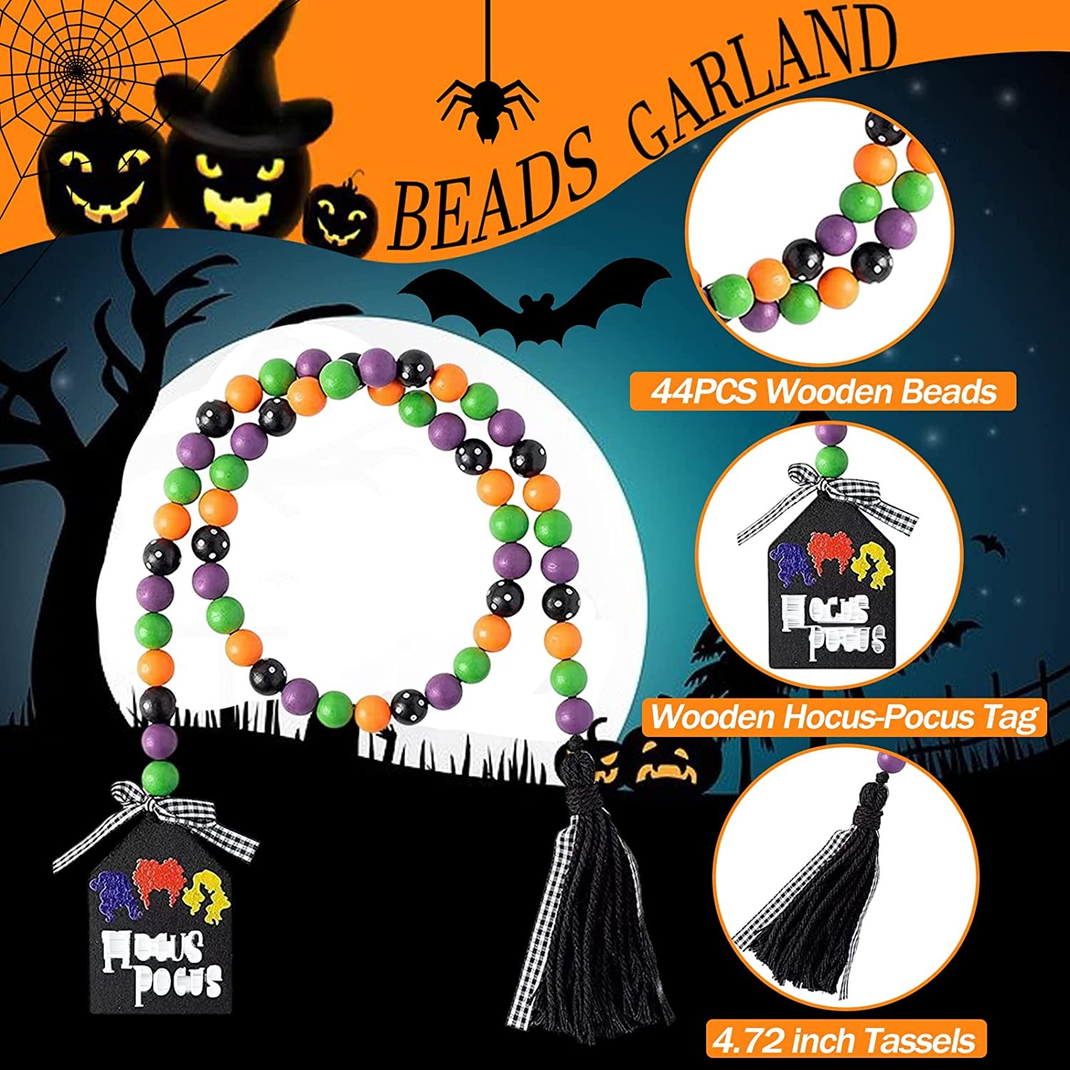 Halloween Wooden Bead Garland Decor: One long 33" Halloween wooden beads garland come in one package, made up of 44PCS beads in 4 colors, one end knotted with tag ornament, the other end decorated with black cotton rope tassels and plaid braid. Classic beads decor designed to add more Halloween atmosphere in your house. Dimension: The Halloween wood beads garland with tassel measures 33 inches in total length( With 4.72 inches tassel and 3.54 inches tag. Perfect size of Halloween adornment adding pleasant and warm atmosphere for your house. Suitable for decorating your farmhouse rustic tiered tray, fireplace, wall and so on. High-Quality Material: These wooden beads and tag decor are made of natural wood material, odorless, smooth and comfortable to touch. And the decorative tassels are cotton made, the thread to string the beads adopting Jute Rope, not easy to crack. Our Halloween wooden bead garland is durable & reliable, still shiny & non-fading even after years of use. Wide Application: These Halloween tiered tray decors can’t be better decoration hanging on fireplace, mantle, tiered tray, farmhouse, table centerpiece, door handles, window, walls, tree. Eye-catching ornament to put in your house, directly feeling the excitement of the Halloween day. Beaded Garland Decor: These fall farmhouse wood bead garlands feature harmonious Halloween colors in pumpkin orange, dark in white dots, dark purple and green. Designed with eye-catching tags and classic black tassels, well expressing the welcome to Halloween Day. Also, could as Halloween theme party decoration gift, bringing more happy Halloween vibe to their houses.