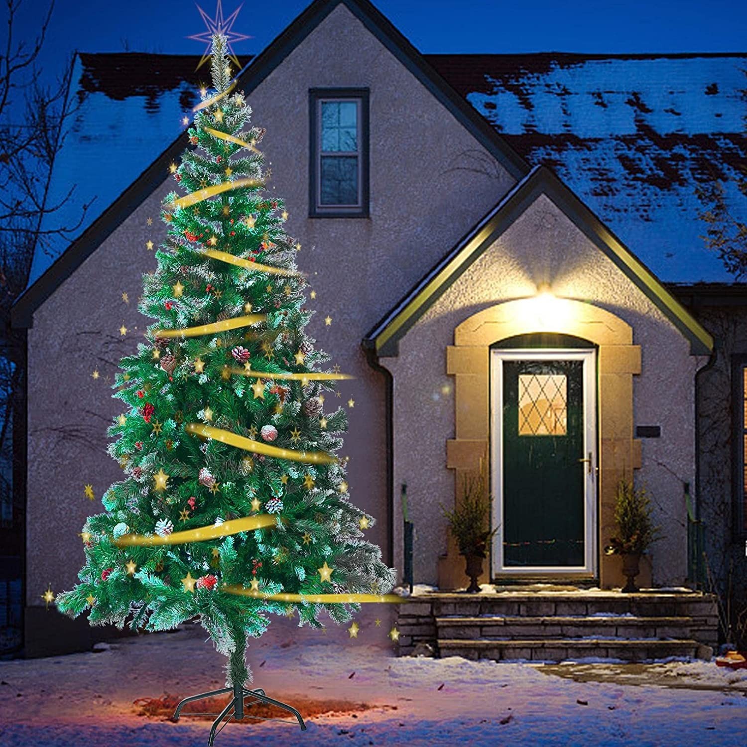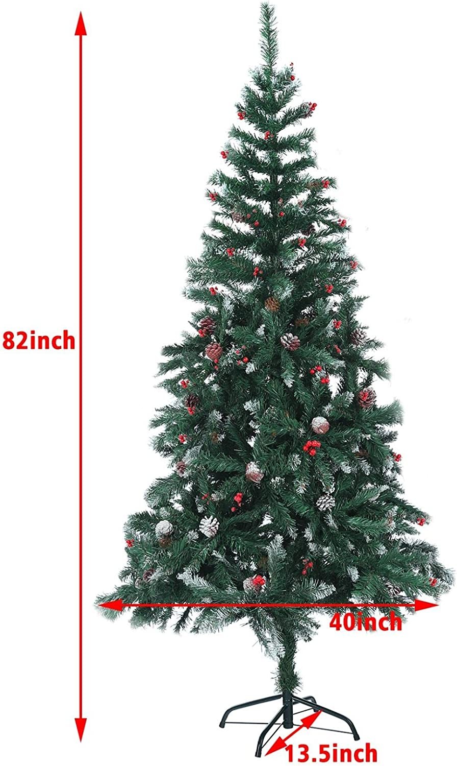 【Realistic Looking Tree】This Christmas pine tree with carefully crafted flocking snow design, green branches with pine cones and red berries, the overall color matching is bright, making the Christmas tree look richer and warmer, and making your family full of Christmas atmosphere 【Quick & Easy Assemble】Assembly and disassemble is quick and easy. And this christmas tree has plenty of space. Shape it at first then you can add other ornaments and gifts. 【Eco-friendly Material】The blades of our christmas tree are made from high quality PVC material, anti-deformation,waterproof and suitable for outdoor,allowing you to make the most of it year after year. 【Metal Stand】Soloven christmas tree uses metal stand instead of plastic stand, and add plastic cover on the end. Adding the stability of the tree,helping the tree stay straight in the wind and protecting your floor. 【100% SATISFACTION GUARANTEE】Upgraded package to avoid damages during shipment. Our professional customer service team will address your any concerns within 24 hours.