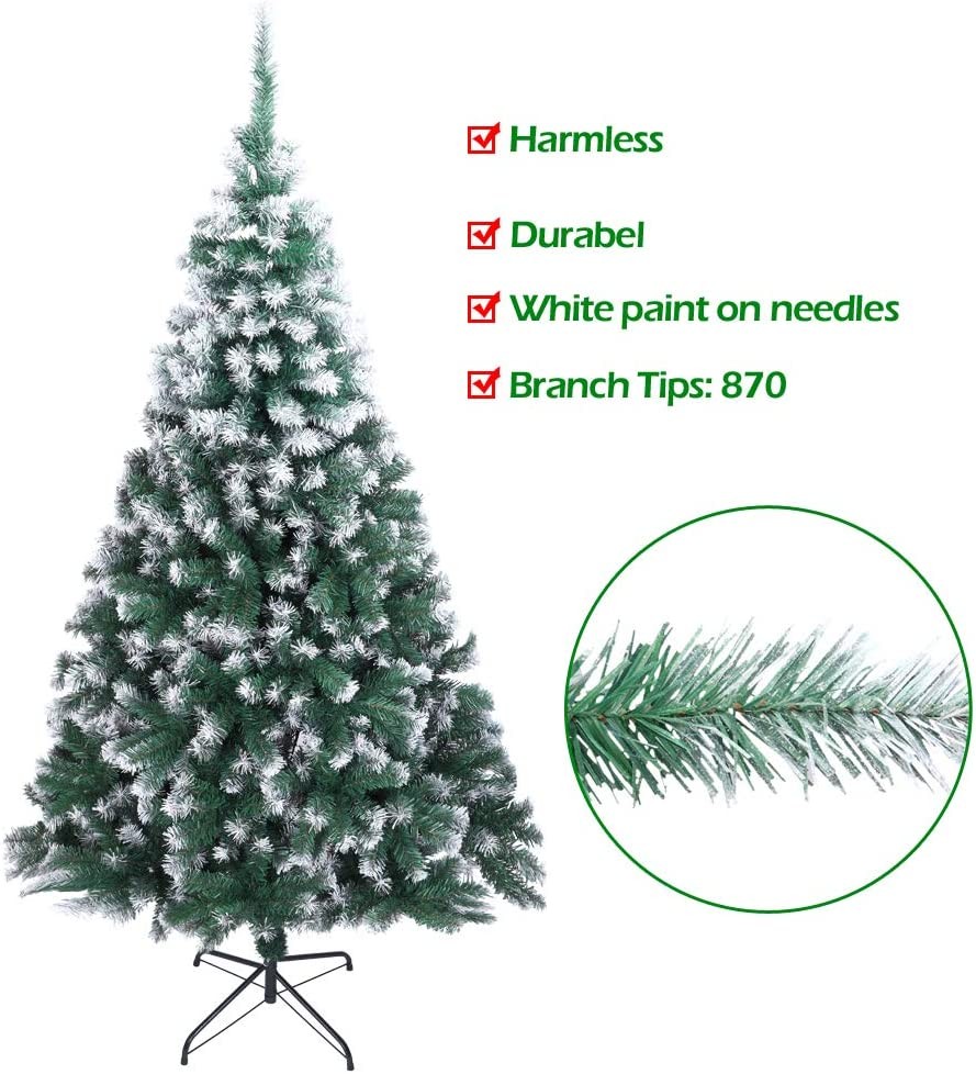 Easy setup: Main branches drops down in one second. To finish the assembly of this tree it requires only 3 steps, after putting branches and metal stand together, all the tree requires you to do is straighten out the branches Full height size: Our 6ft size not including top small tip height, actual height will taller than 7ft More tips: 870 branches are elaborated with to show the vivid tree Sturdy and realistic: Metal tree base with 3 screws provides stability to keep your tree standing more stable. The blades of Christmas tree are made from high quality PVC material, it shows more real and more nature Warranty 100%: We offer you prime satisfaction customer service to guarantee to let you buy with confidence