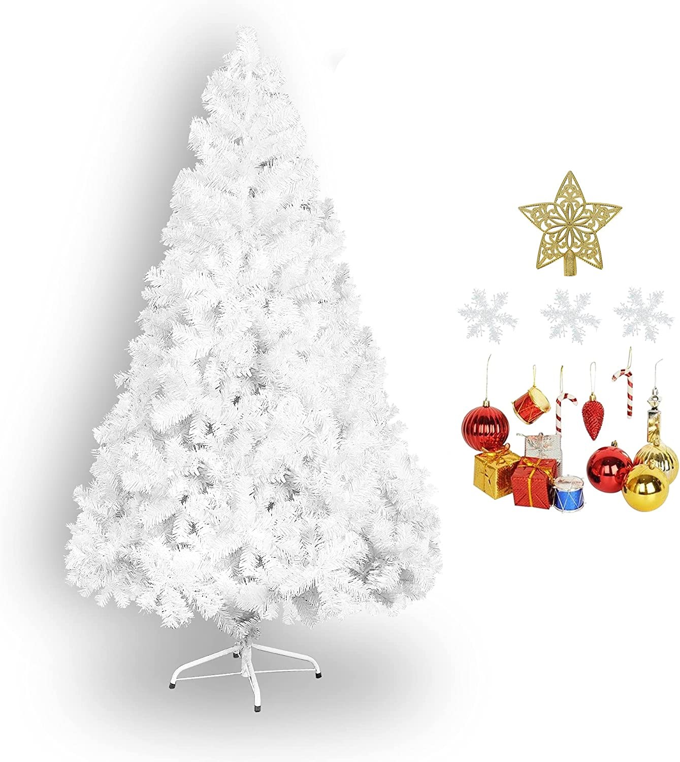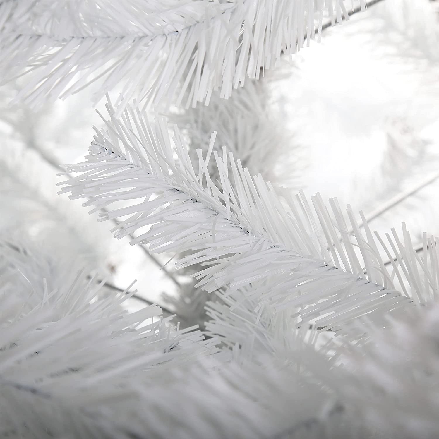 Crafted with 800 branches make the Christmas tree look lush, just like a real pine tree to show your spirit. Solid metal tree base for stronger support, anti- tilt or collapse Great for indoor or outdoor. Decorate your office, living room, garden or any entrance. The artificial Christmas Pine Tree made from PVC, it is safe, flame retardant and durable. Simple assembly and spend some time to get all the branches spread out.