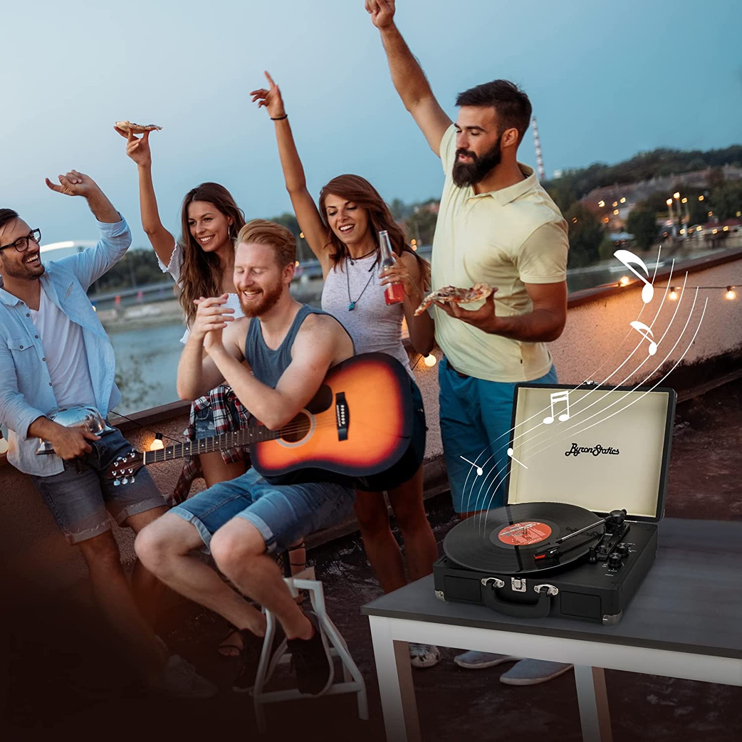 Record Player With Bluetooth 5.0 - Advanced 5.0 Bluetooth Technology, Byronstatics Record Player Have A Stronger Connection And Longer Distance, Fast And Stable Transmission Under Bluetooth Mode, Works Smoothly. Three Speed Turntable - Byronstatics Vinyl Record Player Allows To Play Lp'S In 33/45/78 Rpm, Play 7" 10" 12" Size Record, It Will Automatically Stop Playing Once It Reaches The End Of A Record Don'T Need To Worry About Wear And Tear Vinyls. Portable & Easy To Use: The Briefcase Design Makes The Little Record Player Great For Moving Around The House Or Traveling, The Lid Is Lined With Velvet Wooden, Make Sure Your Records Are Dust Free, Also It Comes With A Replacement Stylus. Built In Speaker & Rca Line Out- The Vinyl Record Player Is Built In Stereo Speakers, Provides You Good Sound With Excellent Bass, Also You Can Connect This Turntable With External Speakers By Rca Cable For Better Or Louder Sound, The Turntable Also Support 3.5Mm Aux-In Input For Single-Way Audio Device.
