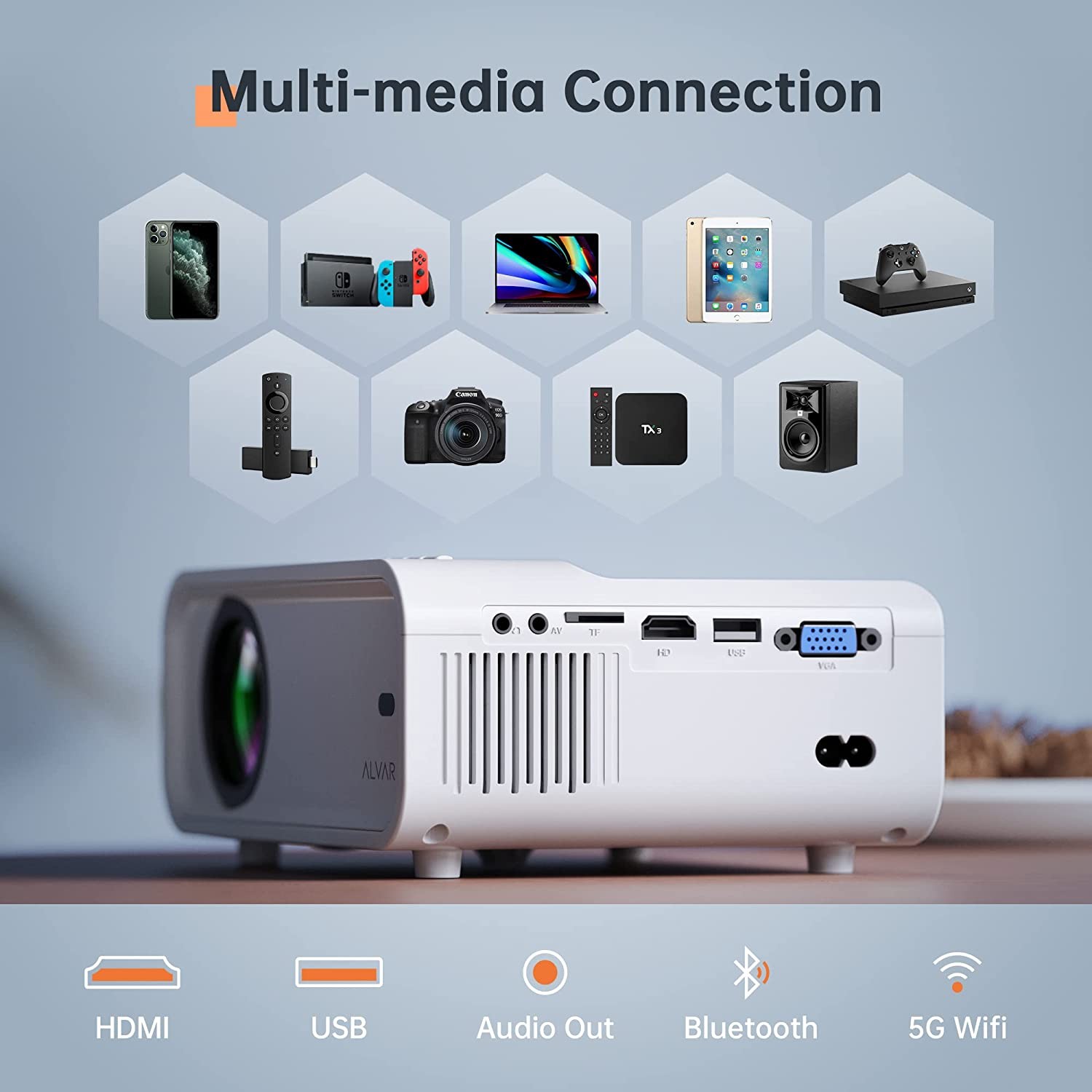 ? 【Tripod and Carrying Case Included】 ALVAR WiFi projector comes with a bag, which is easy to take out for parties and outings with your friends. Tripod also makes it easier to secure the projector in your home. It can be placed on any table and is very simple to install. The projector also has screw holes for mounting upside down on the roof.